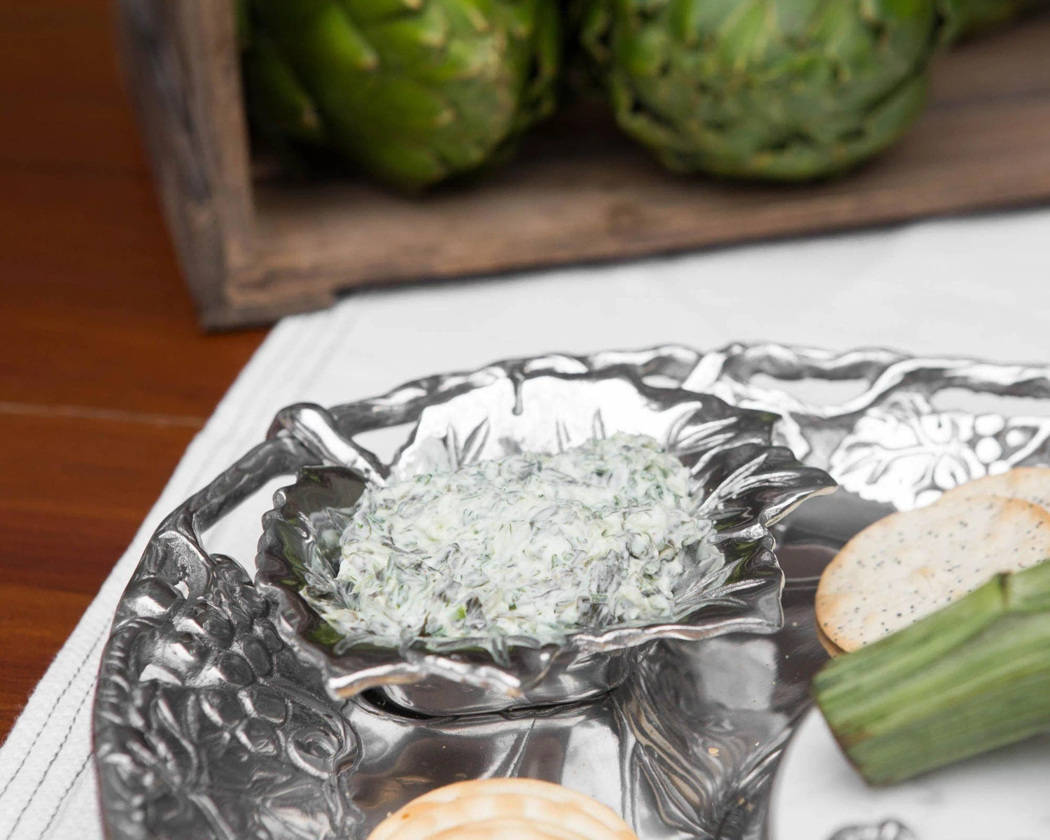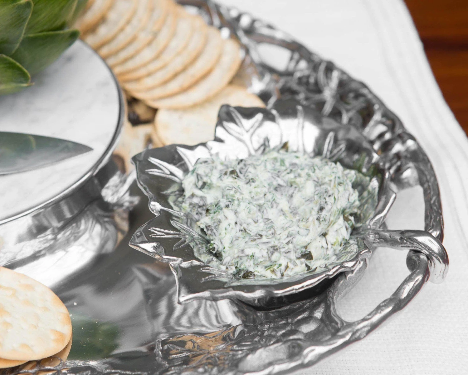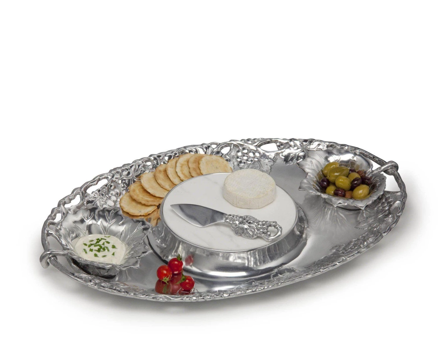 Along with the oval dish, this best-selling design includes a marble cutting area, two leaf-shaped bowls and a cheese knife. Arthur Court’s signature grape motif covers the knife’s handle and much of this handmade, aluminum tray, while the openwork border allows the bowls to attach easily on the sides.