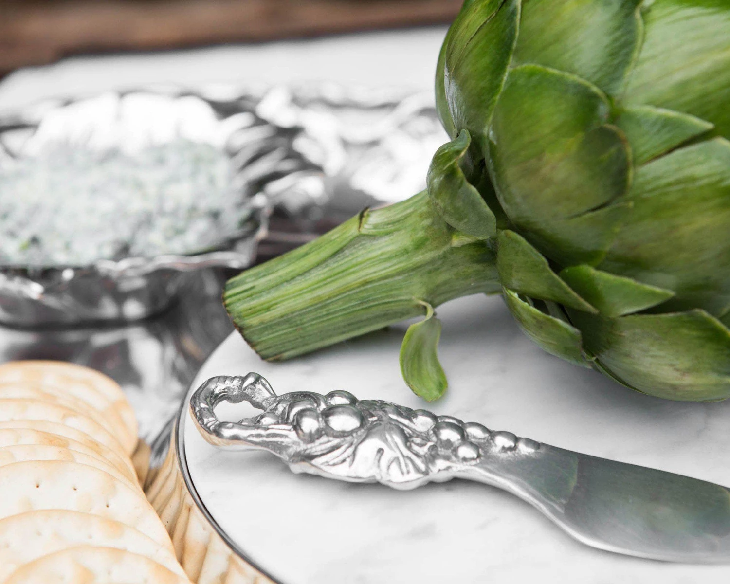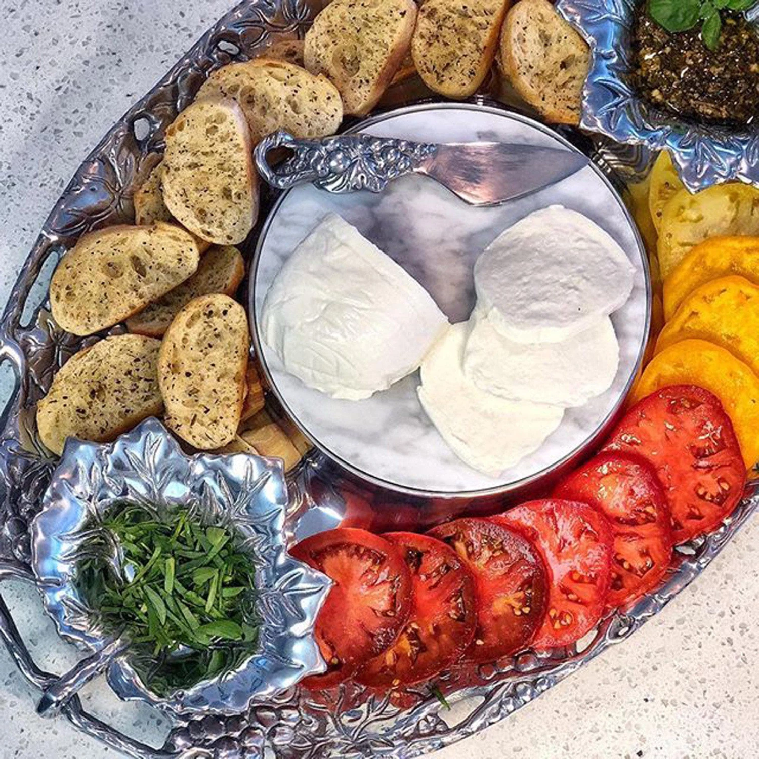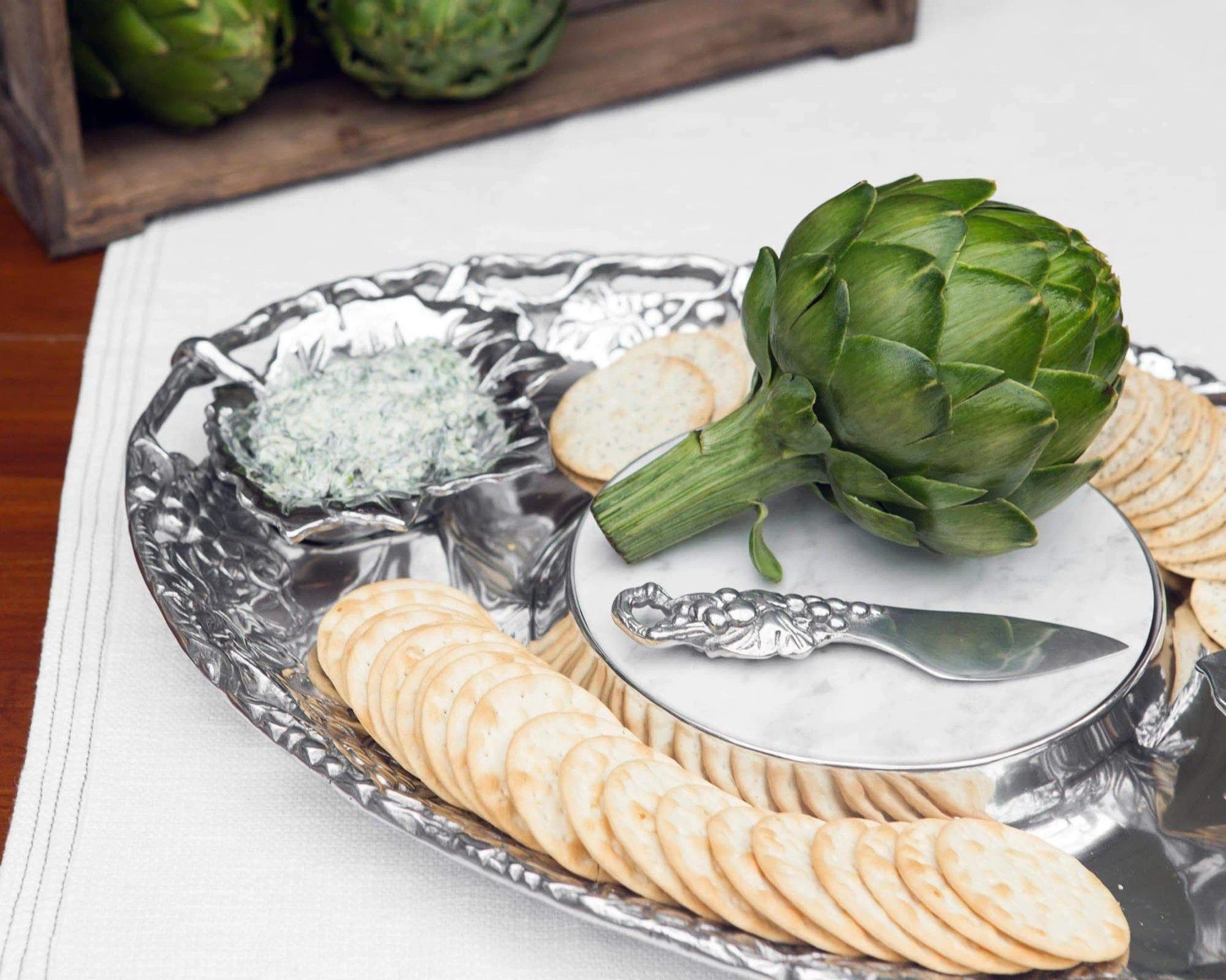 Along with the oval dish, this best-selling design includes a marble cutting area, two leaf-shaped bowls and a cheese knife. Arthur Court’s signature grape motif covers the knife’s handle and much of this handmade, aluminum tray, while the openwork border allows the bowls to attach easily on the sides.