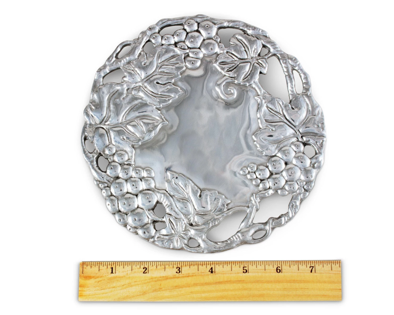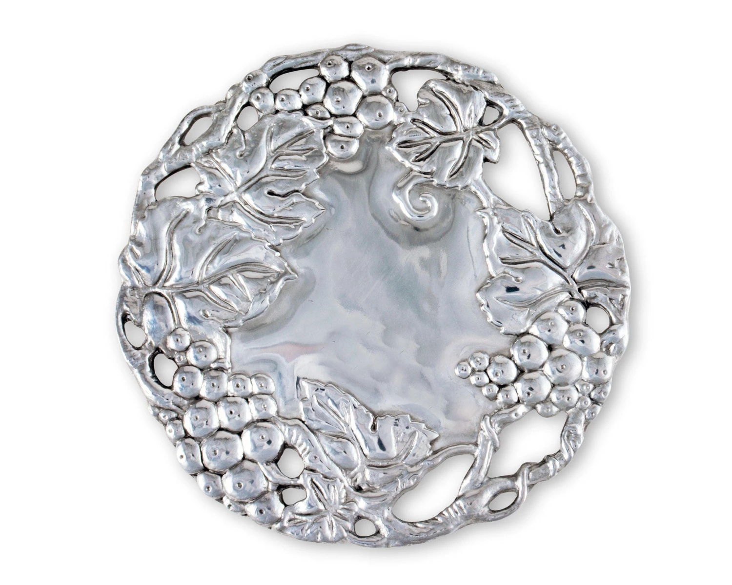 Twisting vines create an openwork border and link bundles of grapes and veiny leaves together throughout this handmade, aluminum dish. A small, unblemished section in the middle of this piece accentuates the realistic definition of the surrounding designs.
