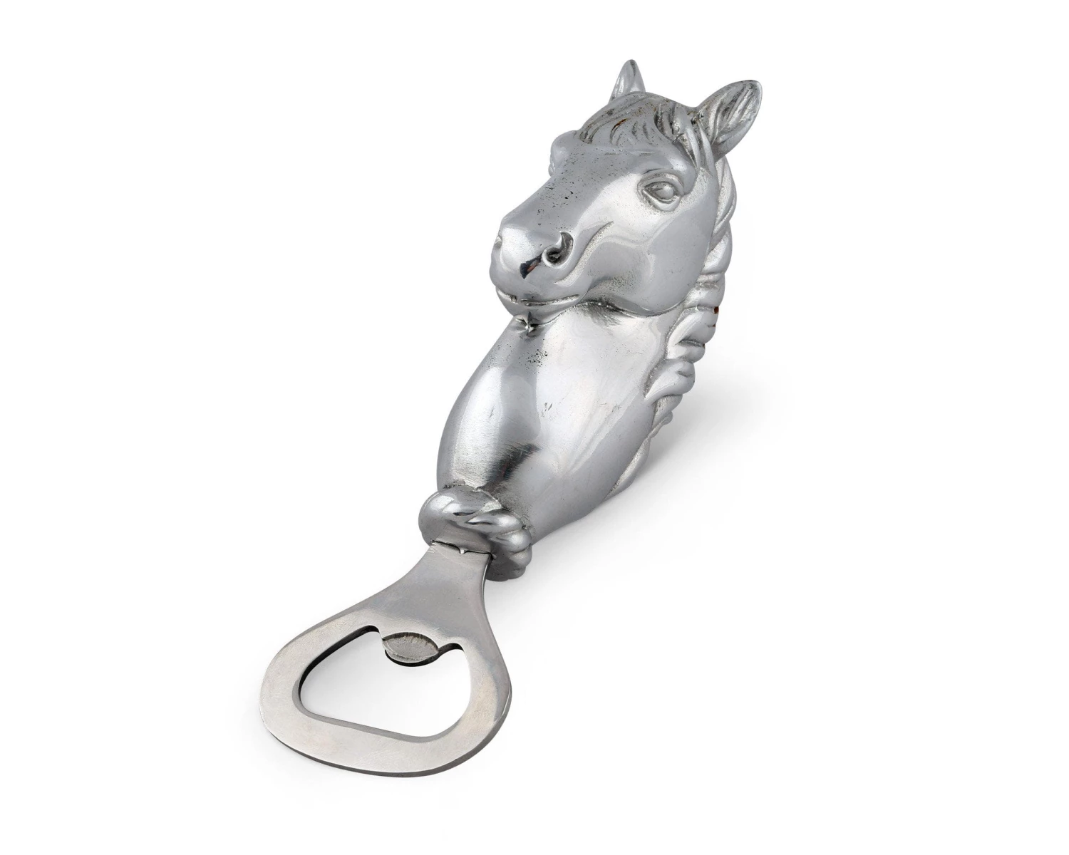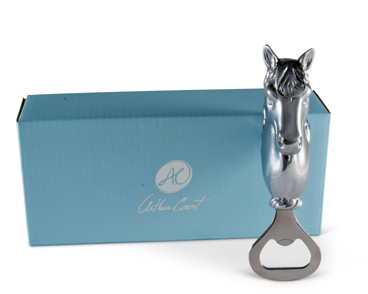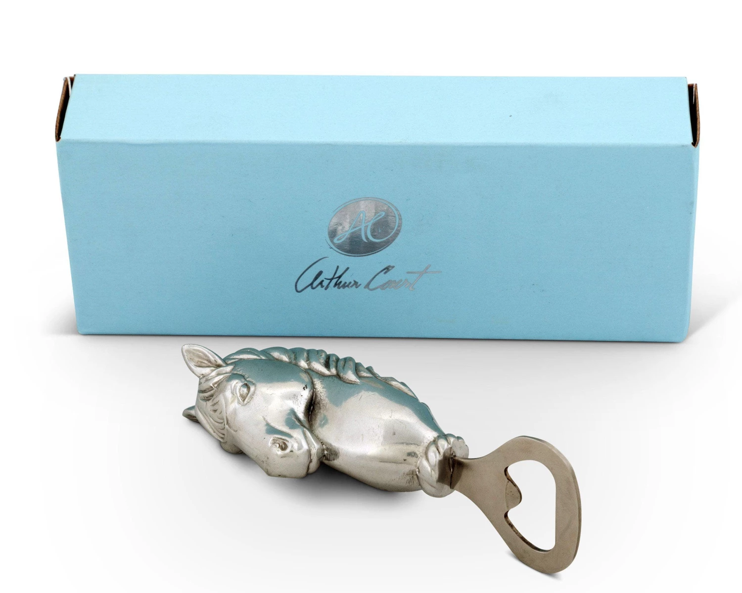 In the early days of American history, the horse eased the burden on families on cross-country adventures to new homes, and the wild open range still calls to our cultural memories. This horse bottle opener from Arthur Court commemorates those days at the same time that it provides a signature piece as noble and helpful as the equines of our ancestors. The aluminum alloy construction gives this elegant barware a silver sheen that doesn’t tarnish, and the sturdy opener puts real horsepower behind your efforts to access your favorite beverage. The textured mane and wide dimensions of this beautiful horse give you a firm grip during use. Whether your next adventure is poker night at the neighbors or a fancy shindig across town, tote this lightweight Arthur Court horse bottle opener along for the ride. At 2 x 6.5 inches, it’s easy to stable in a drawer or display in your home bar area.