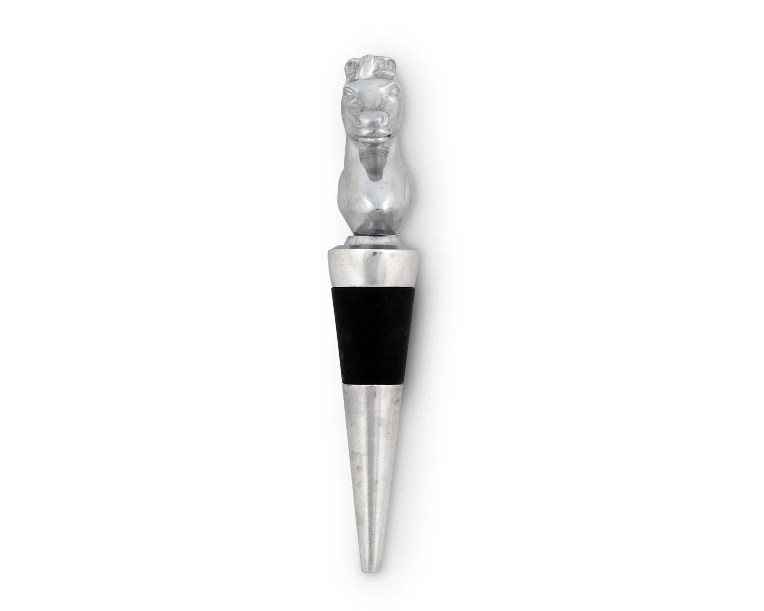 Turn every glass of wine into a special occasion when you stopper your bottles with this dramatic horse bottle stopper from Arthur Court. This elegant statuette comes in a gift box that makes it perfect as a hostess gift or special present for the equestrians and horse lovers in your life, and your friends will appreciate the substantial and high-quality feel when they hold it. Show it off among your crystal decanters and fine wine collection, trusting in the incredibly tight fit of the rubber gasket to protect your wine. The nobly shaped head of this stallion and its flowing, graceful mane are handcrafted in sand-cast aluminum, all the better to show off the realistic detailing of the design. Care for this handsome bottle stopper is easy, requiring only hand-washing and immediate drying.