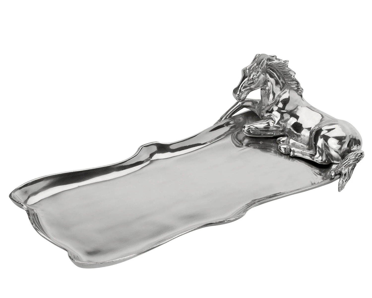 Take a break and enjoy the company of Arthur Court’s Horse Figural Oblong Tray. A stallion rests on one side of this piece as its flaming hair radiates a powerful energy across the dish. The rippled design of this handmade, aluminum tray mixes well with the muscular lines in the horse’s body.