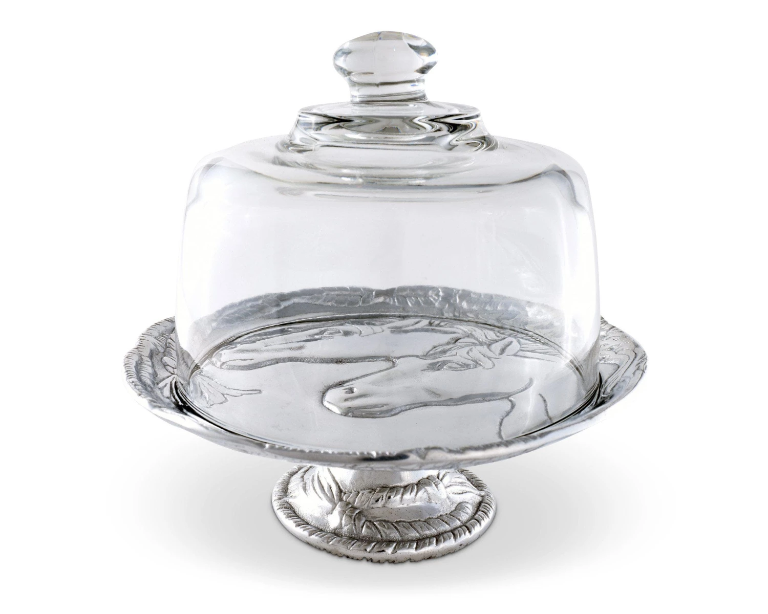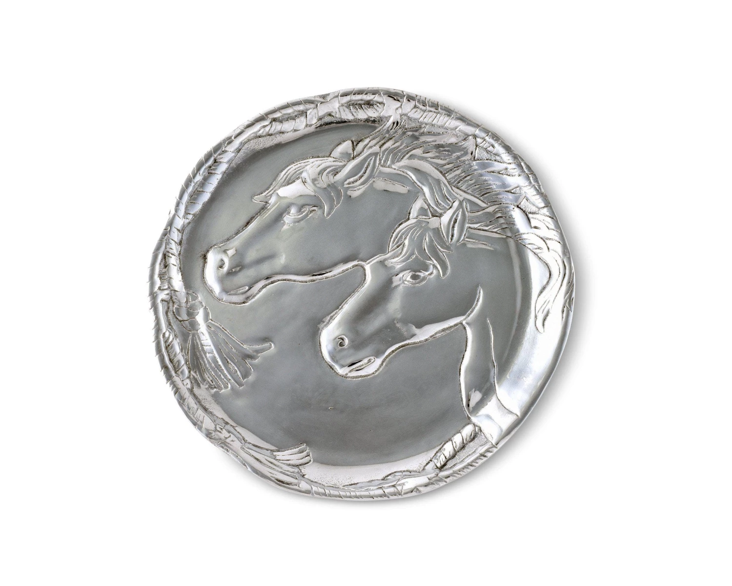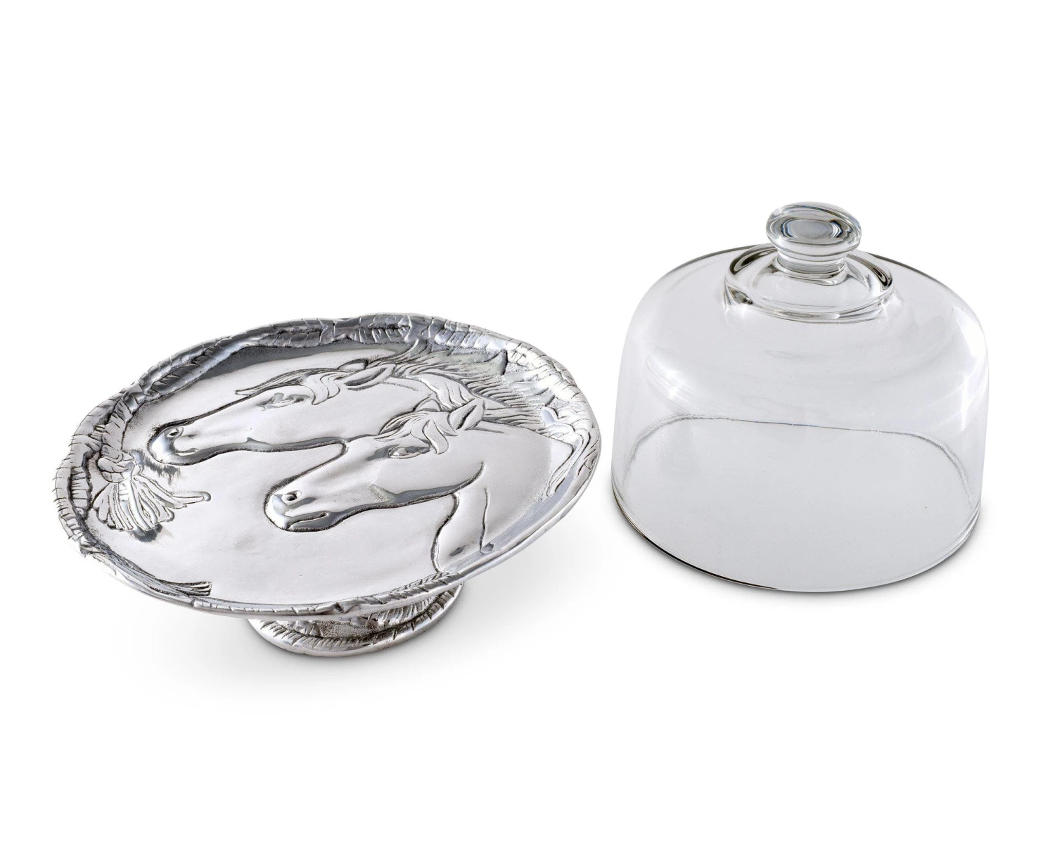 Add upscale appeal to equestrian-themed gatherings with this handmade horse serving plate with glass dome from Arthur Court. Made from FDA-compliant sand-cast aluminum, this food-safe plate boasts a sleek silver-tone finish that lends timeless beauty to virtually any room and a durable build that lasts the long haul. Indented ropes around the circular base offer visual interest to the design, while the raised stallion duo on the plate itself brings delightful texture to your buffet or coffee table. The clear glass dome lets guests take a peek at the treats inside before lifting it via its comfortably rounded handle, keeping your appetizers or sweets fresh and tasty throughout your gathering. Hand wash the metal plate with mild dish soap and dry it immediately for after-party care, and pop the glass dome in the dishwasher for fuss-free cleaning. This 8 x 8-inch glass-domed plate comes gift boxed for a nice housewarming present for your favorite horse enthusiast.