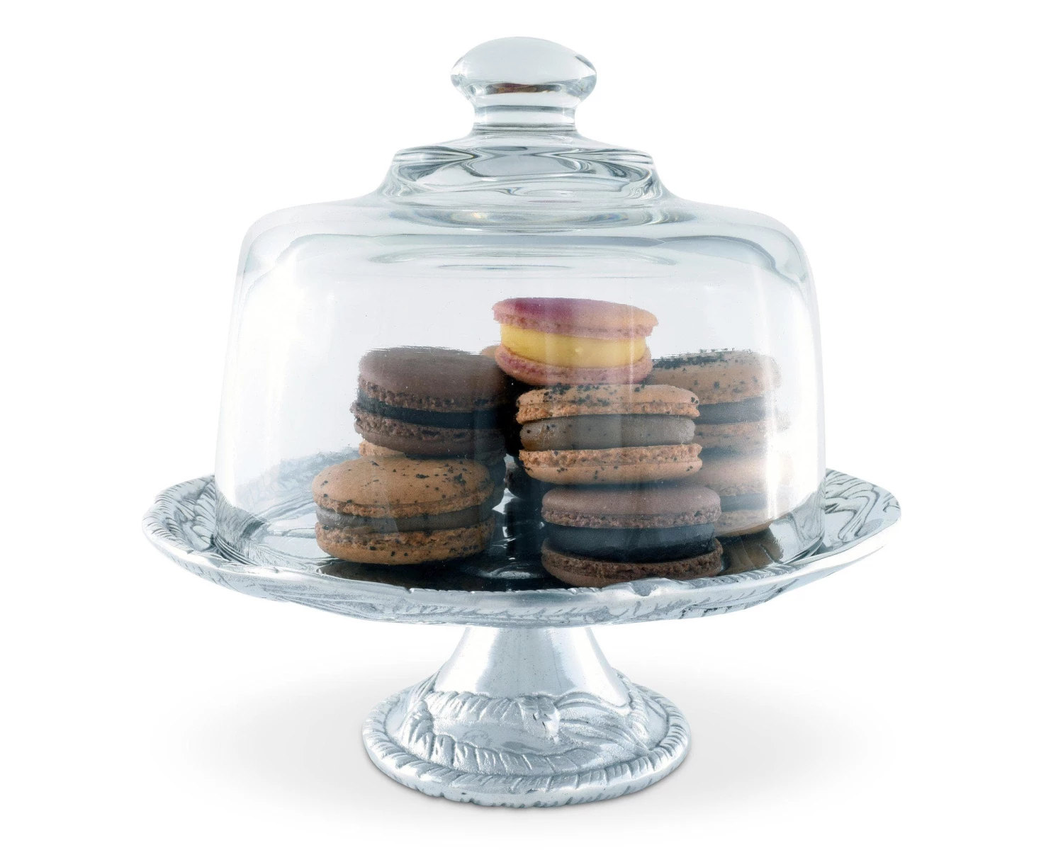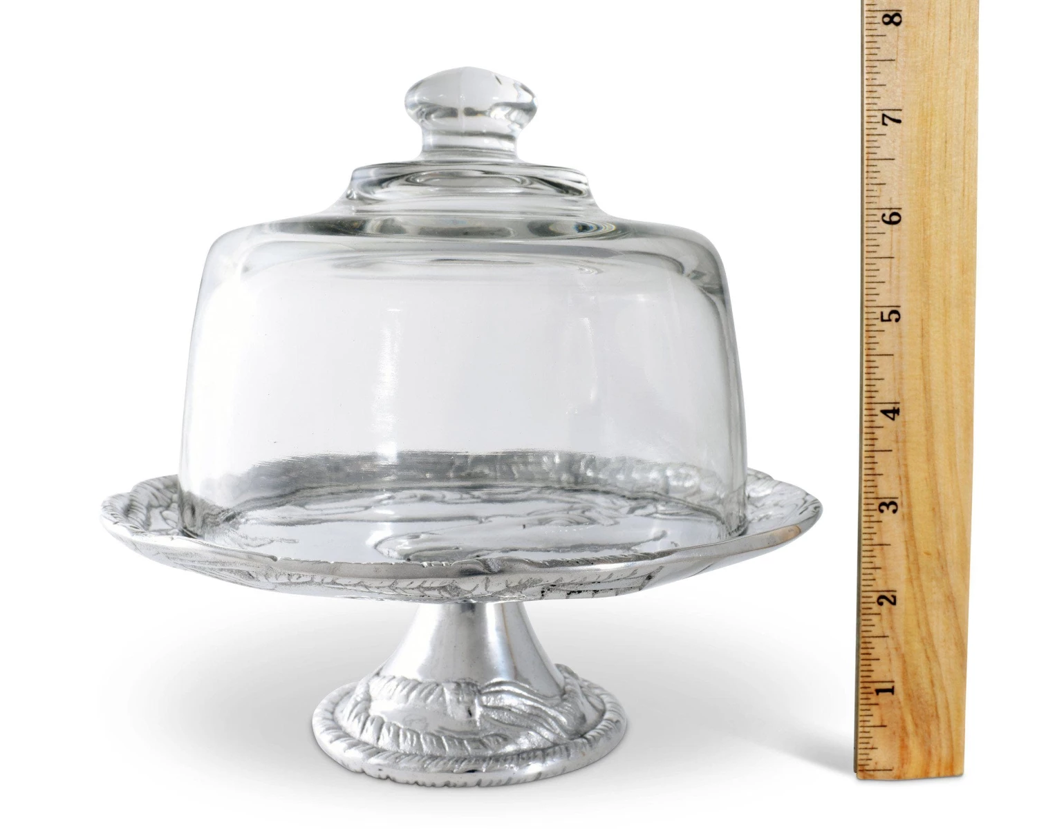 Care: Wash aluminum by hand with mild dish soap and dry immediately. Glass dome is dishwasher safe.