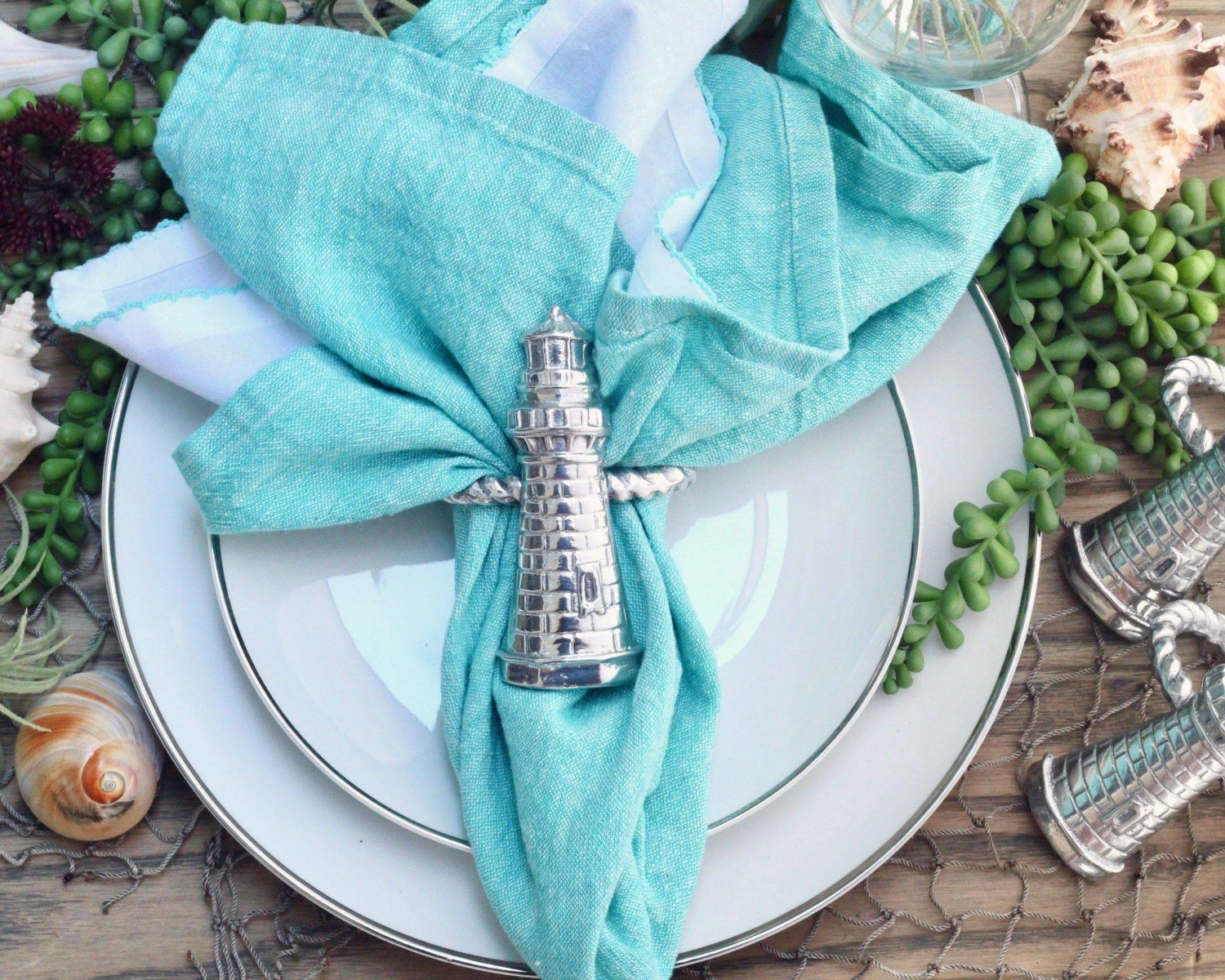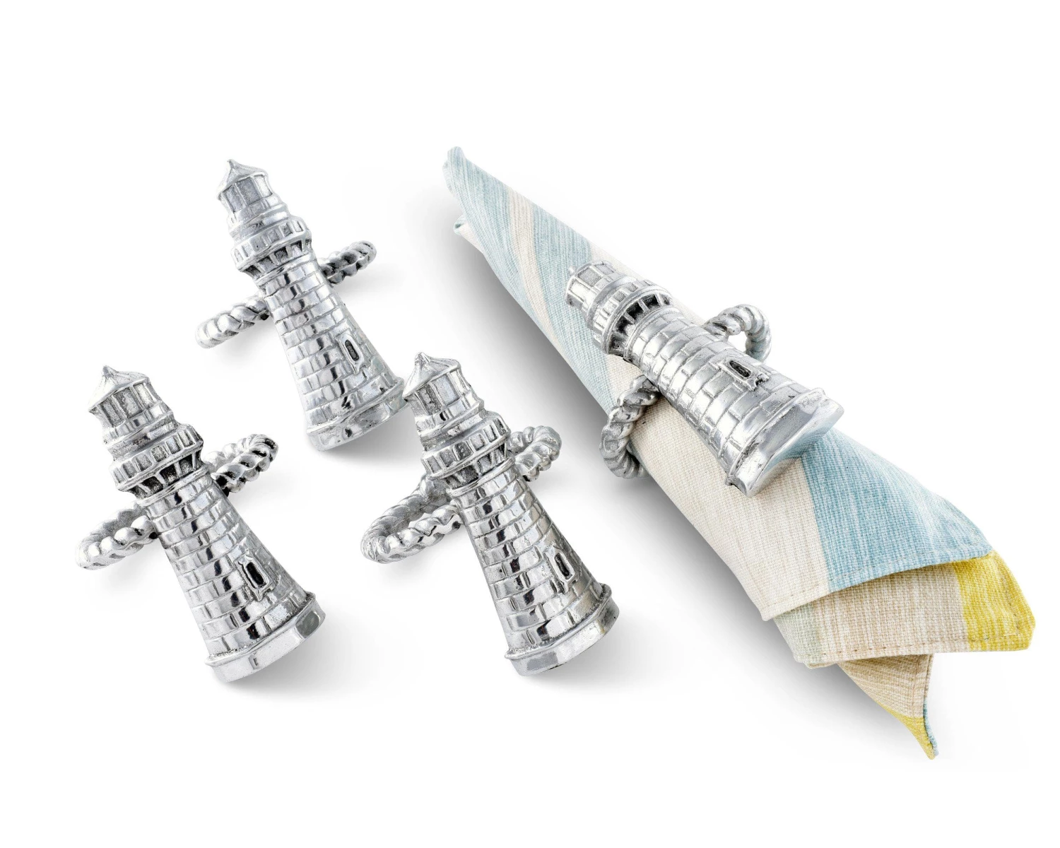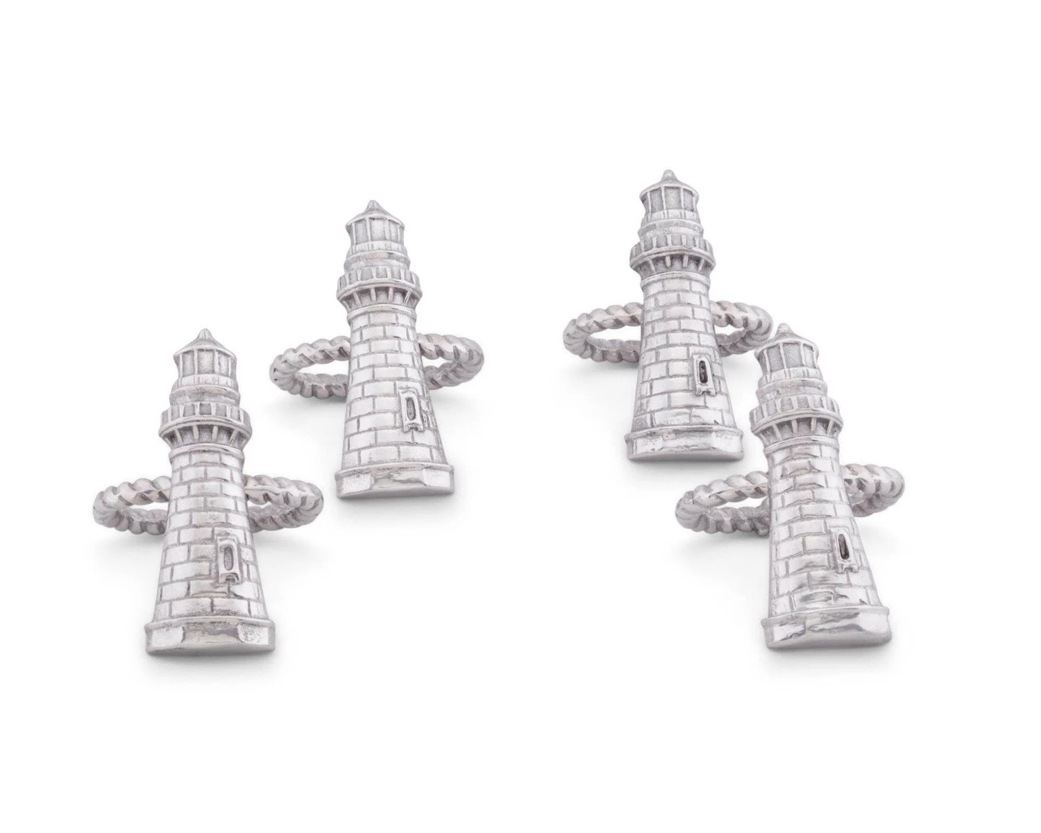 Create a feeling of coastal calm as you dress your table with Arthur Court’s Set of 4 signature aluminum alloy Lighthouse Napkin Rings.