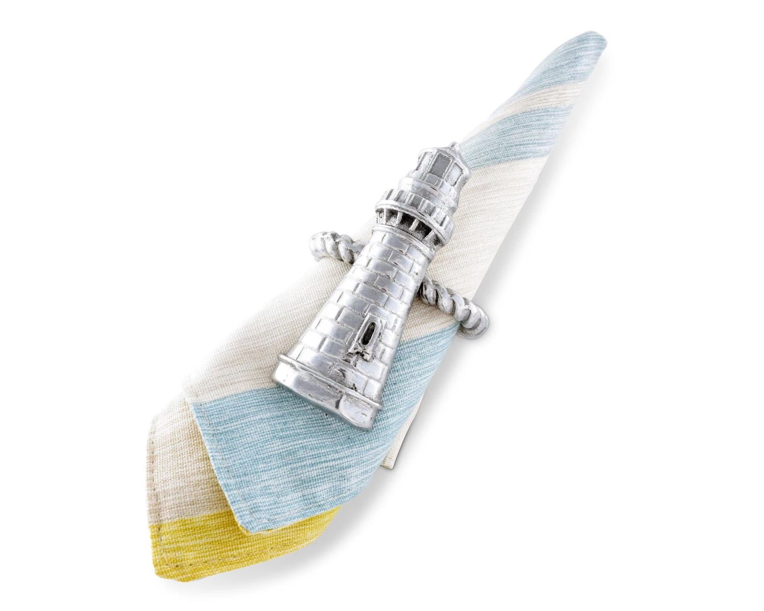 A carefully detailed figural Lighthouse sits atop a ring cast to look like marine rope. Hand-crafted lighthouse napkin rings are a great addition to your collection, they create just the right atmosphere for a seafood feast, adding a romantic hint of sea faring tales of yore.