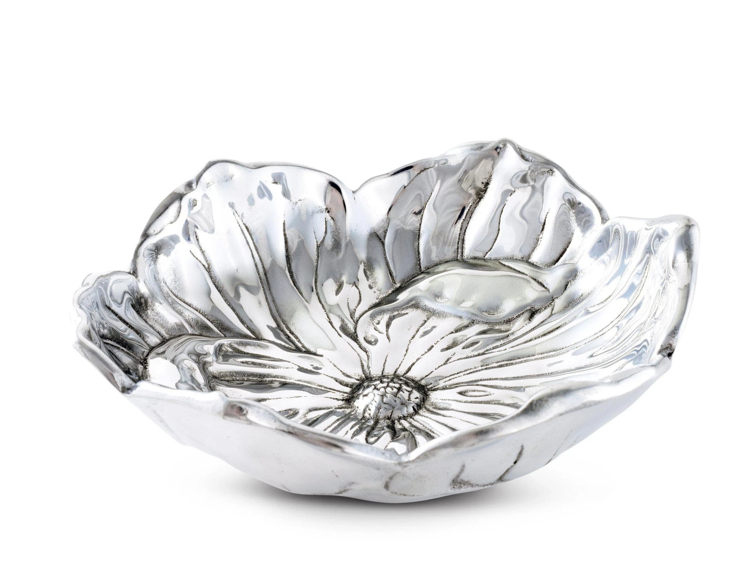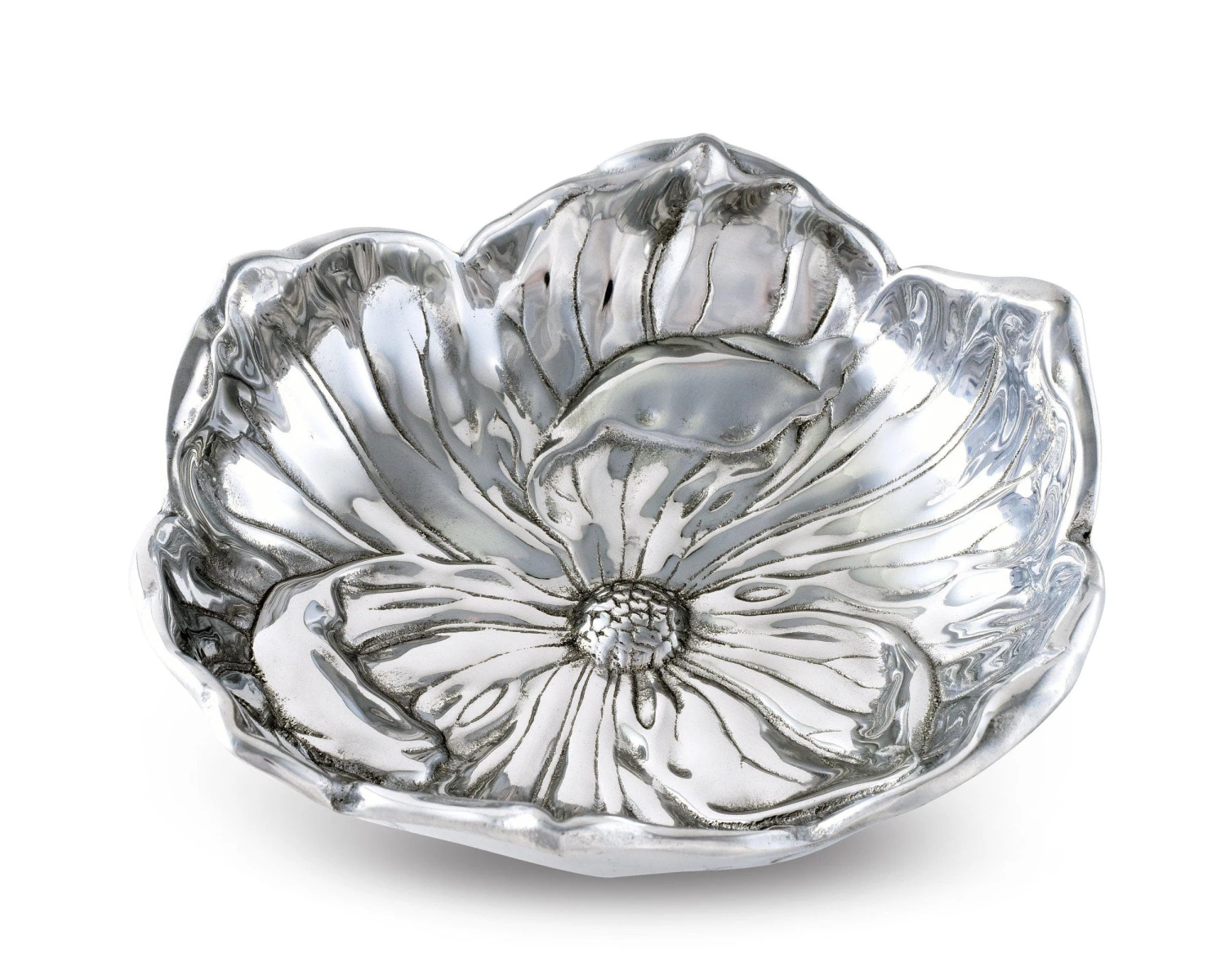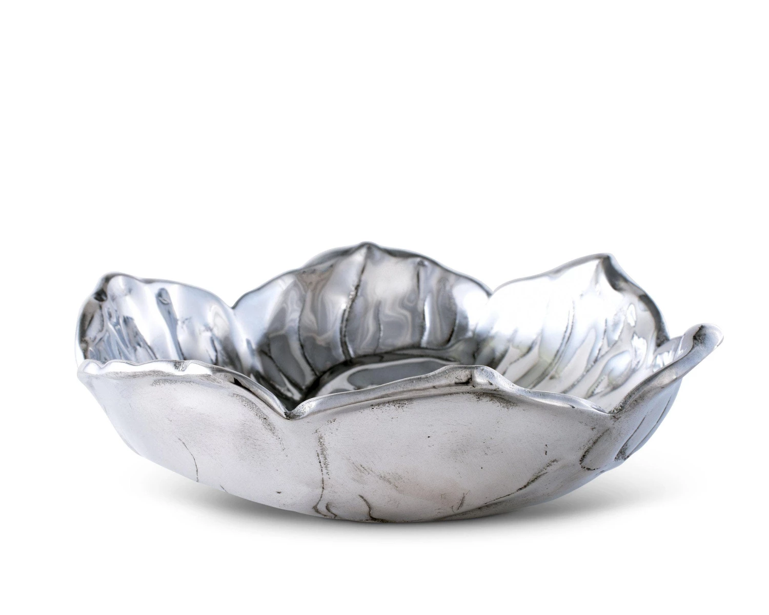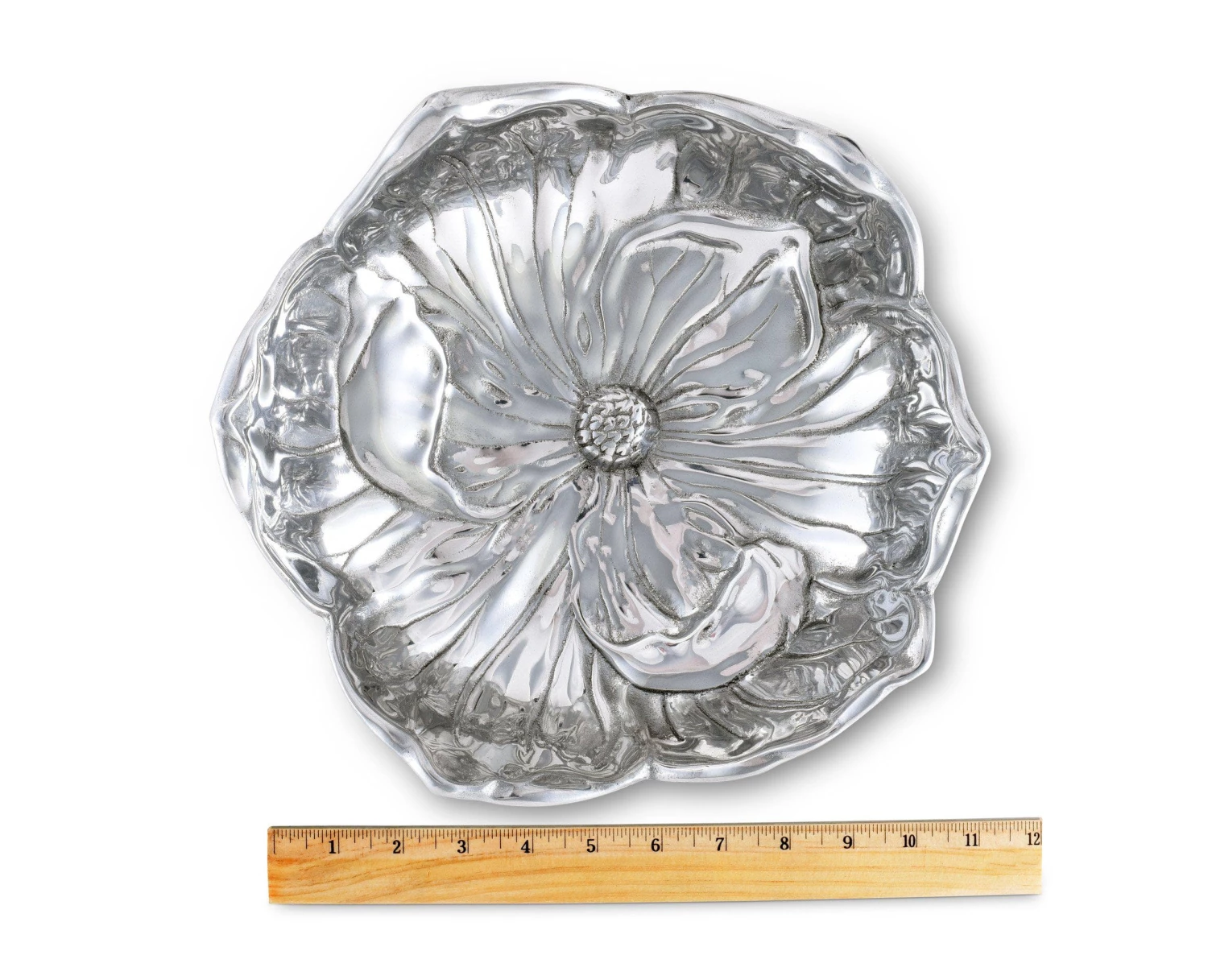 A single magnolia lends its shape to this piece as the edges reflect the flower’s arching pattern of petals. Heavy lines extend in all directions from the centralized carpels to give this handmade, aluminum bowl incredible texture and depth.