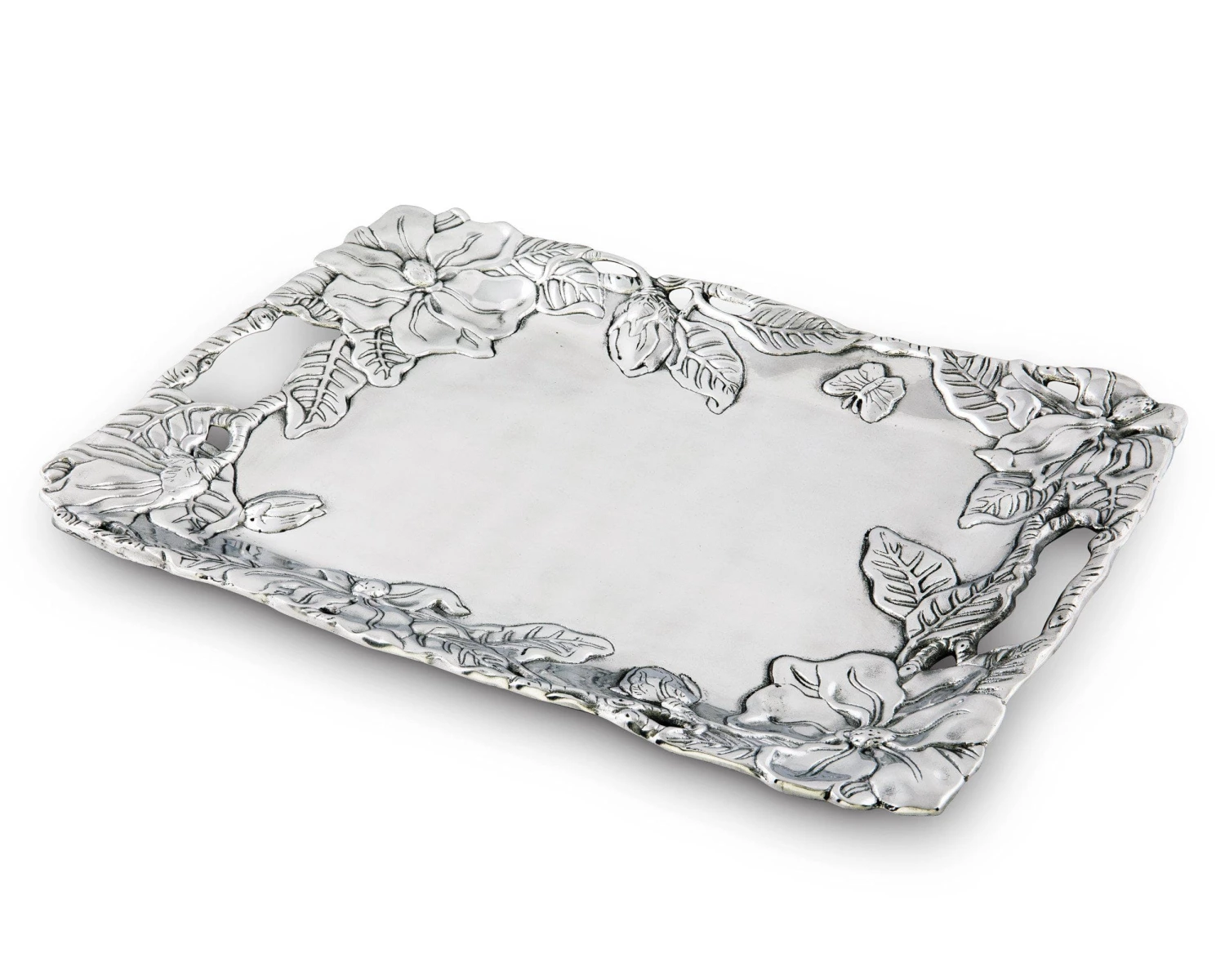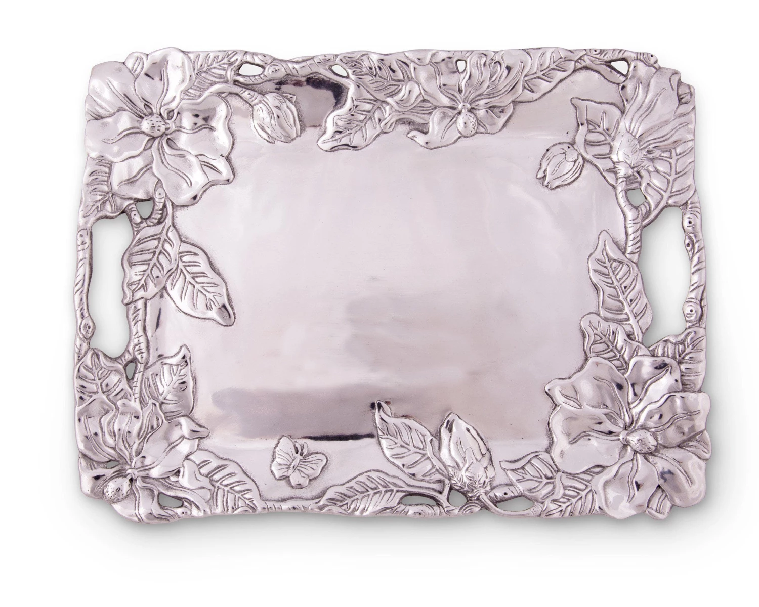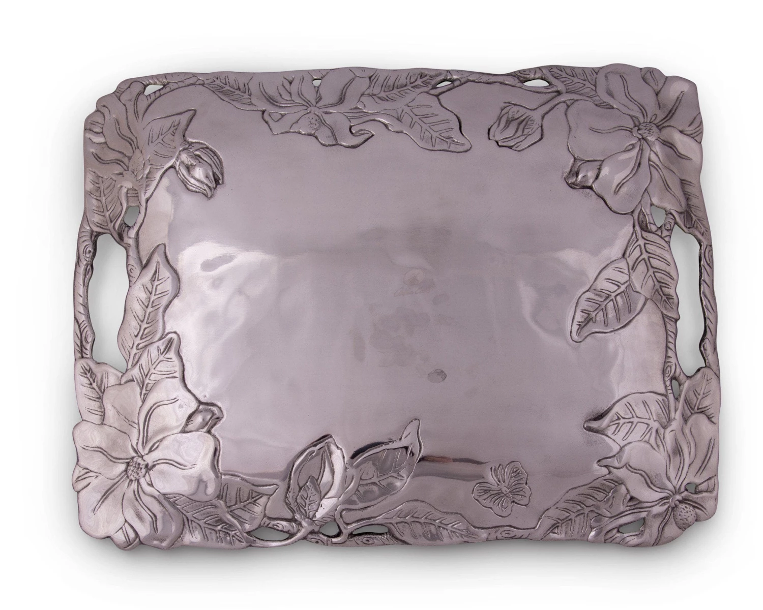 Proudly offer party food choices on this dazzling magnolia clutch tray from Arthur Court. The large platter, which measures 18.5 x 13.75 inches, accommodates multiple items and has many practical and decorative uses. The handled tray can tote meals from kitchen to table, display jewelry on your bedroom dresser or act as a dazzling centerpiece on a dining table, with or without a vase of flowers sitting atop it. The outer perimeters of the clutch tray are adorned with twisting, leafy branches and blooming magnolias that are handcrafted from sturdy aluminum alloy and constructed in compliance with FDA regulations. Chill the tray in the refrigerator or freezer before serving cold hors d’oeuvres, or place it in a 350-degree oven to keep food items warm before guests arrive. This impressive clutch tray comes packaged in a gift box, making it a perfect ready-to-give present for hosts, weddings or bridal showers.