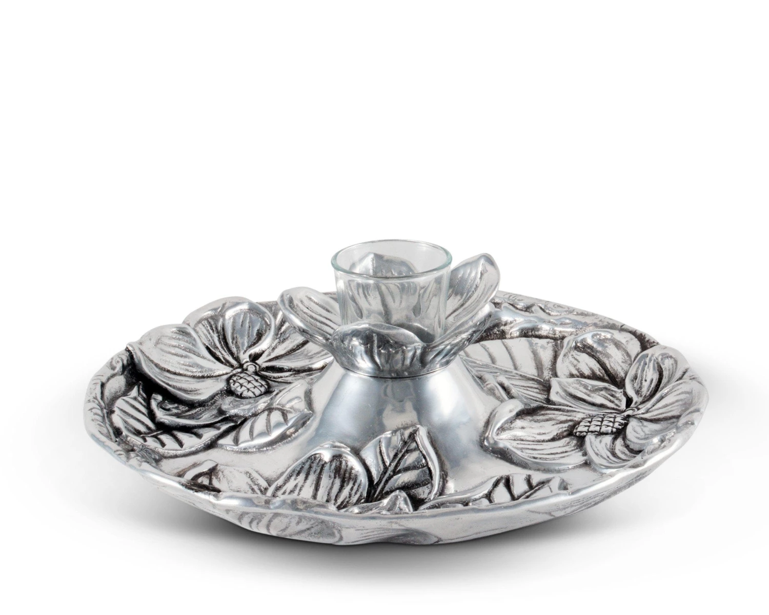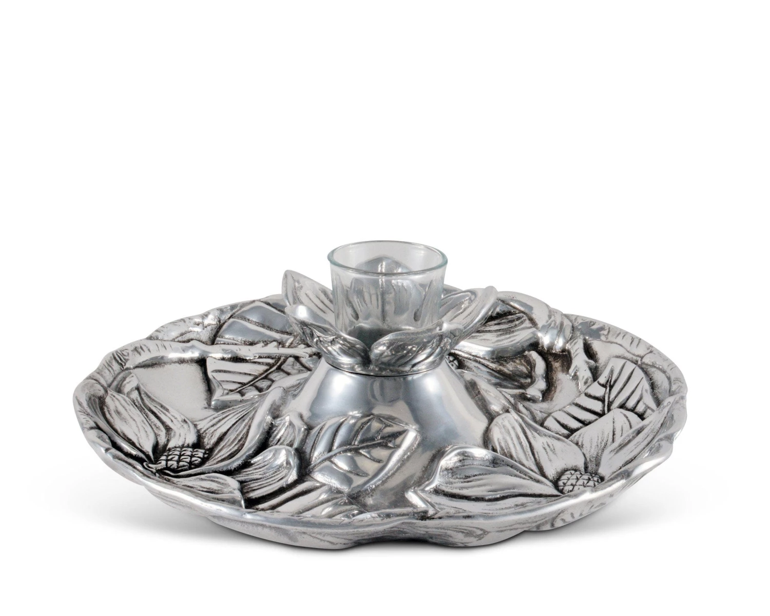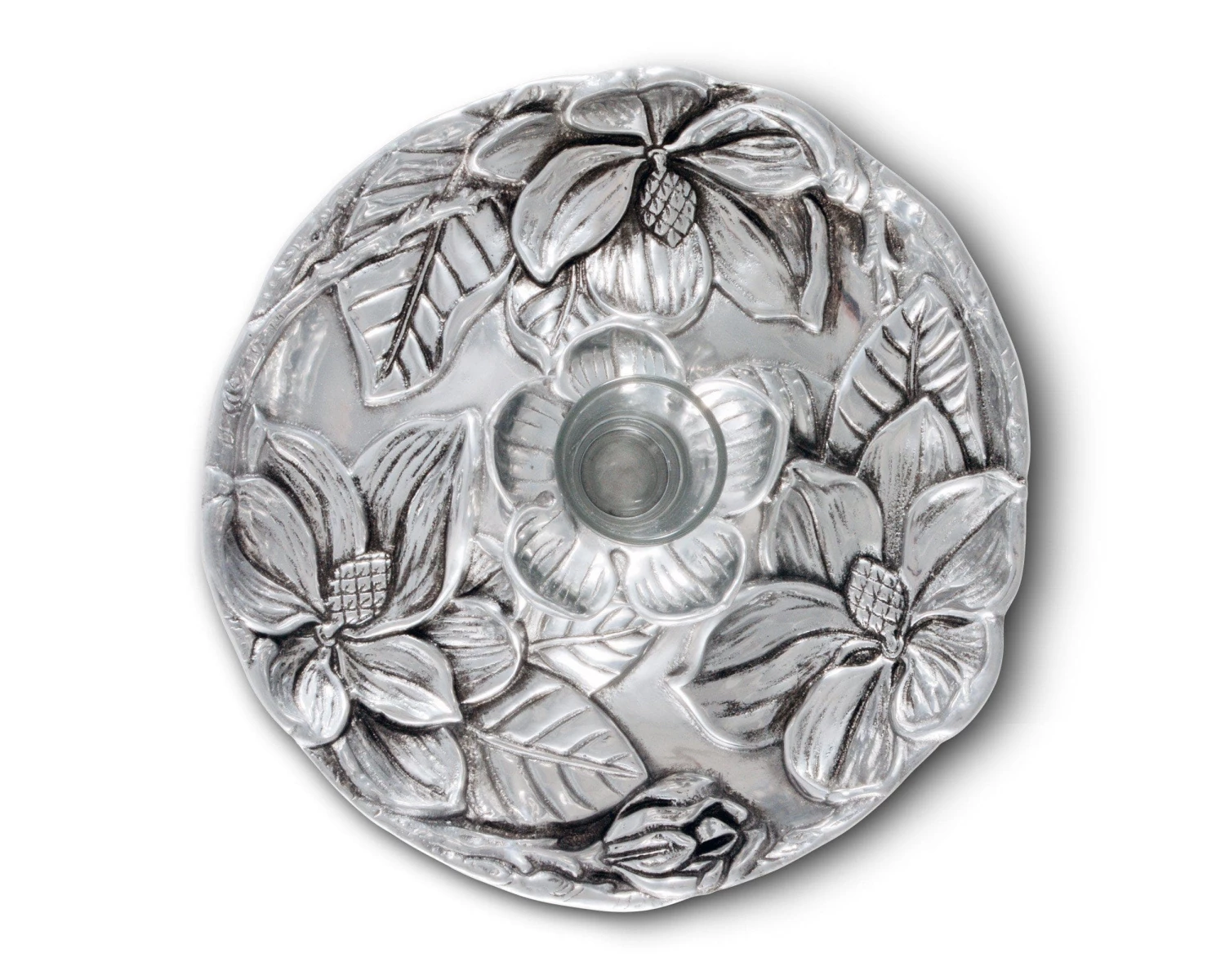 Round coupe tray with designed edges features a bas-relief design of marvelous magnolias and leaves. Known as the flower of the South in the United States, magnolias are known as a symbol of hospitality, purity and honor around the world. Featuring a raised votive-sized glass holder emerging from a center bloom, this tray is a stunning way to serve an assortment of crudités, nuts, olives or any tidbit collection. The glass holder in the middle will hold picks, hors d’oeuvres forks or even a tealight candle.