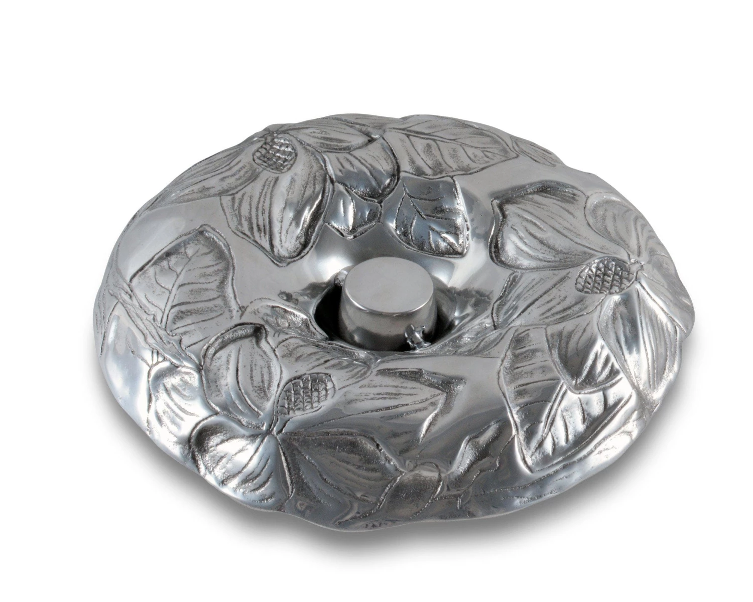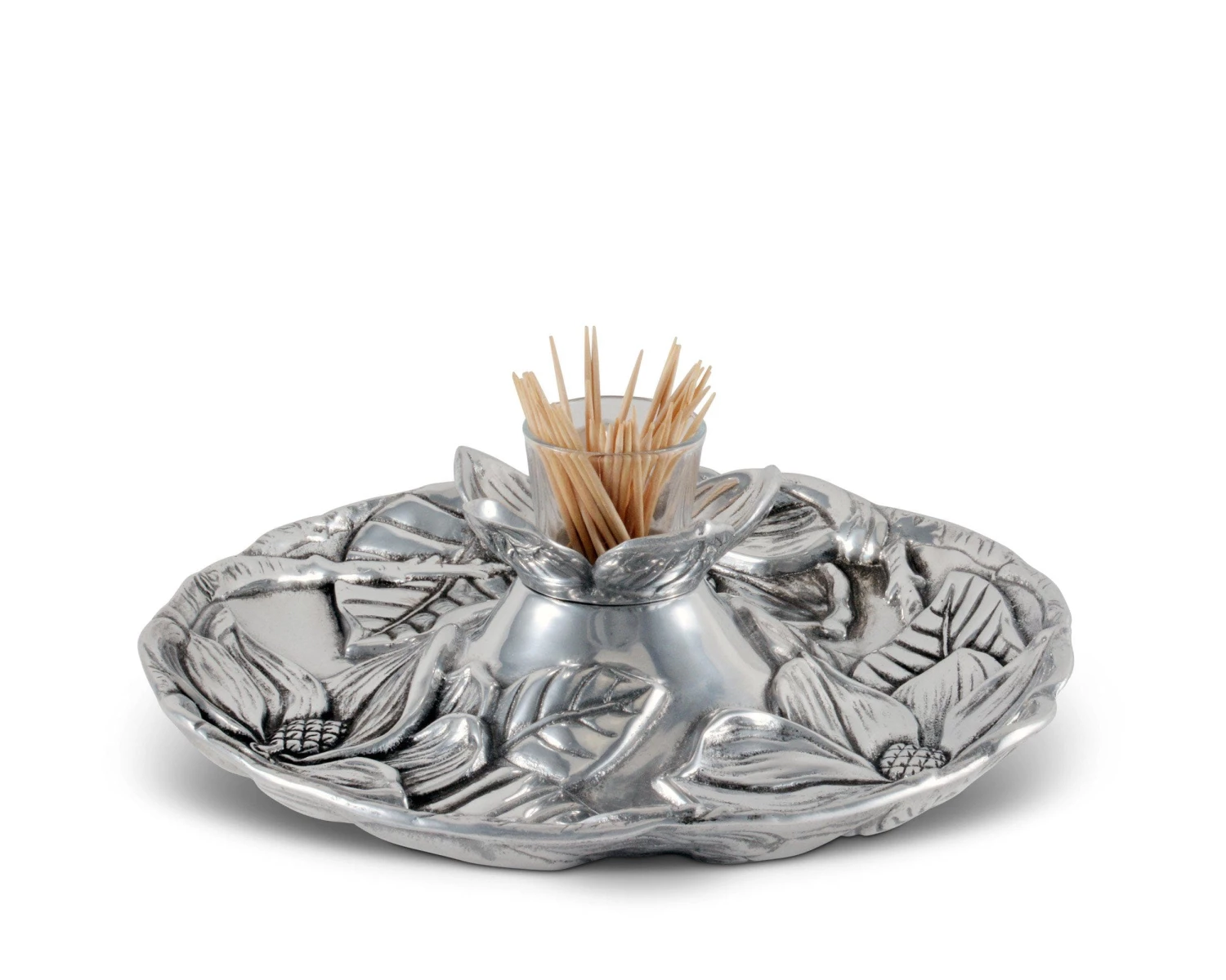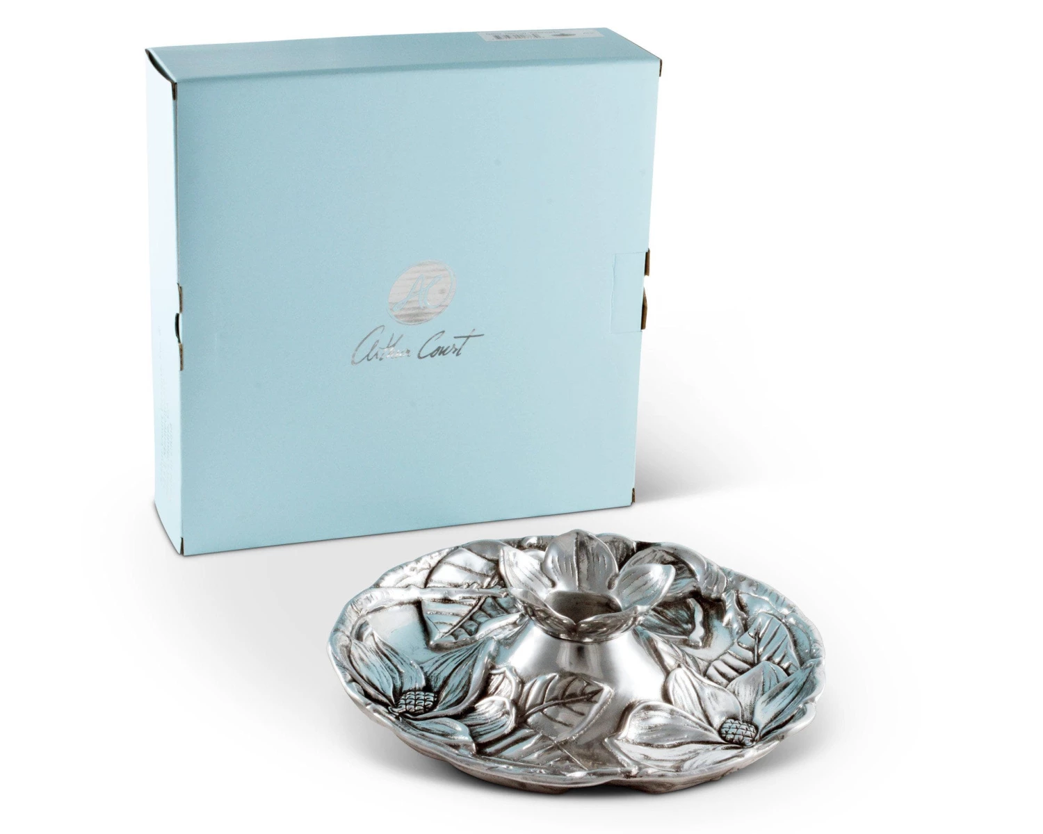 Round coupe tray with designed edges features a bas-relief design of marvelous magnolias and leaves. Known as the flower of the South in the United States, magnolias are known as a symbol of hospitality, purity and honor around the world. Featuring a raised votive-sized glass holder emerging from a center bloom, this tray is a stunning way to serve an assortment of crudités, nuts, olives or any tidbit collection. The glass holder in the middle will hold picks, hors d’oeuvres forks or even a tealight candle.
