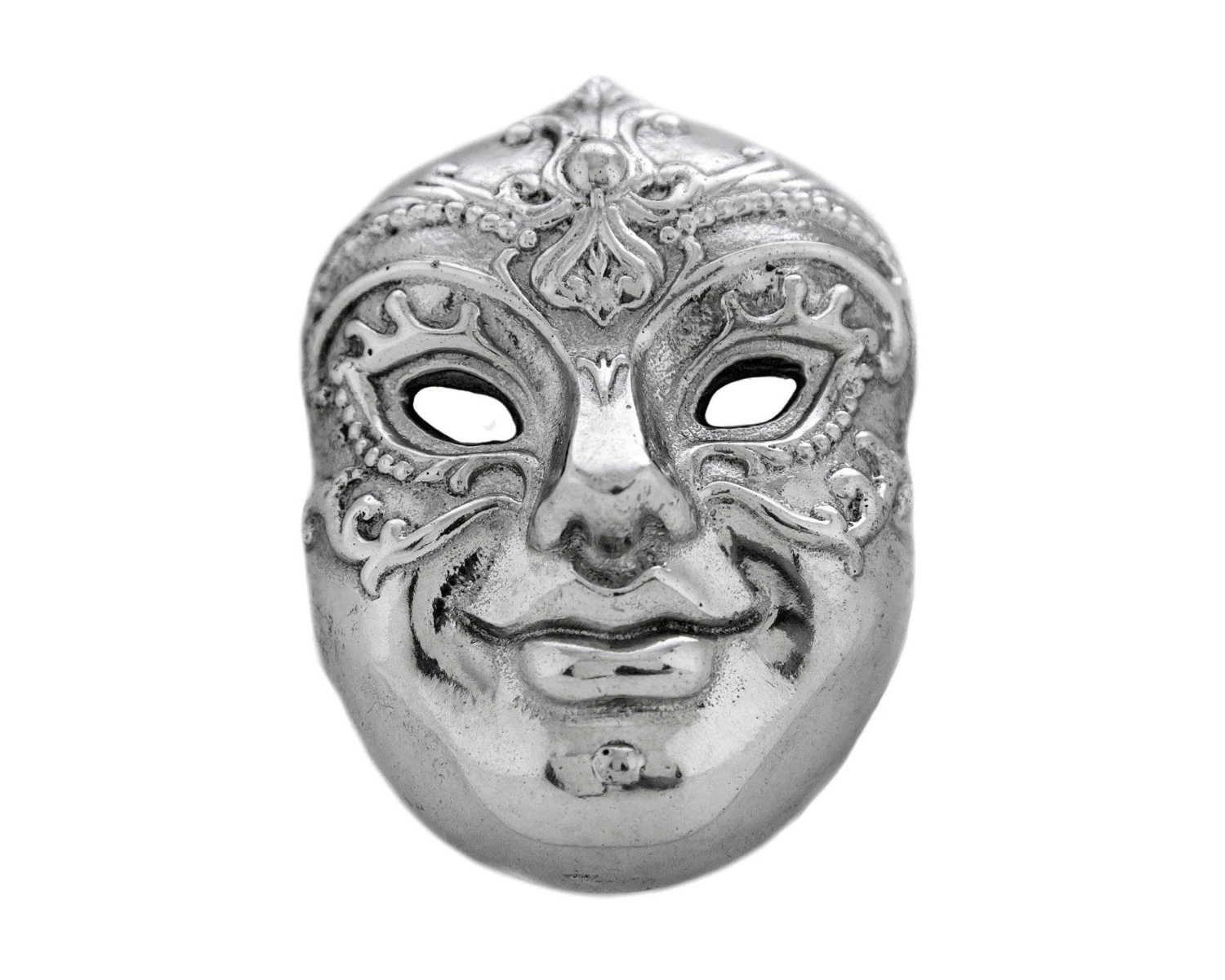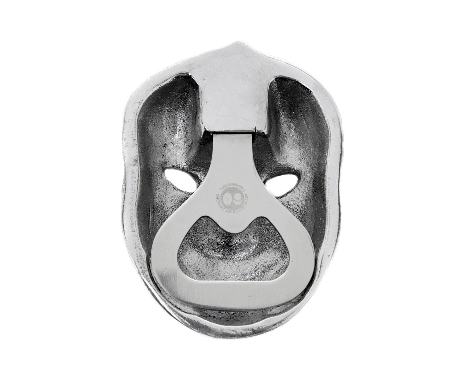 This handmade, aluminum piece features a beaded mask covering the face of a mysterious individual. Detailed flourishes accent a fleur-de-lis symbol in the center of the forehead, while the opener itself is hidden on the backside of this decorative design.