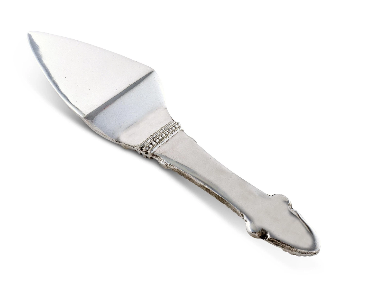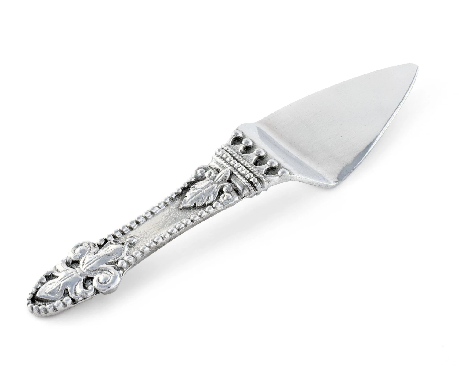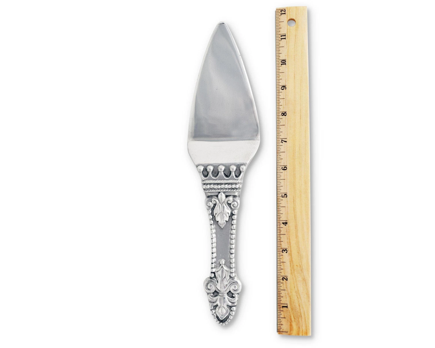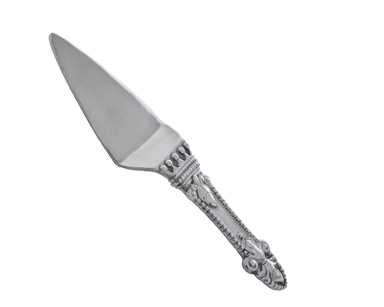 Fleur-de-lis symbols rest on opposite ends of the piece’s beaded handle, while a five-pointed crown adorns the neck. The raised texture of these designs contrasts nicely with the handmade, aluminum server’s smooth head.