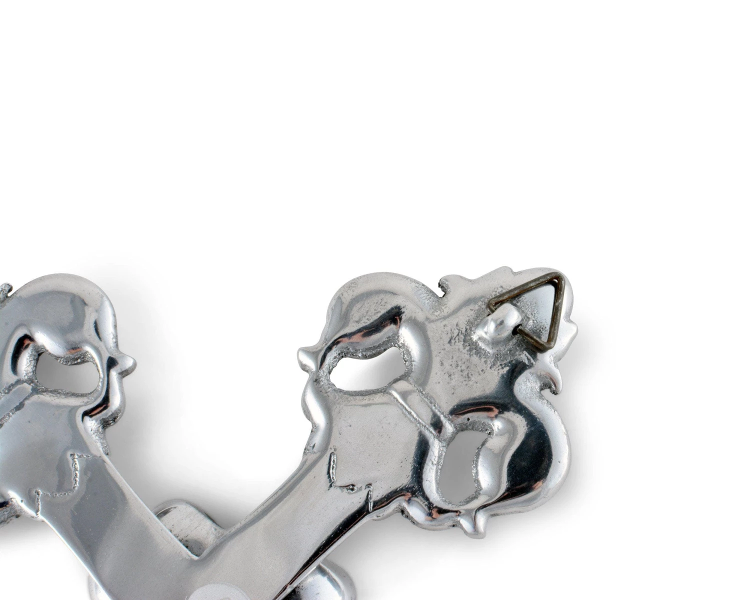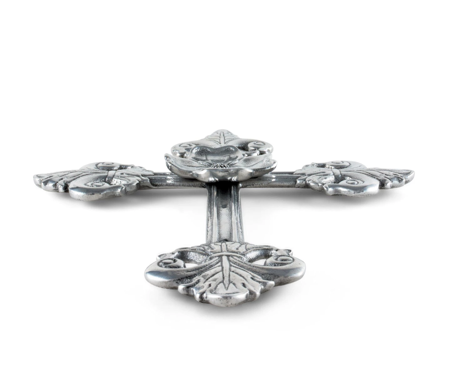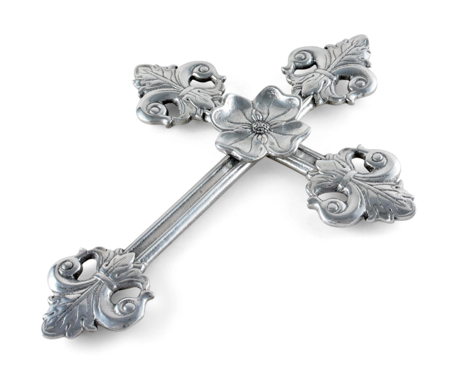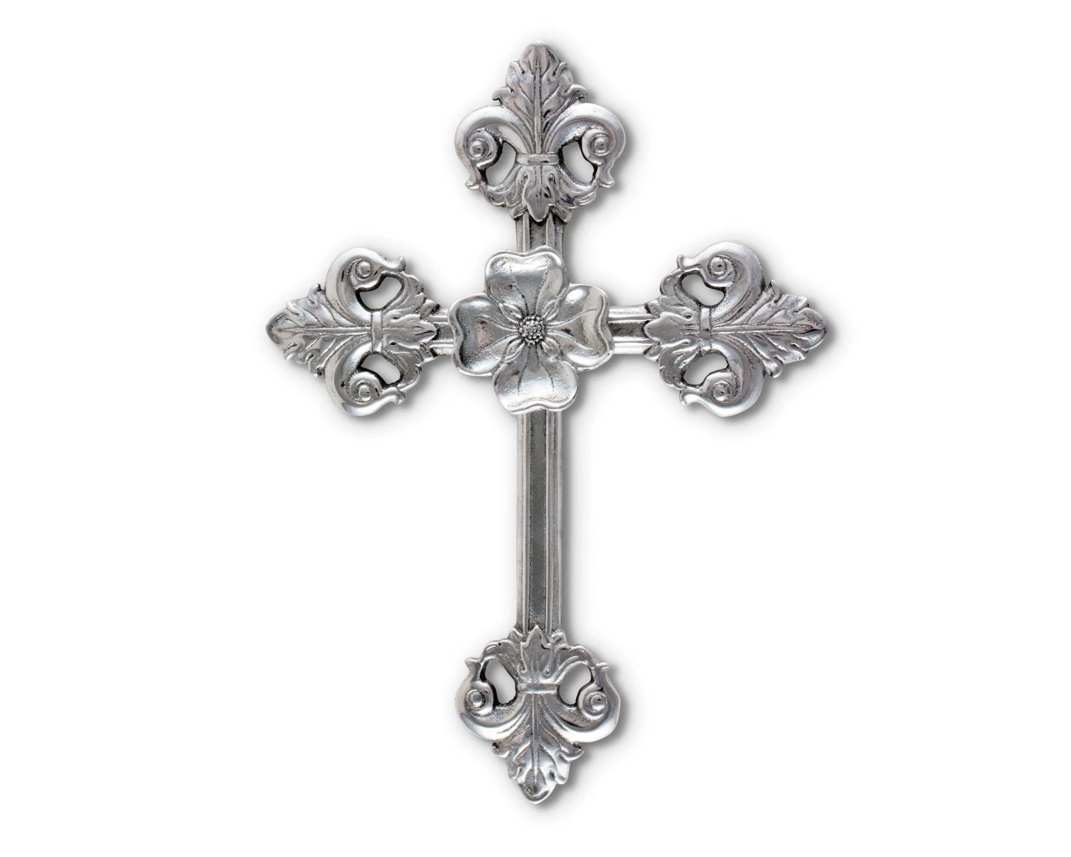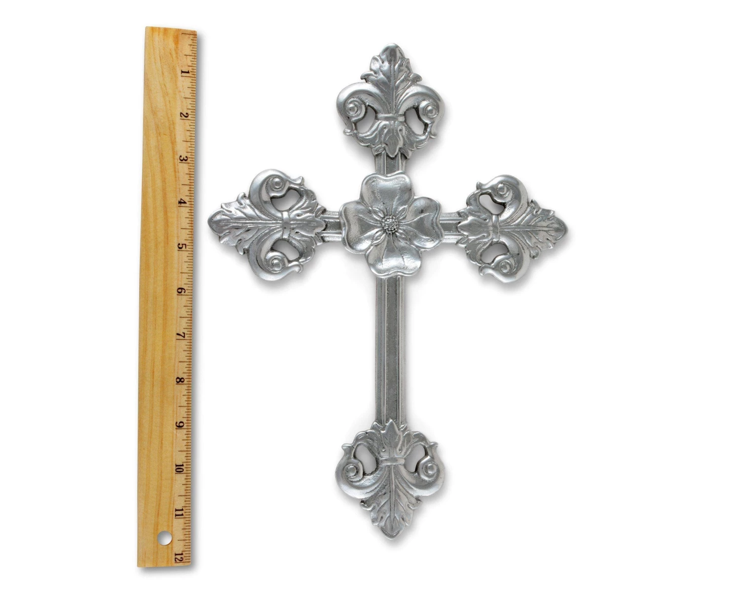 Proudly display this intricately sand-casted Arthur Court wall cross that mimics the designs and styles of the 17th century Baroque and Renaissance church architecture. Each point of the aluminum cross features a fleur-de-lis with folded petals and detailed leaves that beautifully represent the Virgin Mary, the Holy Trinity, or support of the military. The center boasts a beautiful open flower with slightly curved petals that is a nice lasting memorial for a loved one or a symbol of a love for gardens. The hand-polished alloy brightly shines in the light and is tarnish-free so there is no need for harsh cleaning. This 12-inch cross will elegantly hang from any wall or work as a gift for memorial, baptism, confirmation or Christmas.