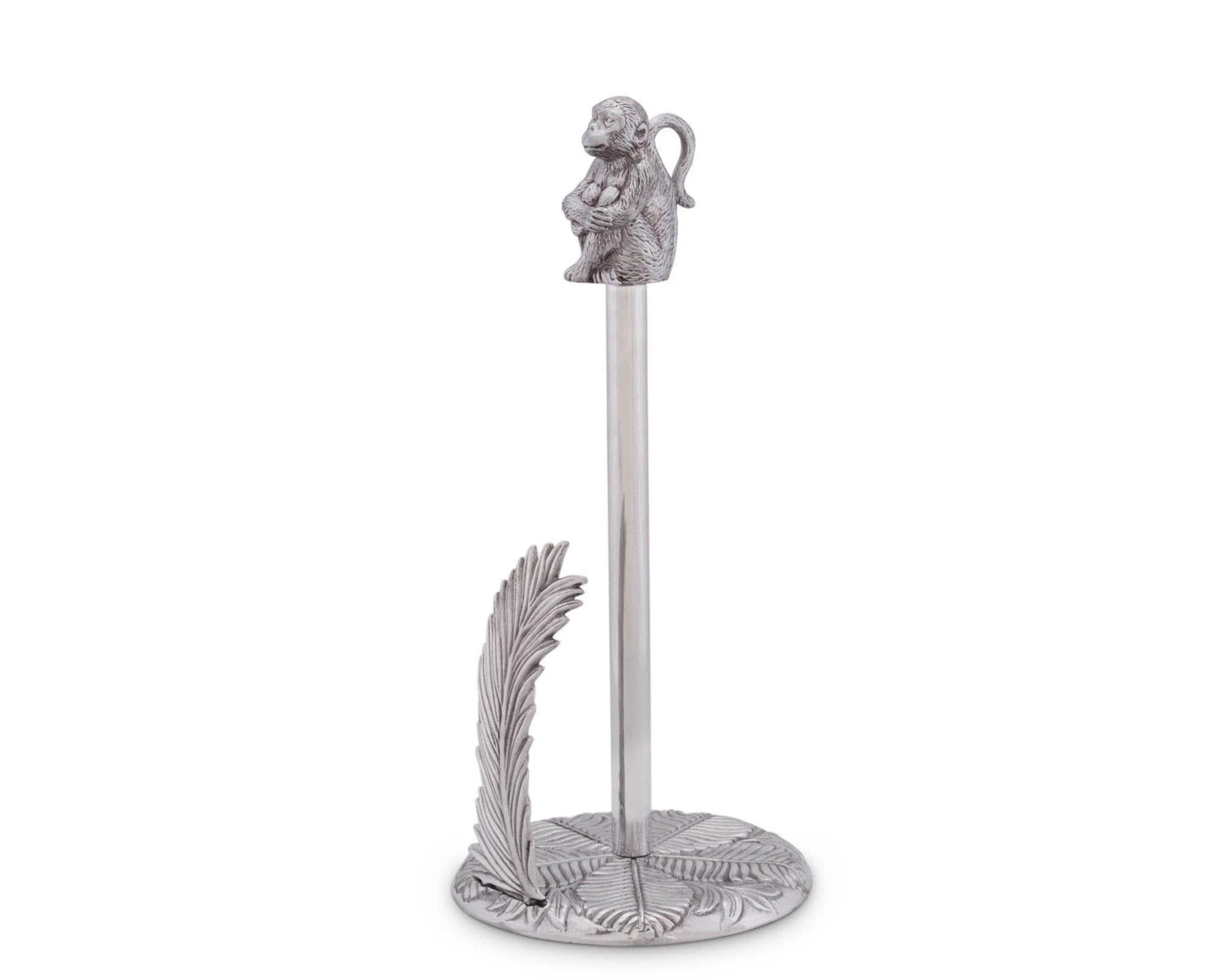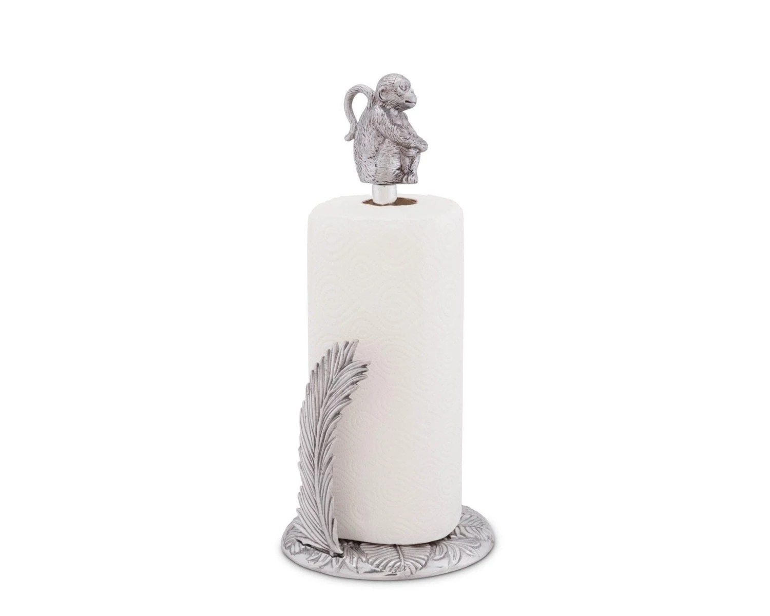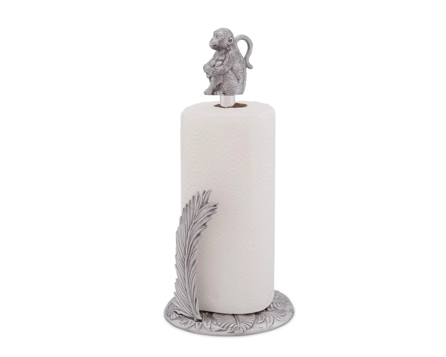 A cute as a button Monkey final sits atop our Monkey Safari Paper Towel Holder. Crafted from signature Arthur Court aluminum alloy, a standard size roll of paper towels fit the 15-inch-tall holder perfectly. A detailed rip-stop in the shape of a palm frond is the finishing touch for this clever and fun tropical kitchen accessory.