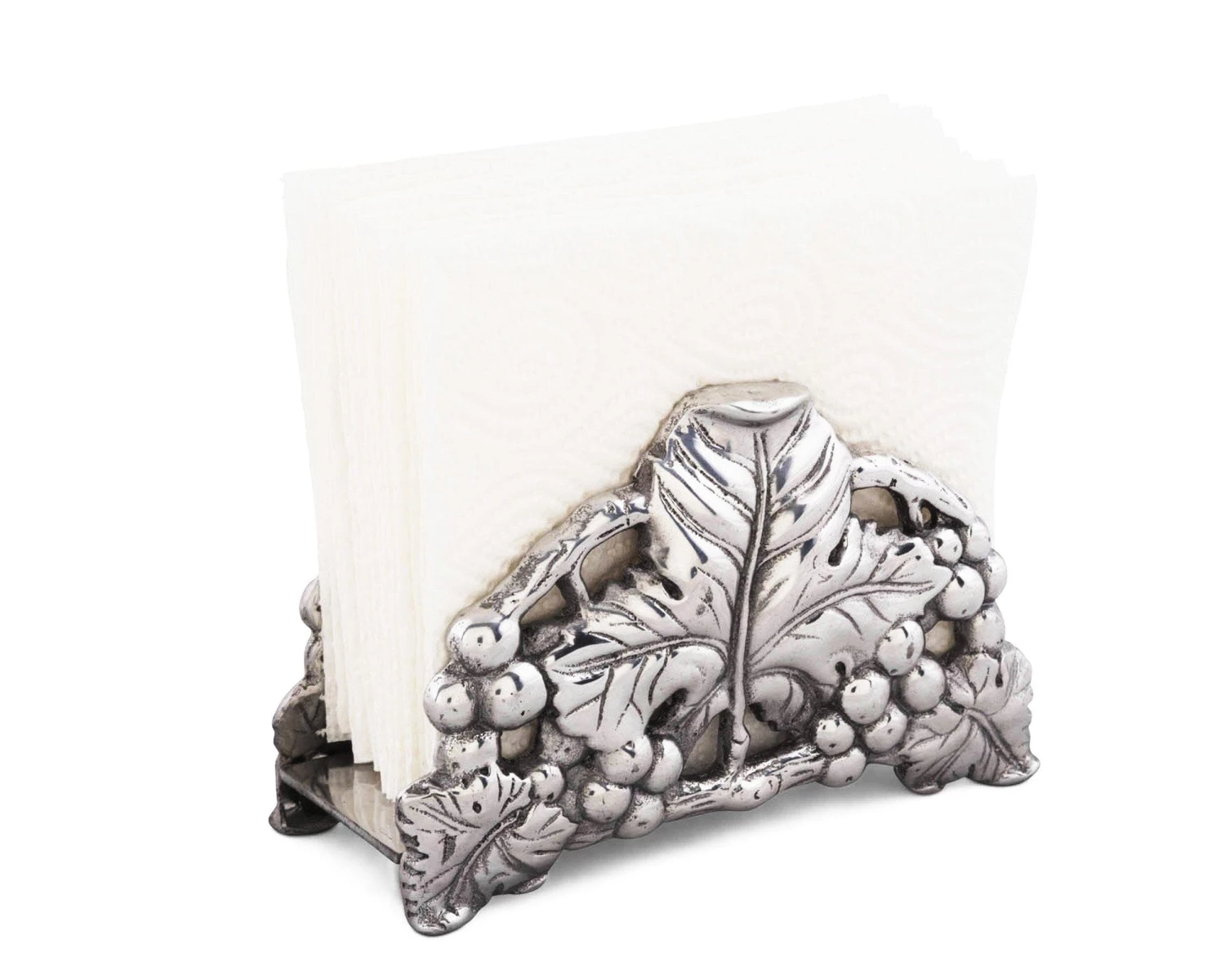 A large, detailed leaf stands on its stem as bundles of grapes and smaller leaves surround its bottom blades. Vines solidify the handmade, aluminum piece as they form a half-moon around the design. This holder is for 6-inch napkins on down.