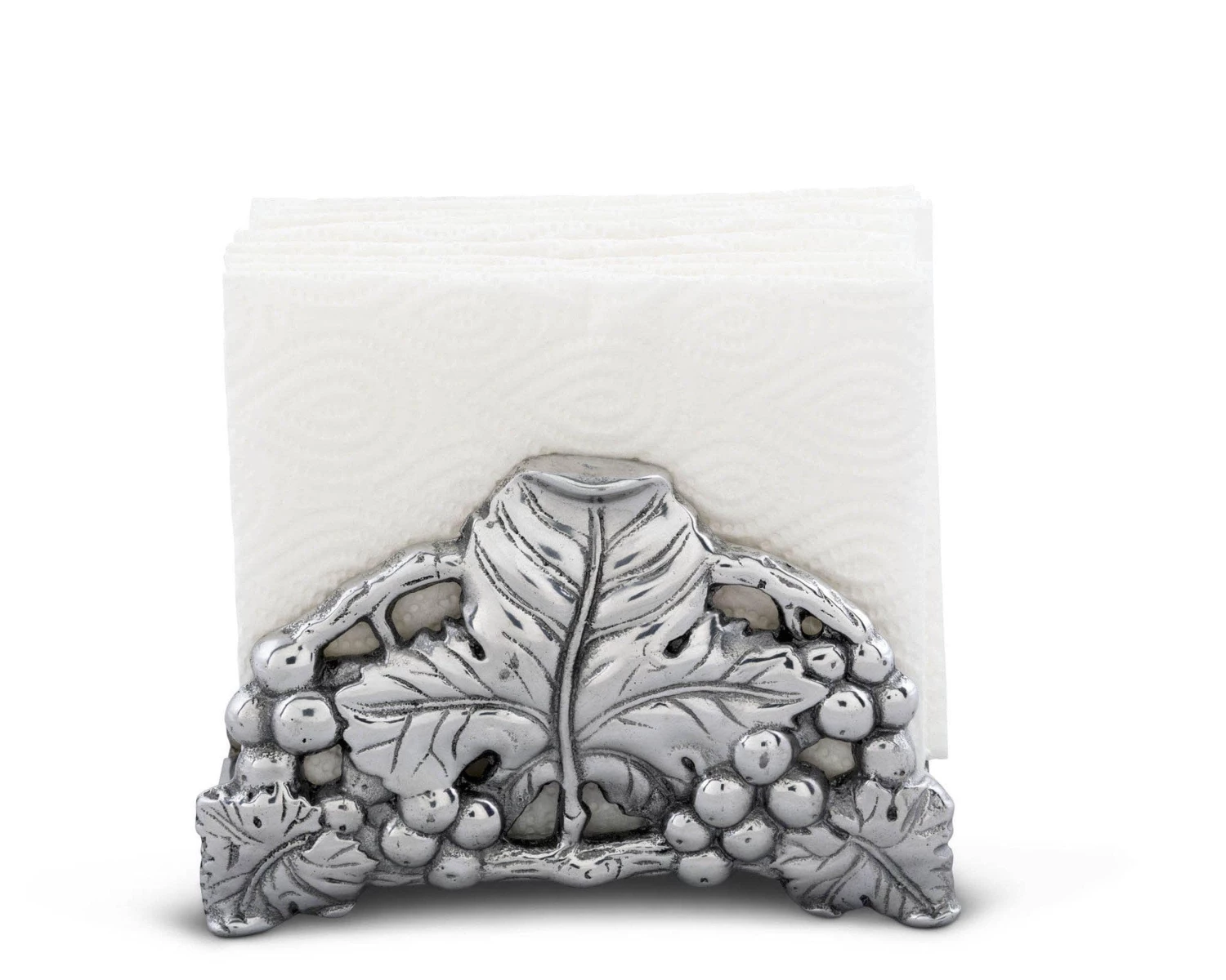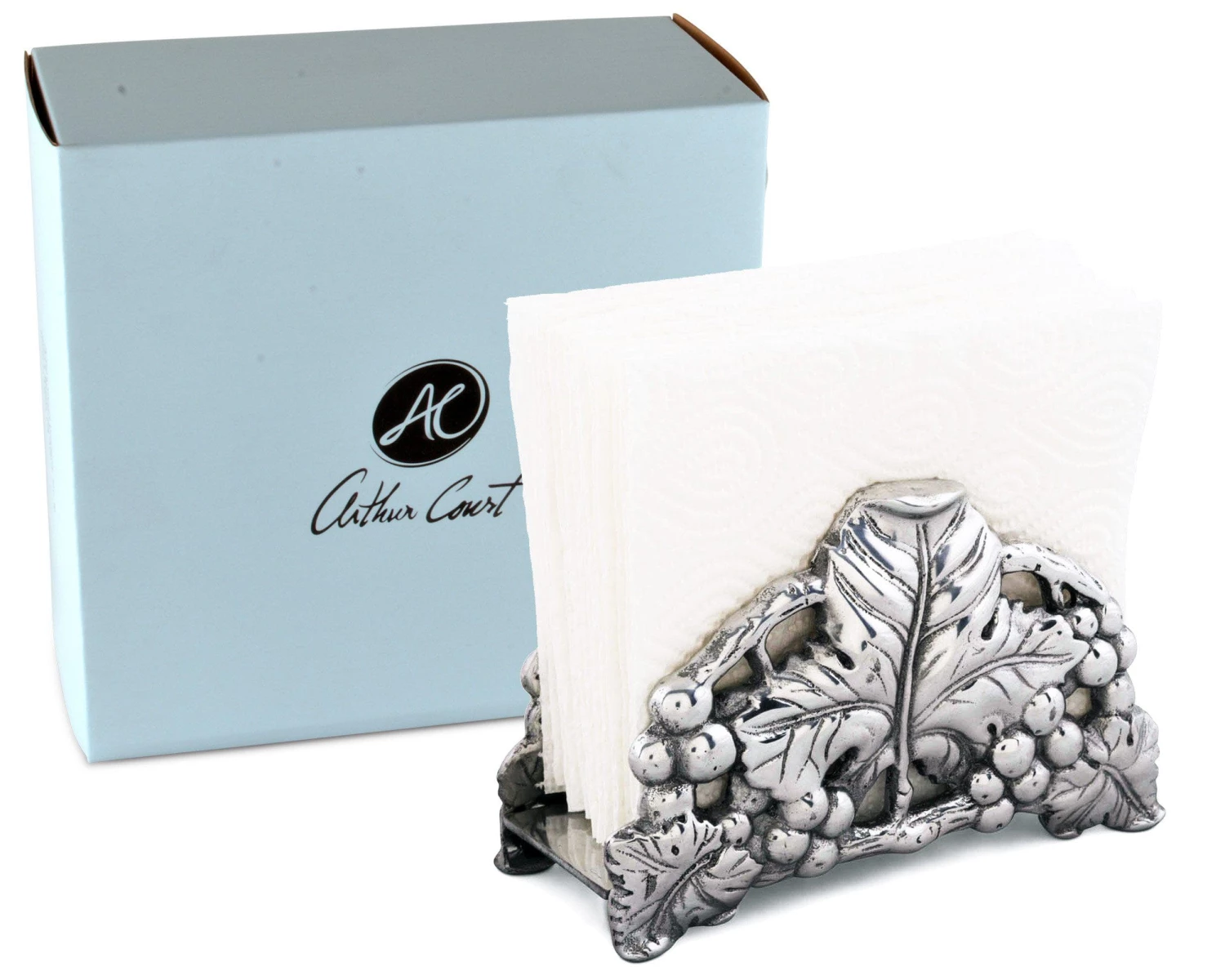 Make your entertainment space convenient for guests with this handsome grape motif cocktail napkin holder by Arthur Court. Great for accentuating a Tuscan or vineyard design theme, this silver-tone napkin holder boasts clusters of grapes amid stylized leaves and irregular vine framing for a visually interesting piece that grabs and keeps attention. Rely on the 6 x 4-inch sizing to easily accommodate your favorite cocktail napkins, and depend on the open top to provide easy guest access to those paper essentials. Construction from FDA-compliant signature aluminum alloy makes this premium holder safe for use around food and beverages while making it exceptionally long-lasting. Gift this intricately designed accent to members of your wine club when celebrating life’s milestones, or keep it for yourself to spruce up your den or kitchen.