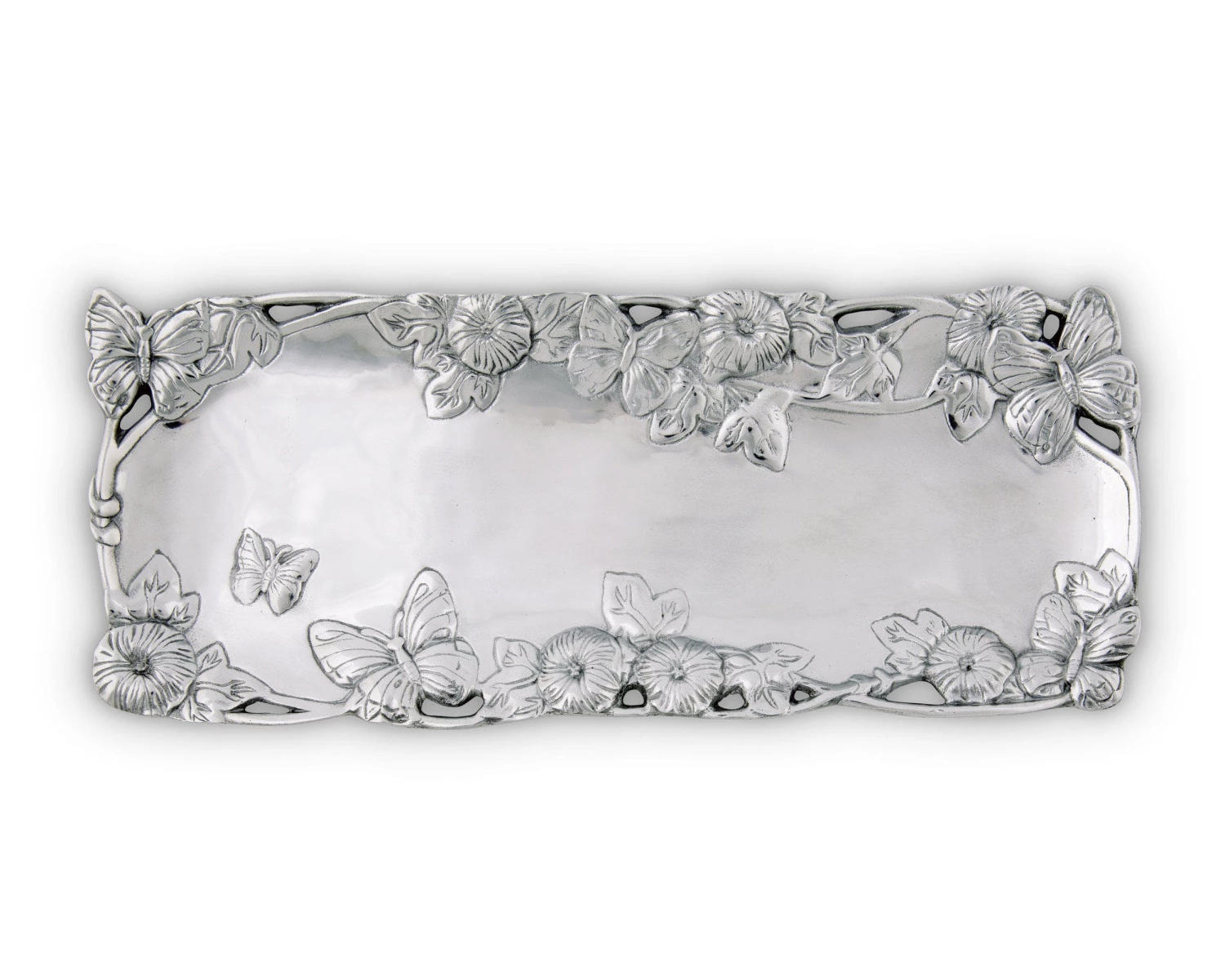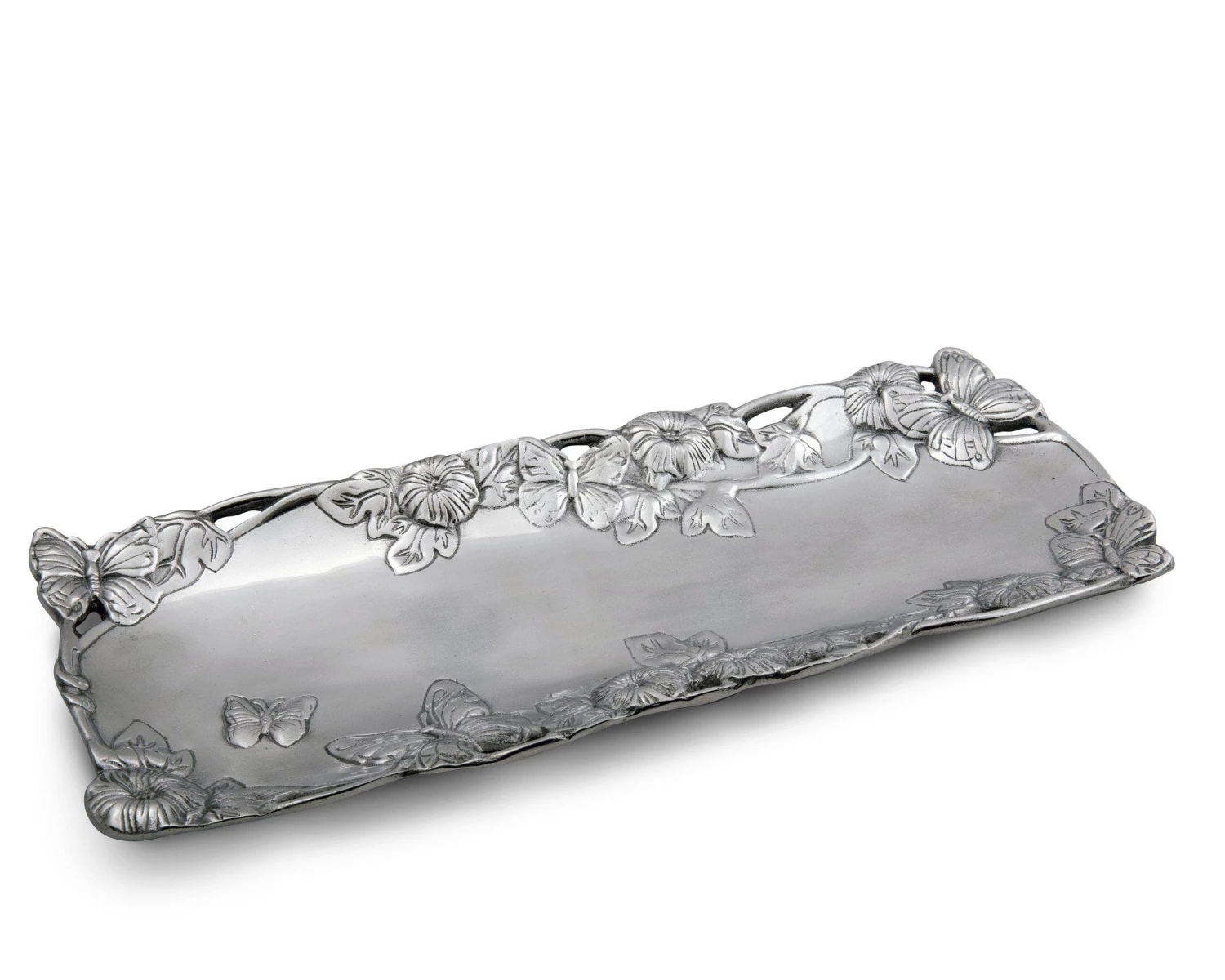 Great for entertaining, this Arthur Court Butterfly Oblong Tray is both beautiful and functional. The design features a pretty butterfly/garden motif with openwork around the perimeter, and has a polished mirror finish. This tray will be beautiful on display as a home accent piece, and is perfect for serving your guests breads, appetizers, sides or desserts