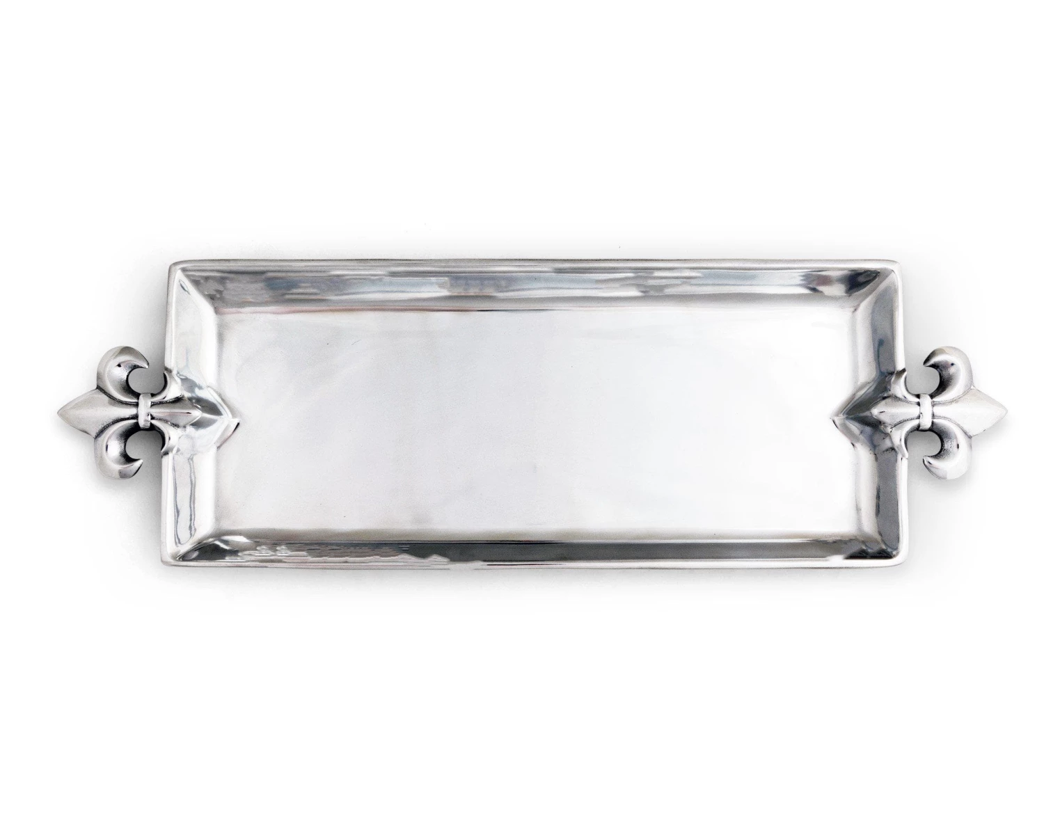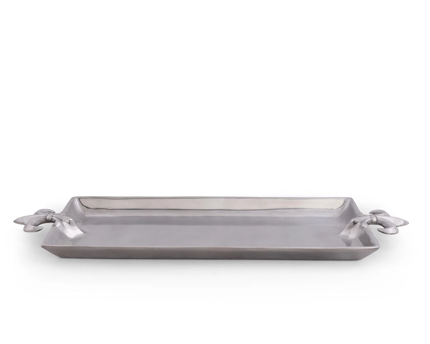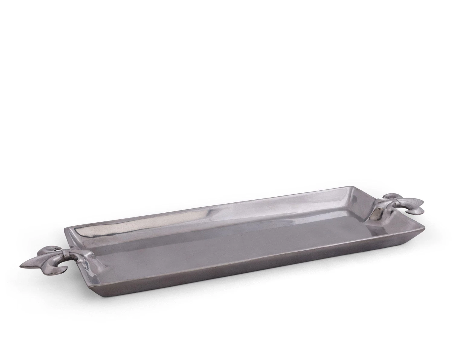 Serve your meals in the right way with this fancy oblong serving tray. The elegant fleur-de-lis design will stand out in any kitchen or dining room setup, allowing you to begin to take your plating to a new level. Oblong serving tray. Food-safe aluminum alloy with mirror finish. Sleek fleur-de-lis pattern. Individually hand-crafted and hand-polished. Elegant fleur-de-lis design. Hand-washing with mild soap recommended; not dishwasher safe. Chill in refrigerator or freezer, can be warmed in oven to 350 degrees. 21″ wide. 7″ deep. 1″ high.