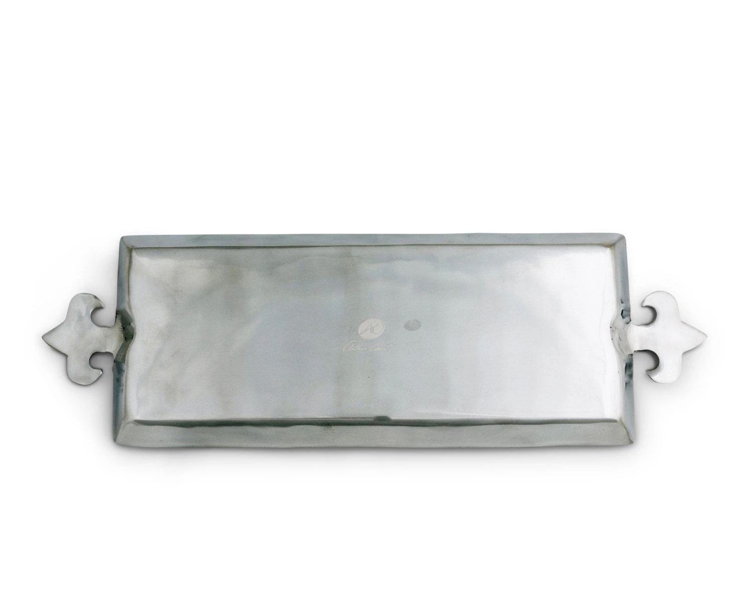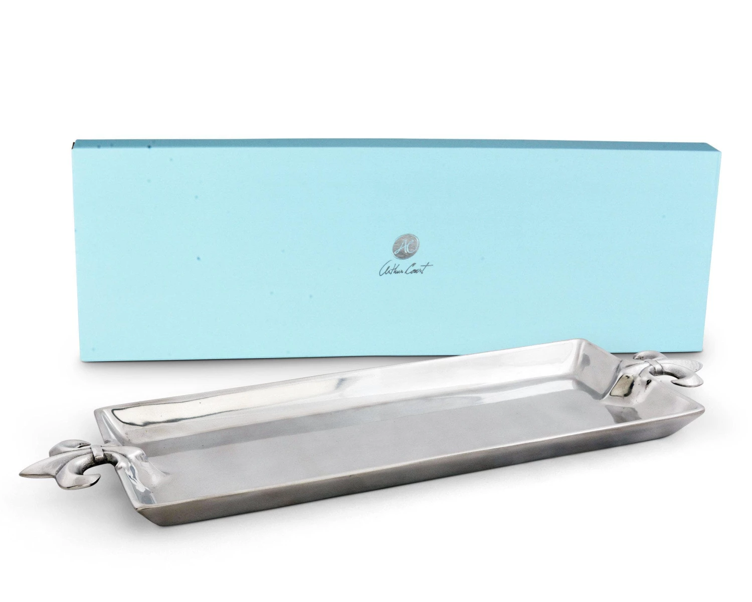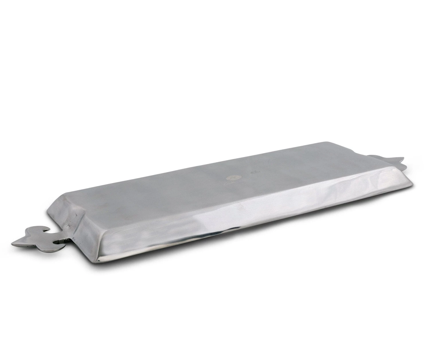 Serve your meals in the right way with this fancy oblong serving tray. The elegant fleur-de-lis design will stand out in any kitchen or dining room setup, allowing you to begin to take your plating to a new level. Oblong serving tray. Food-safe aluminum alloy with mirror finish. Sleek fleur-de-lis pattern. Individually hand-crafted and hand-polished. Elegant fleur-de-lis design. Hand-washing with mild soap recommended; not dishwasher safe. Chill in refrigerator or freezer, can be warmed in oven to 350 degrees. 21″ wide. 7″ deep. 1″ high.