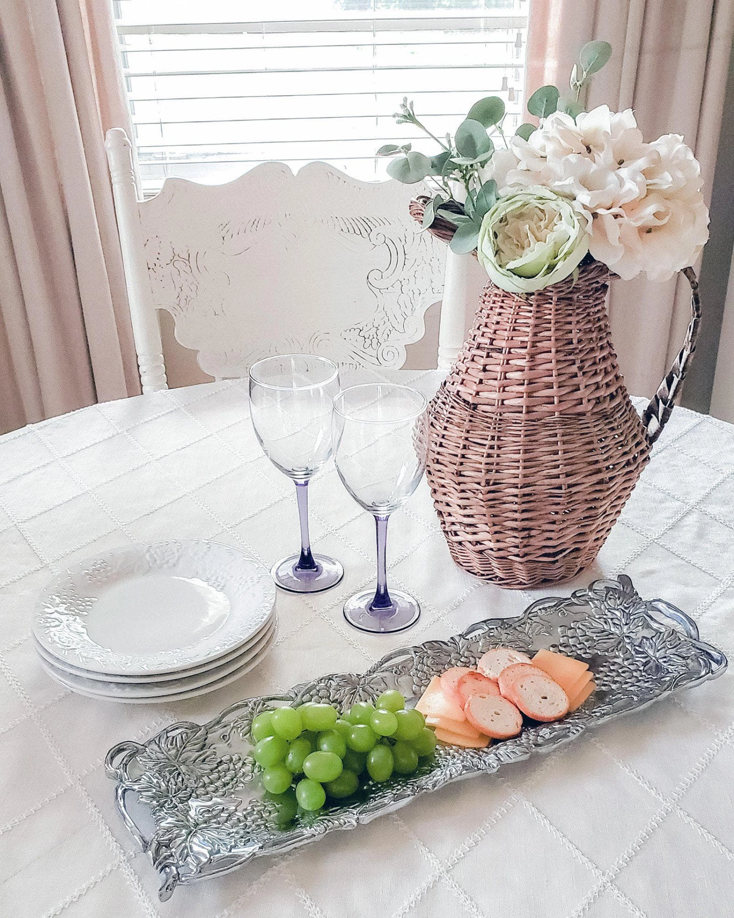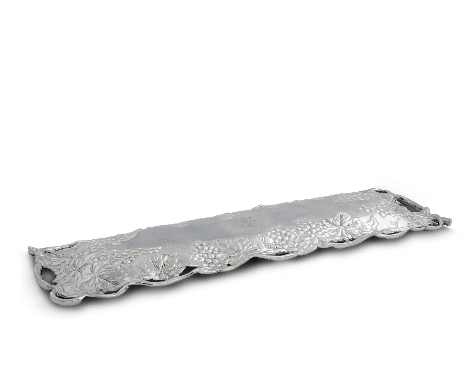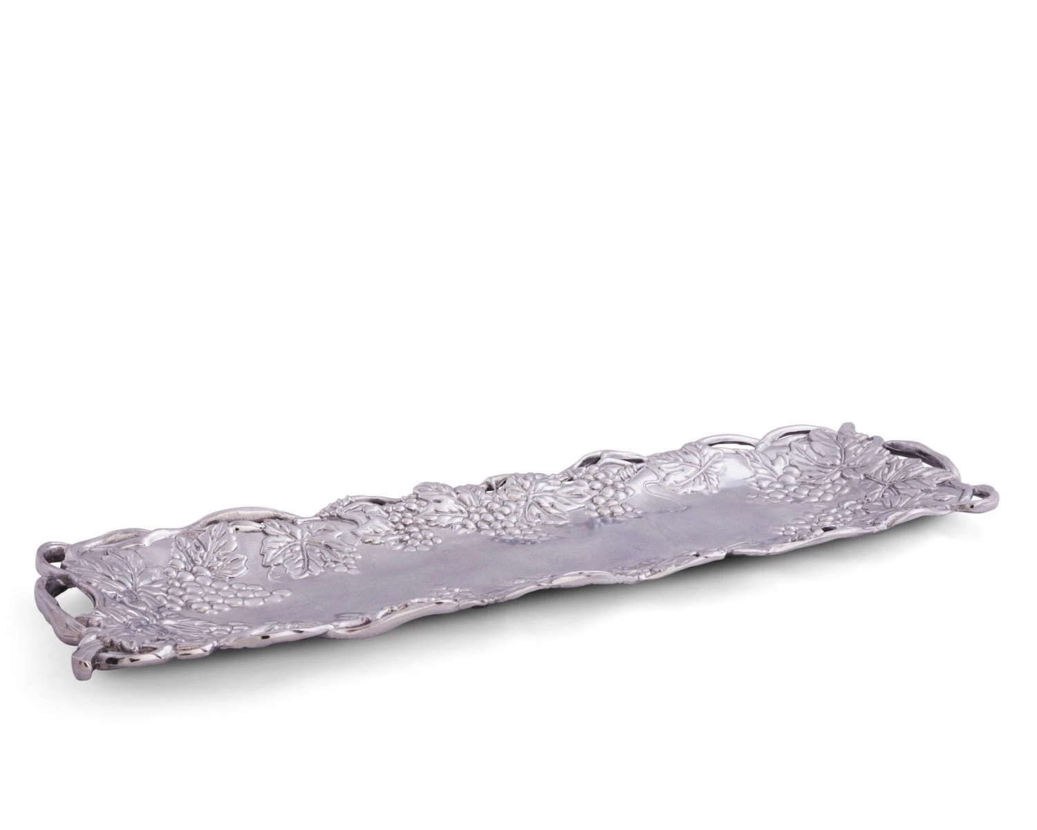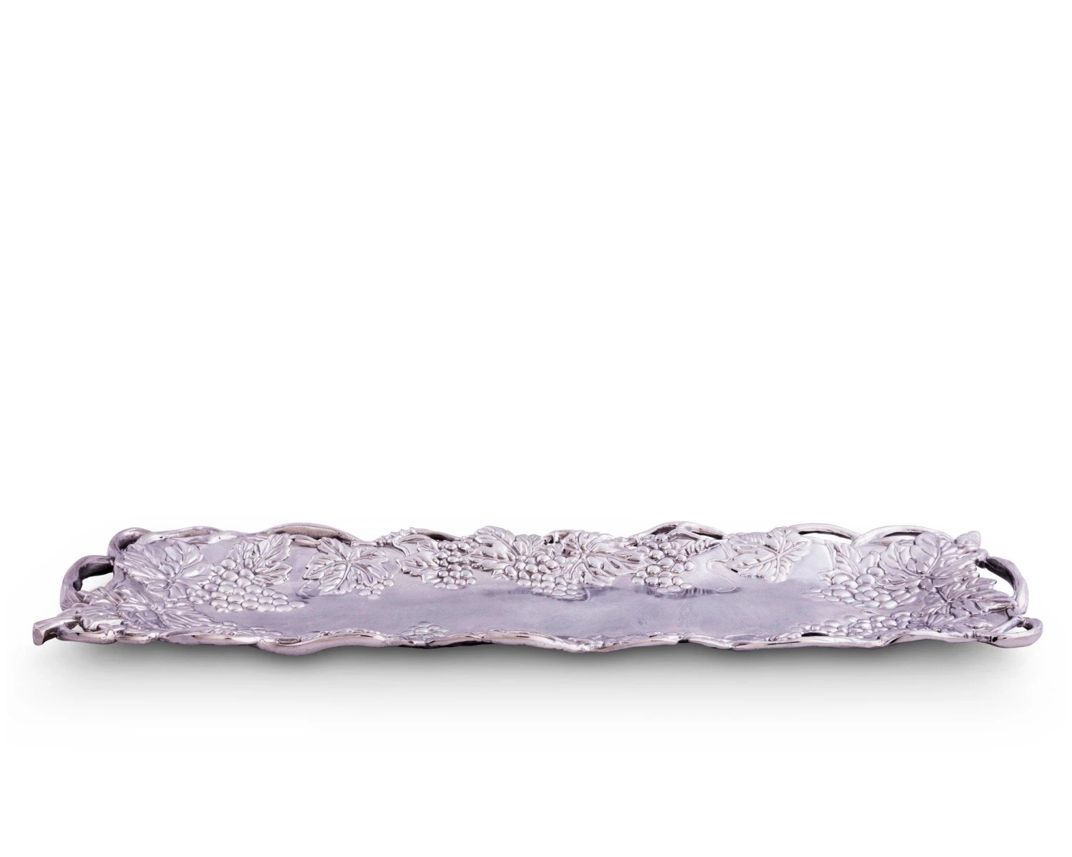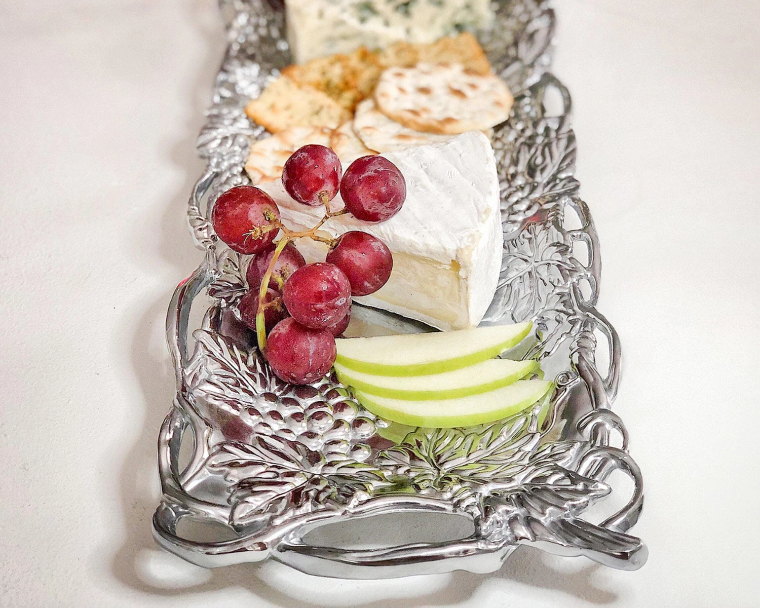 A dense collection of vines and leaves create the dish’s open work border, while bundles of grapes hang off of it into the middle. The striking details of the fruit and foliage gives this handmade, aluminum tray remarkable definition.