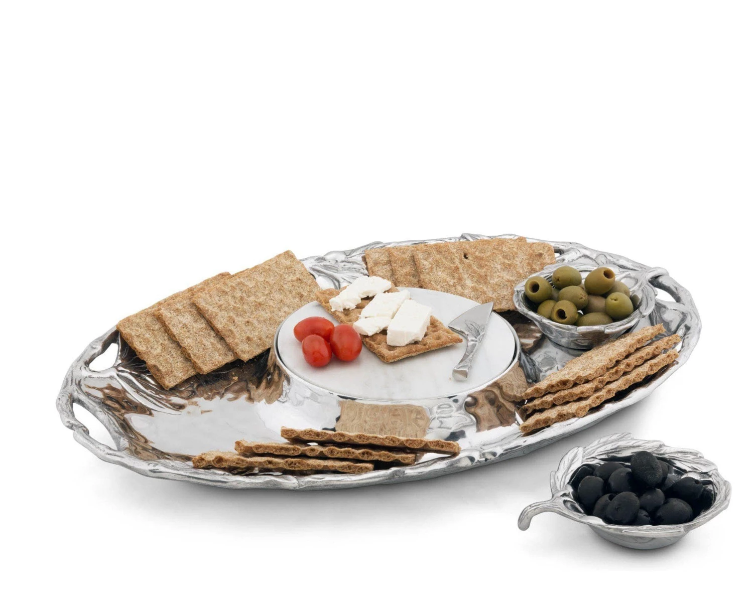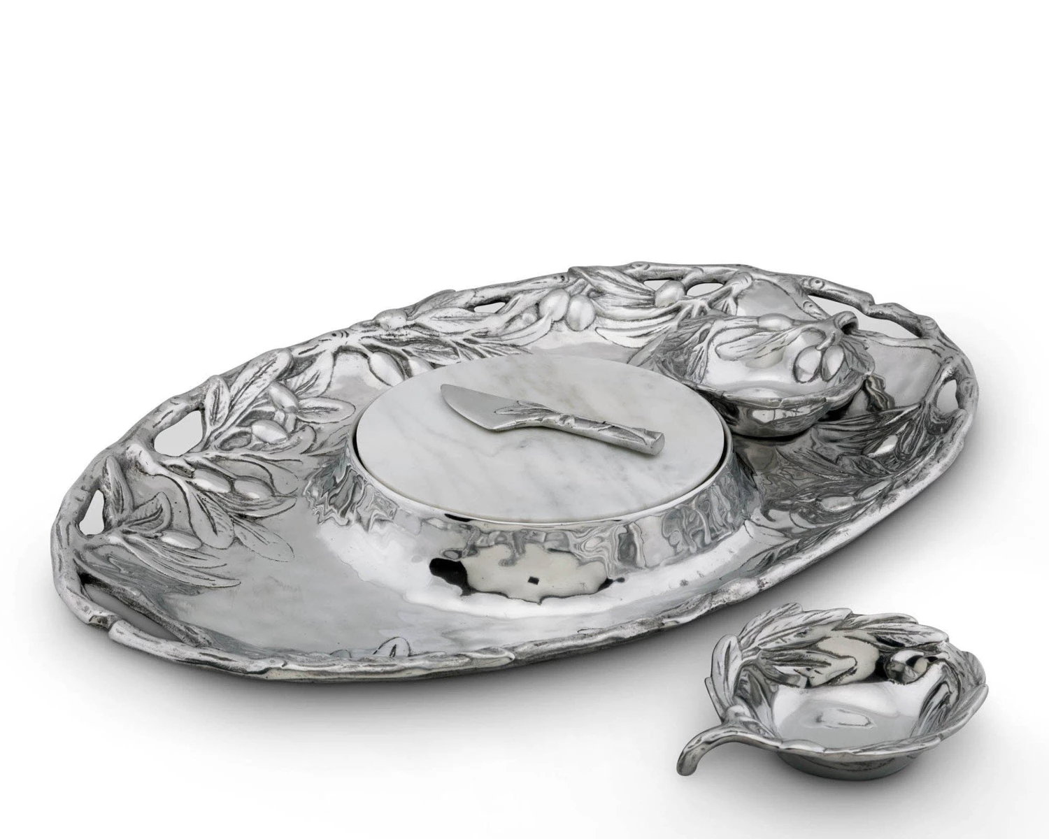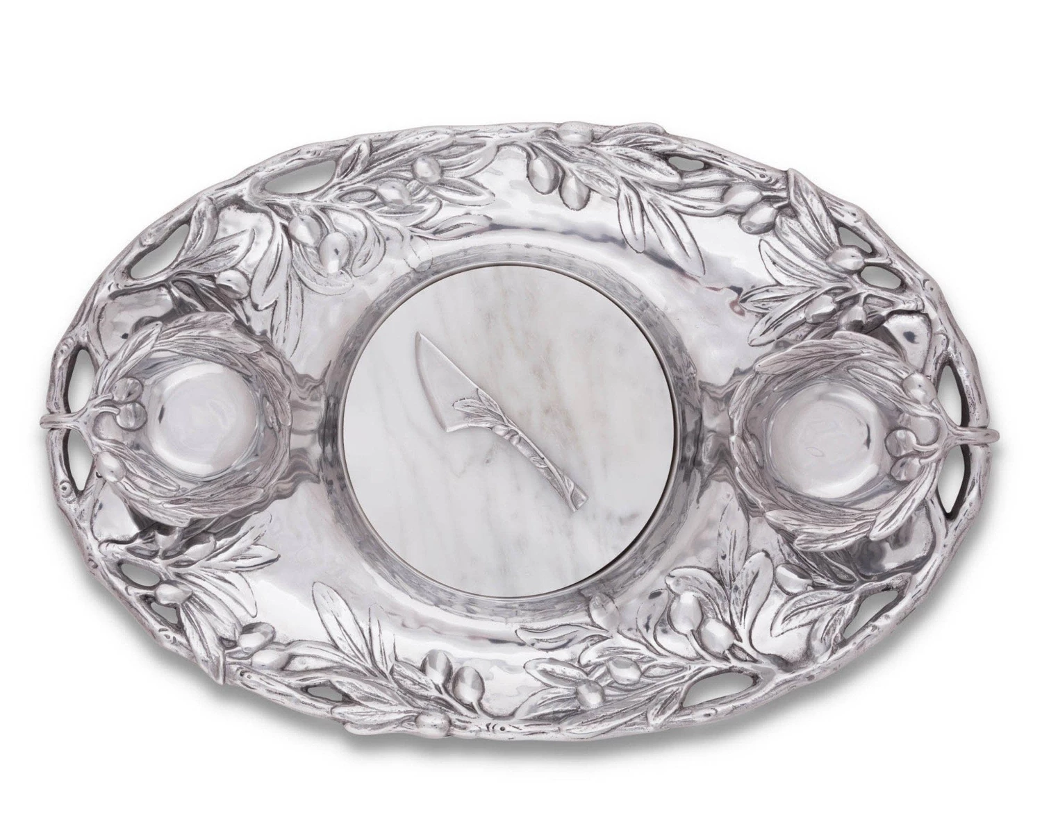Olive branches, heavy with fruit decorate this multi-functional entertainer. Centered with a round, marble board perfect for cheeses, 2 removable, olive shaped and embellished bowls snuggle in to serve dips, condiments or olives. A matching spreader completes the ensemble. Line the tray with flat breads, fill the bowls with hummus, present cut crudités on the marble slab for a true Mediterranean feast.
