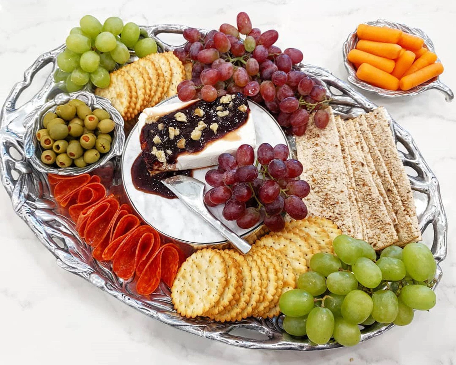 An Arthur Court Original design, this olive decorated, large oval open metal work serving tray is actually a five piece entertainment wonder.