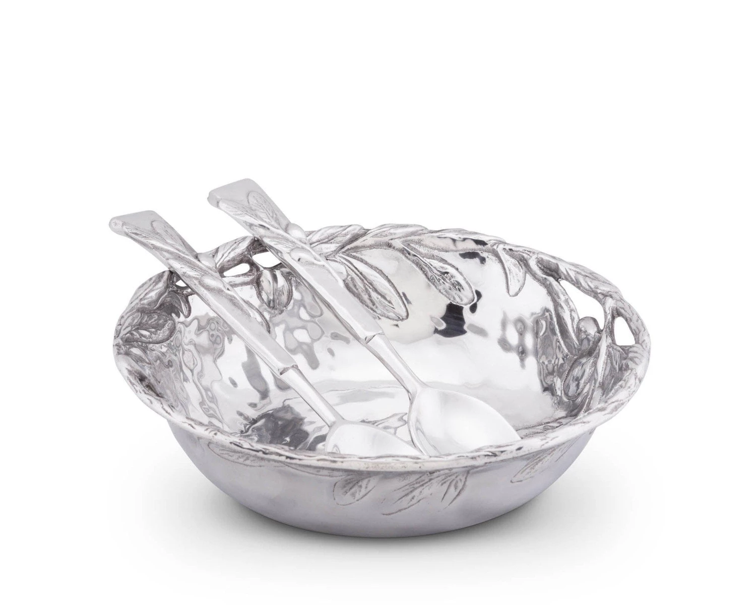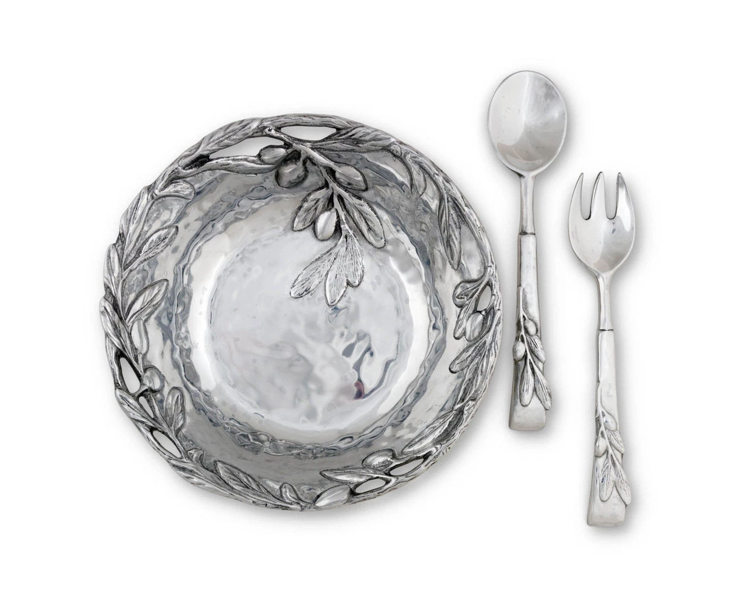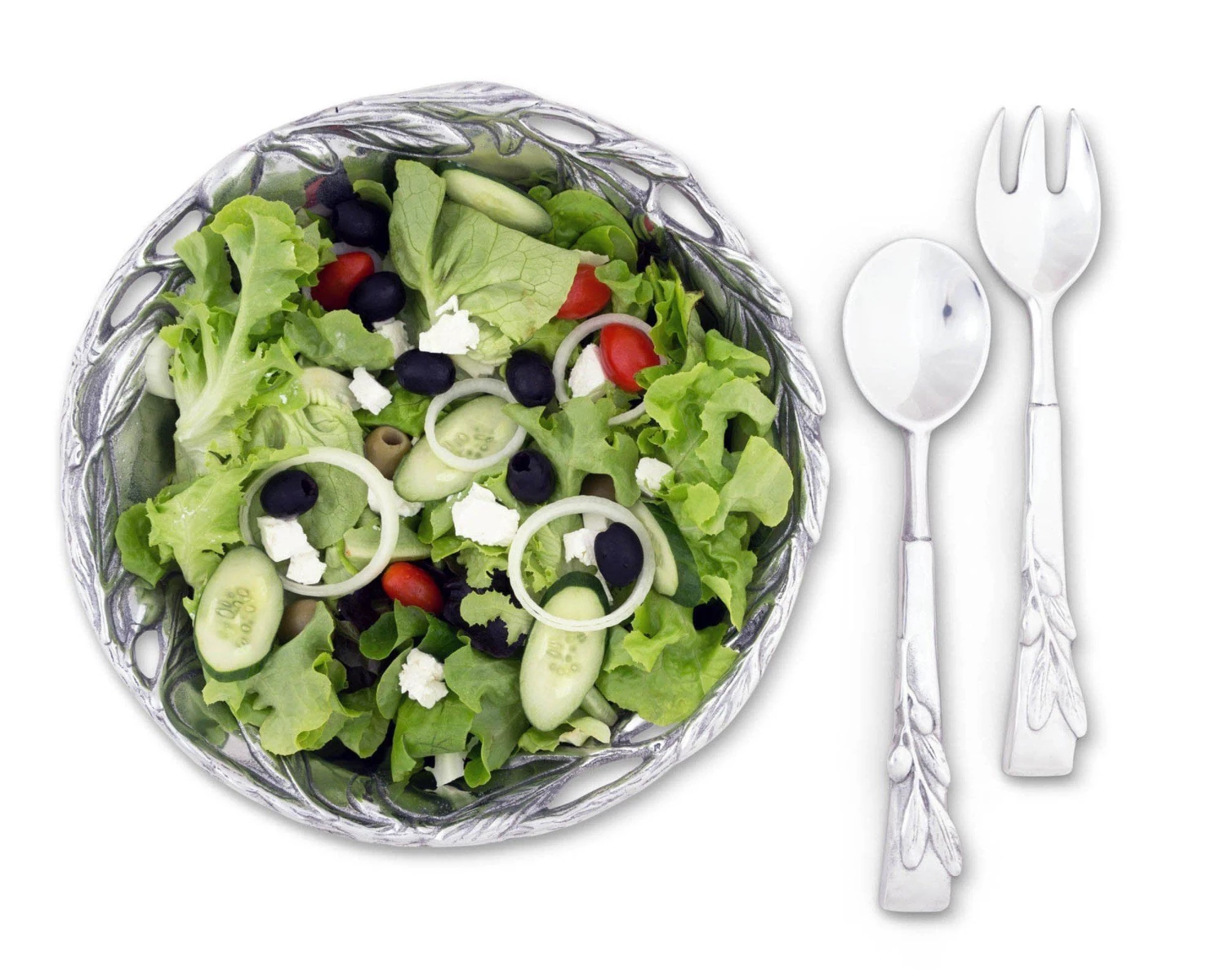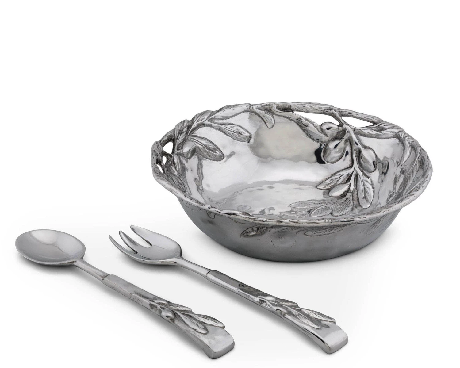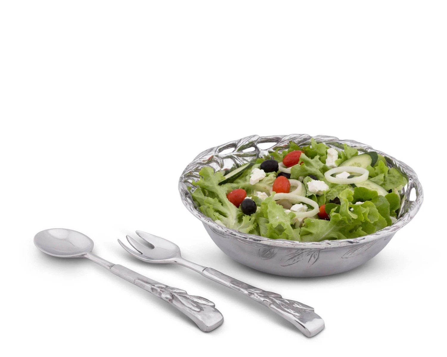 The metal bowl has a rustic feel enhanced with open metal work around the top and a design of raised olive branches. Two olive embellished salad servers come with the bowl, adding to the décor narrative.