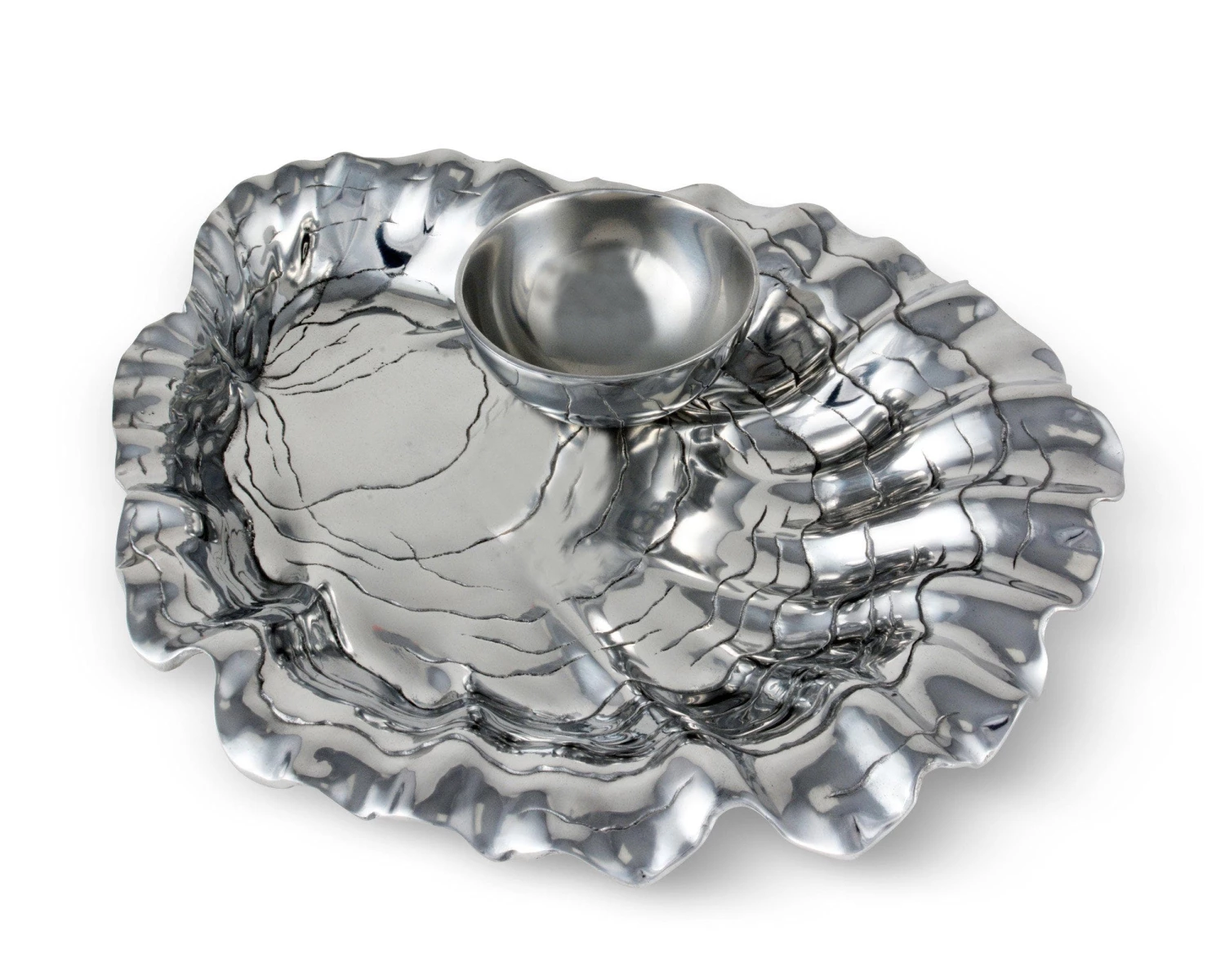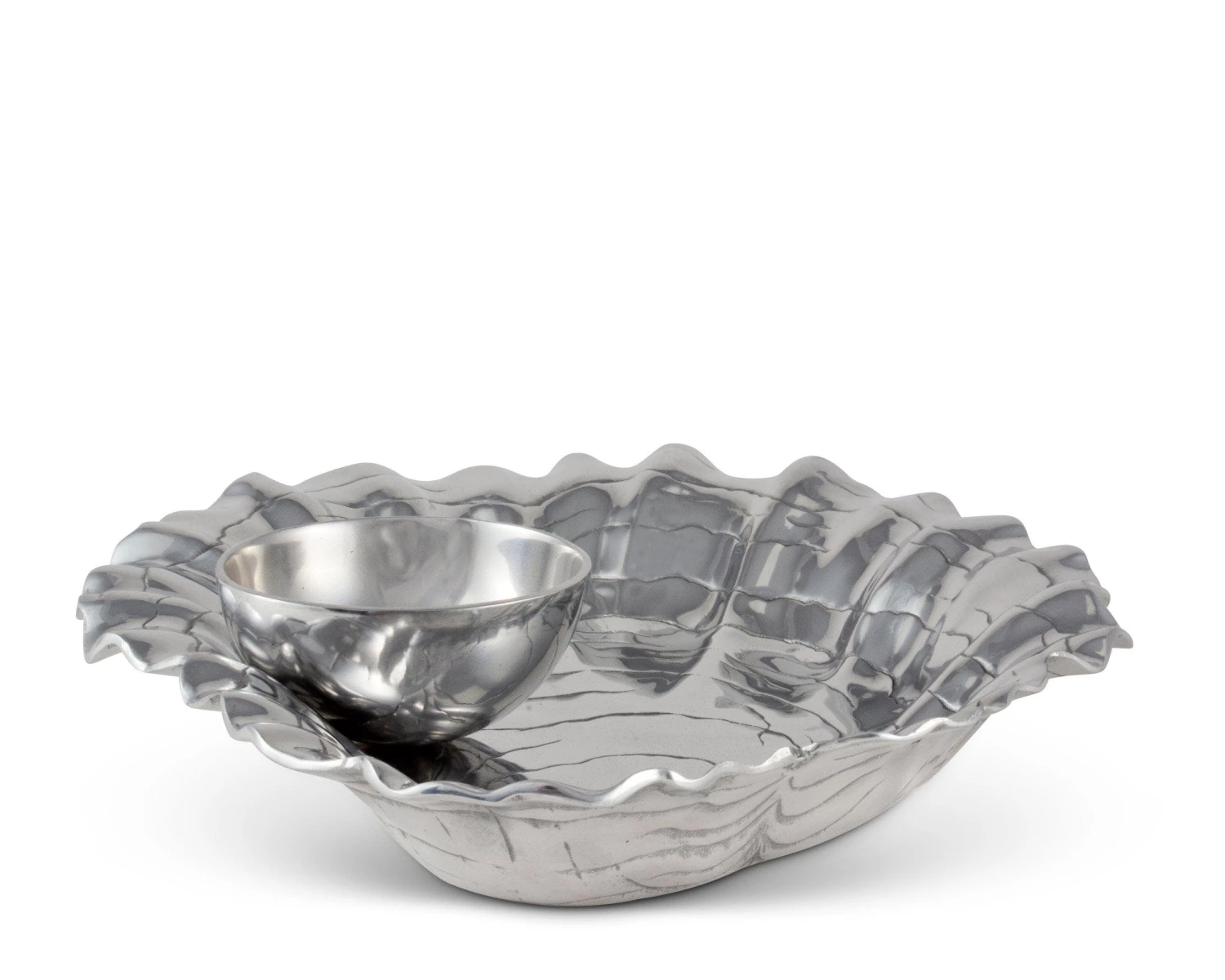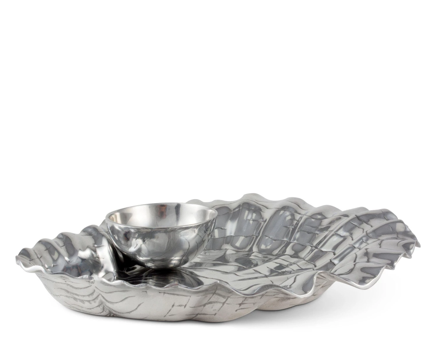 Make Arthur Court’s Oyster and Pearl Chip and Dip the treasure of your serve ware. Heavy, textured lines run across the shell’s interior as the horizontal pattern draws your eyes downward.