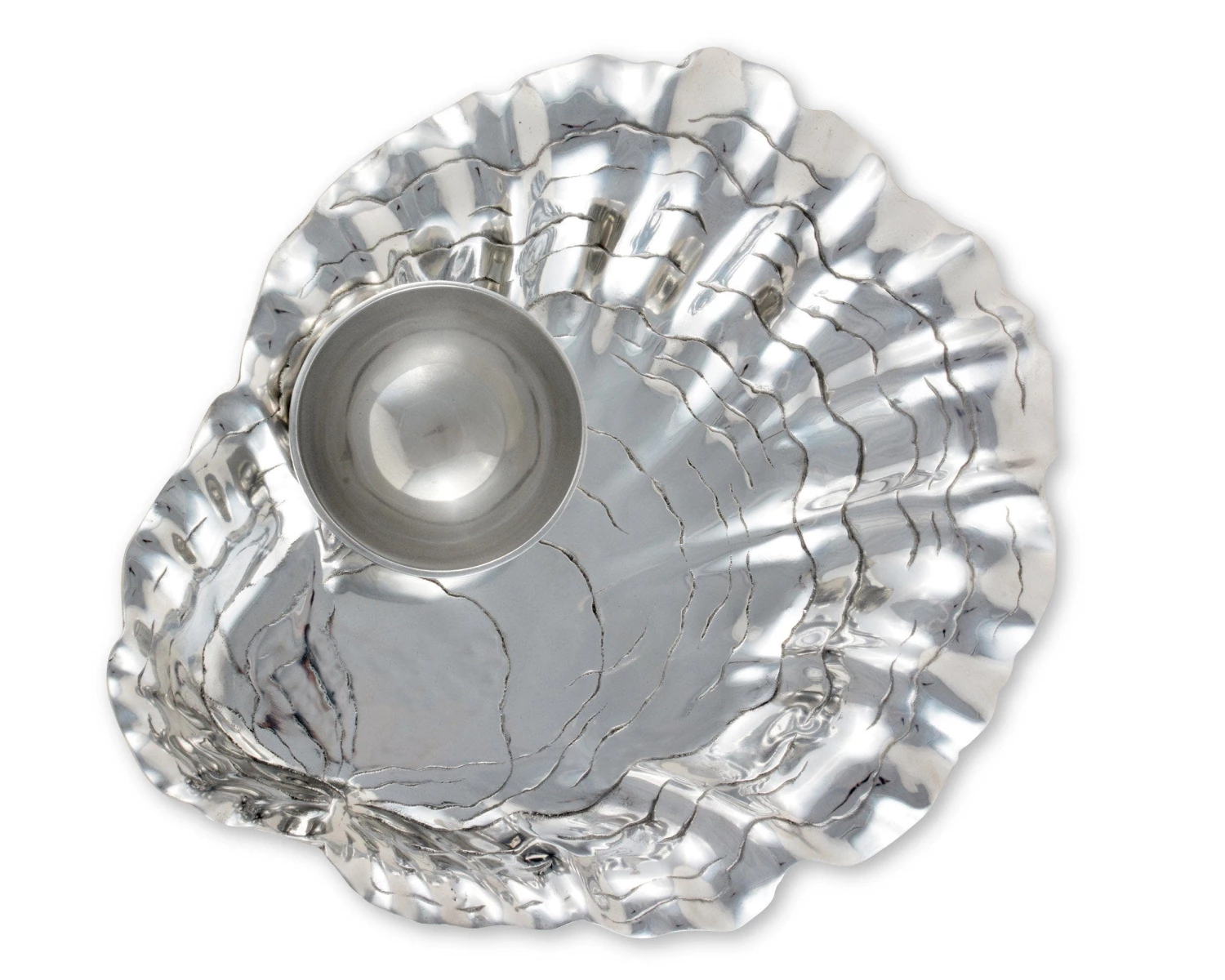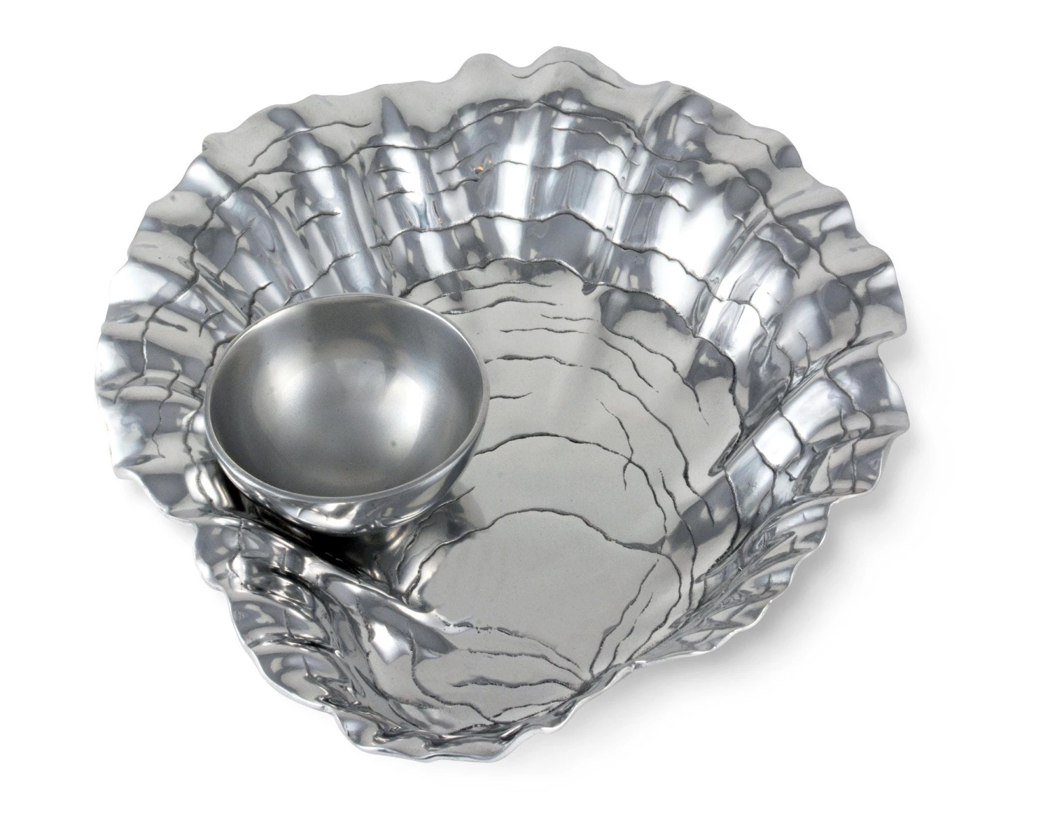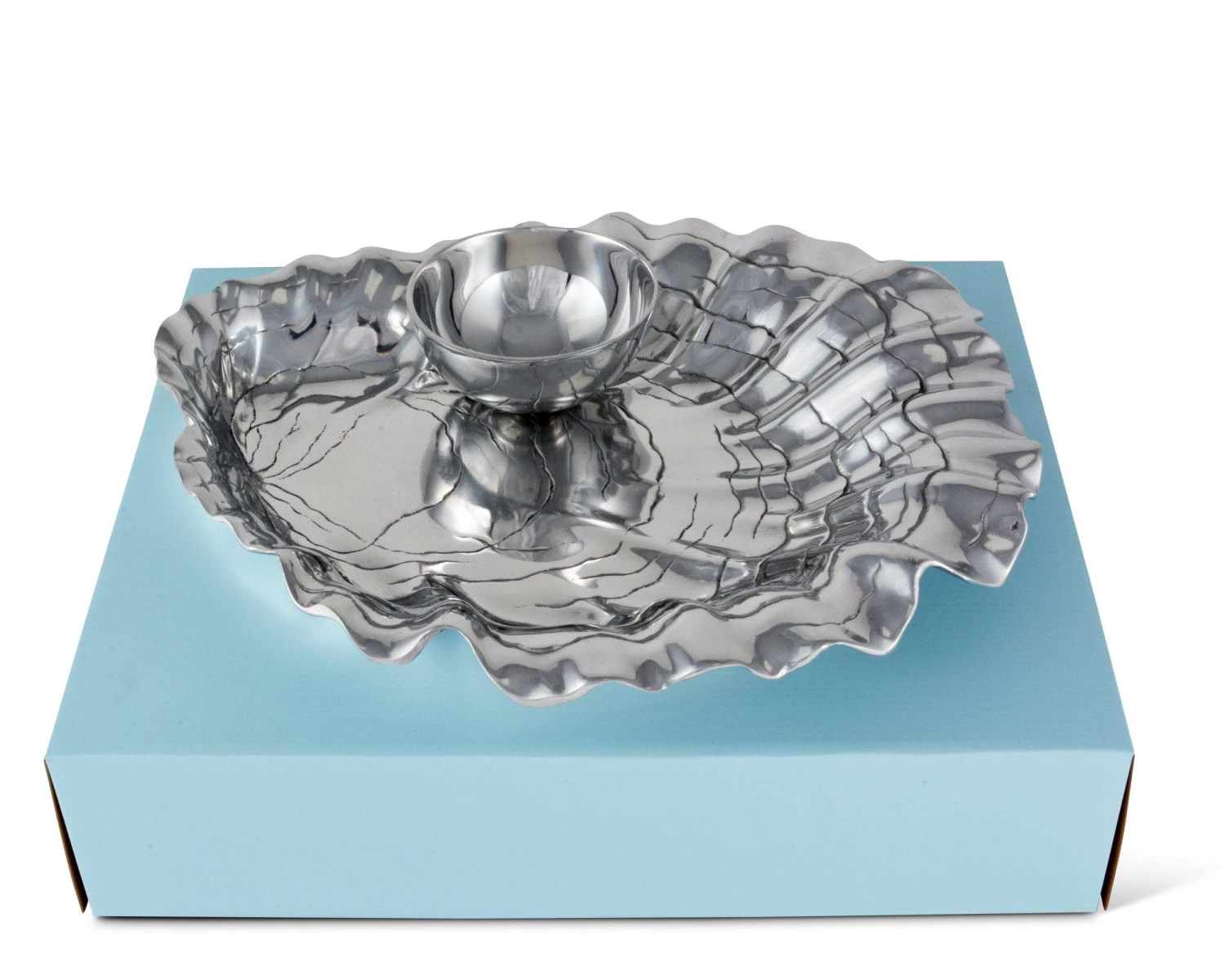 Make Arthur Court’s Oyster and Pearl Chip and Dip the treasure of your serve ware. Heavy, textured lines run across the shell’s interior as the horizontal pattern draws your eyes downward.