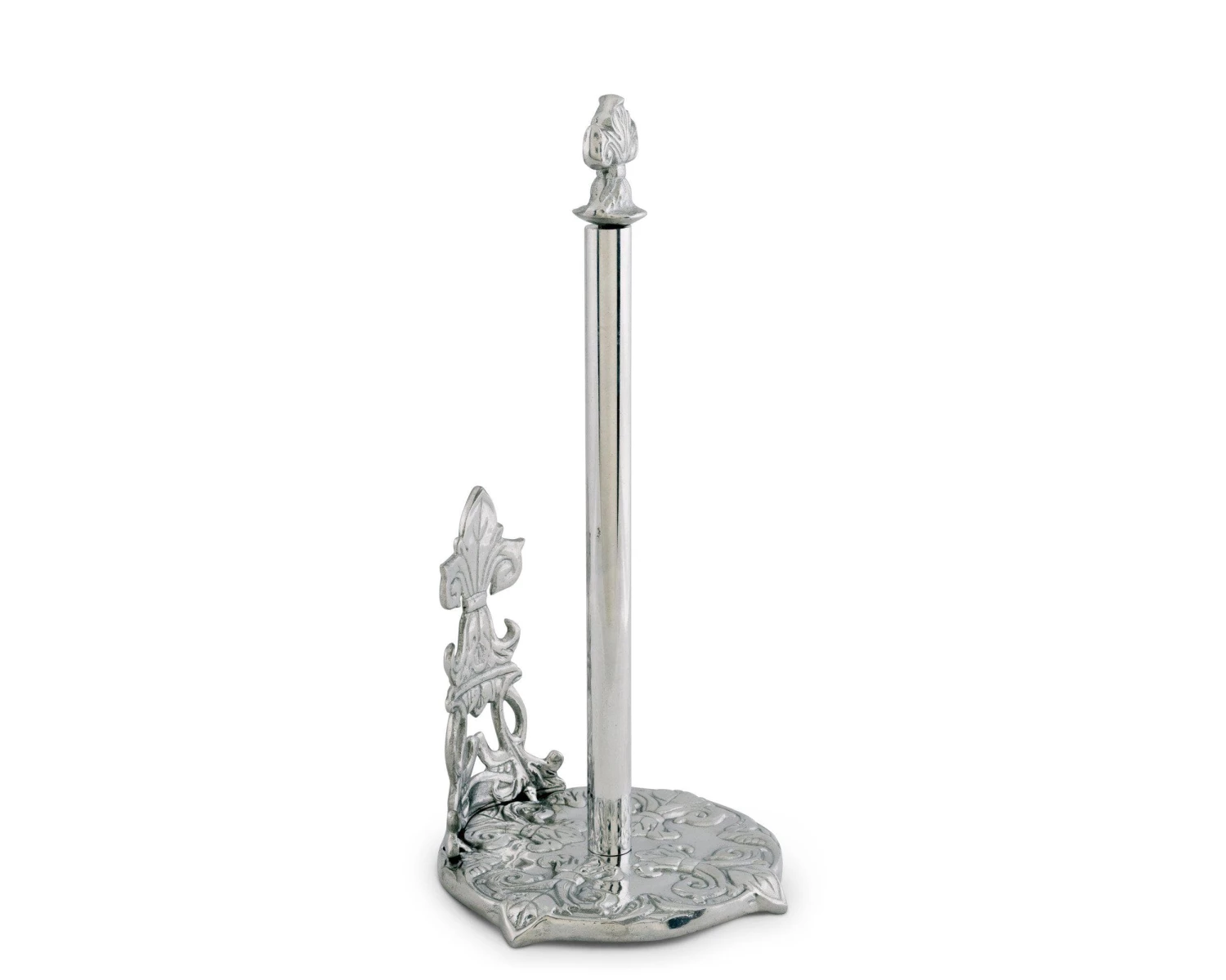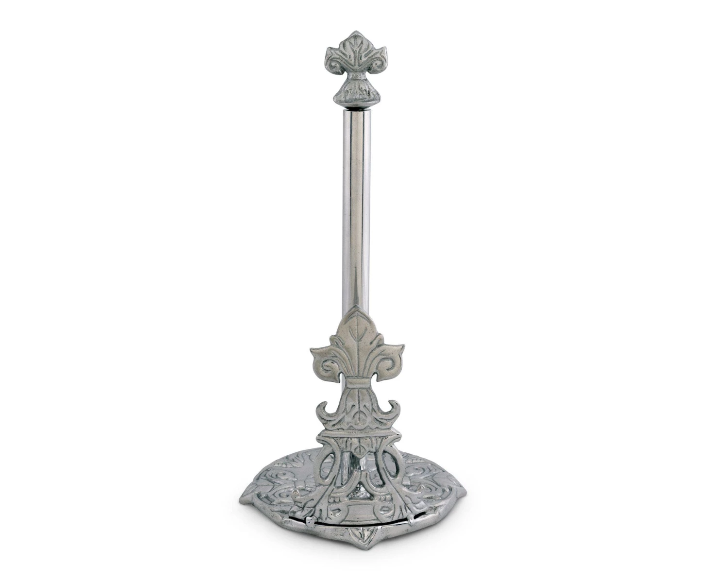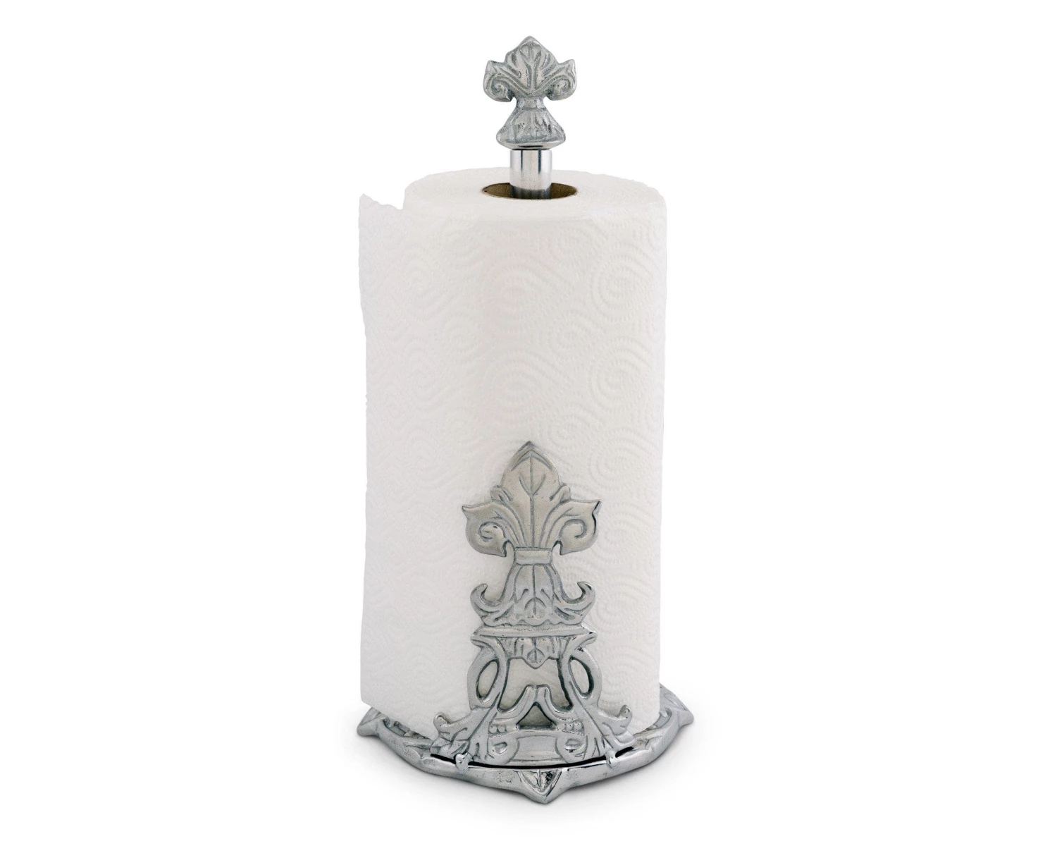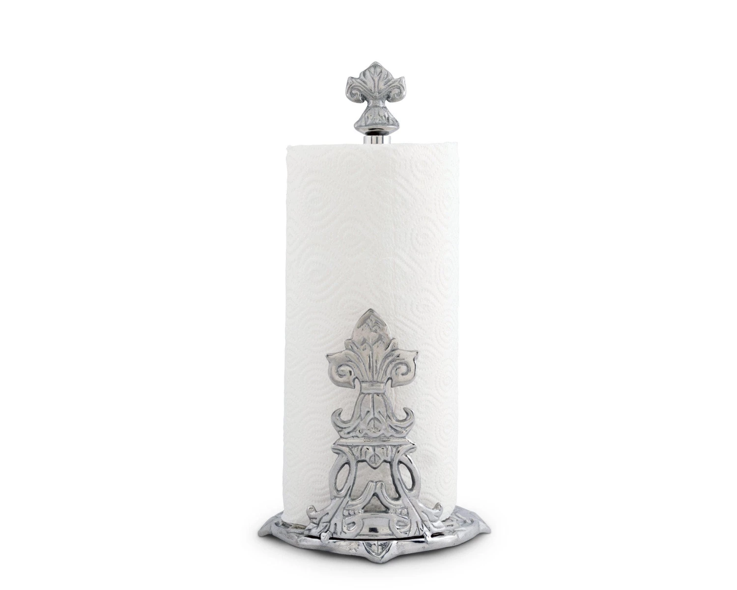 The classic fleur-de-lis ornamentation readies the next sheet of paper for dispensing towels with graceful style. The entire paper towel holder is handmade of aluminum alloy, which has been buffed to a gleaming lustrous finish that requires no polishing and will not tarnish. Present this item with pride in its included gift box at housewarming parties, bridal showers or weddings. This design features a fleur-de-lis symbol mounted on top of other regal flourishes that build up from the base. Another emblem perches on top of the handmade, aluminum holder to catch the eye of anyone who walks in the kitchen.