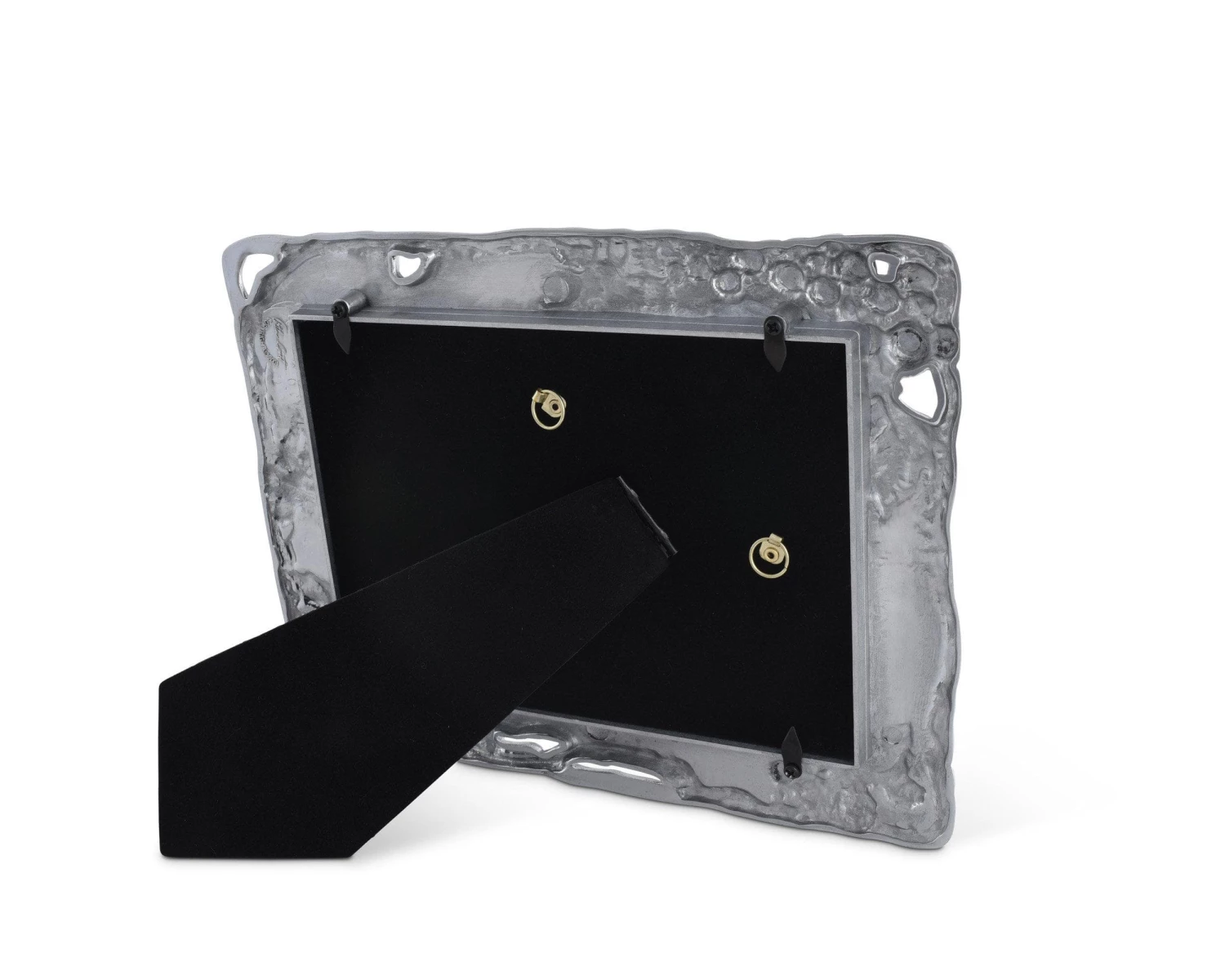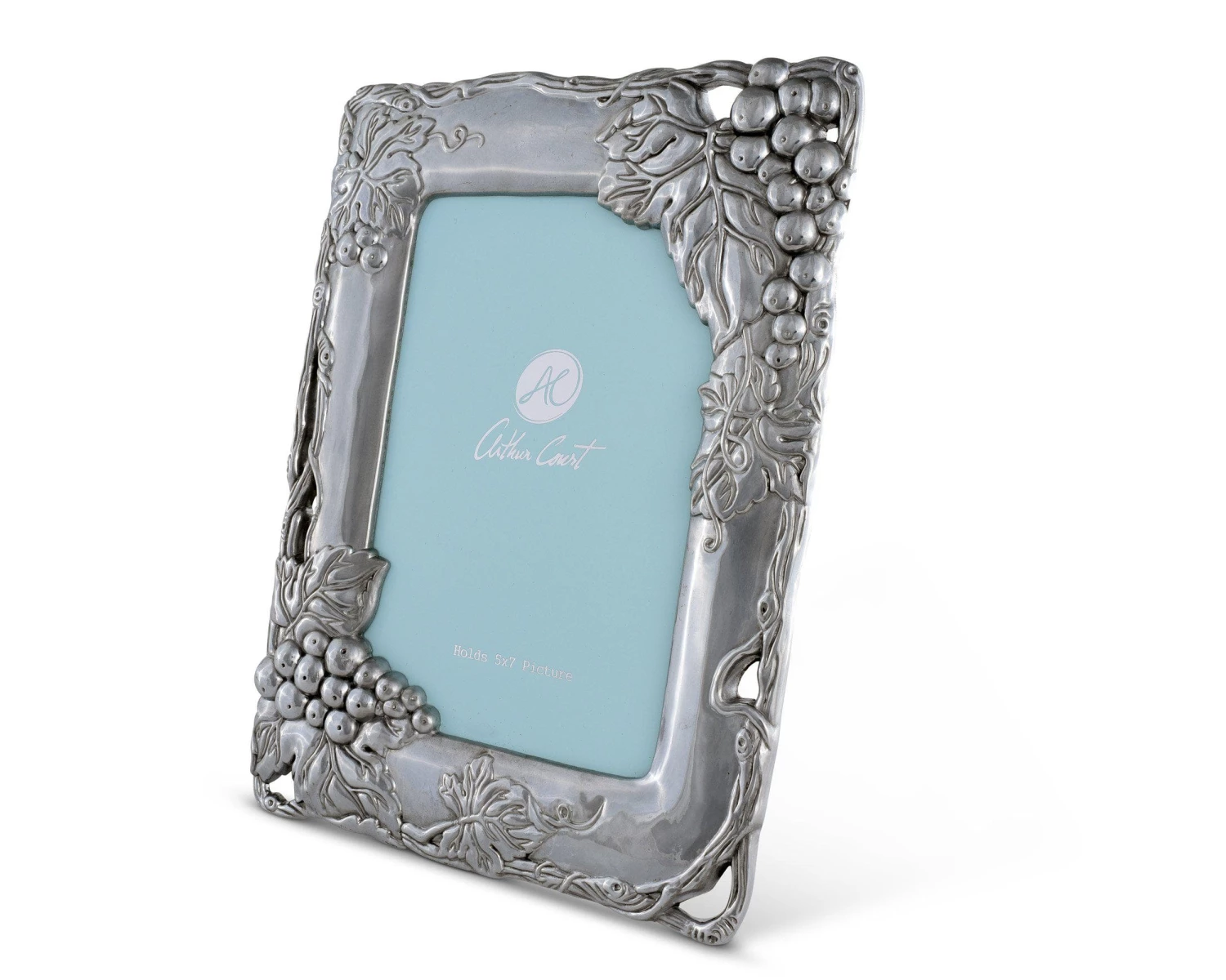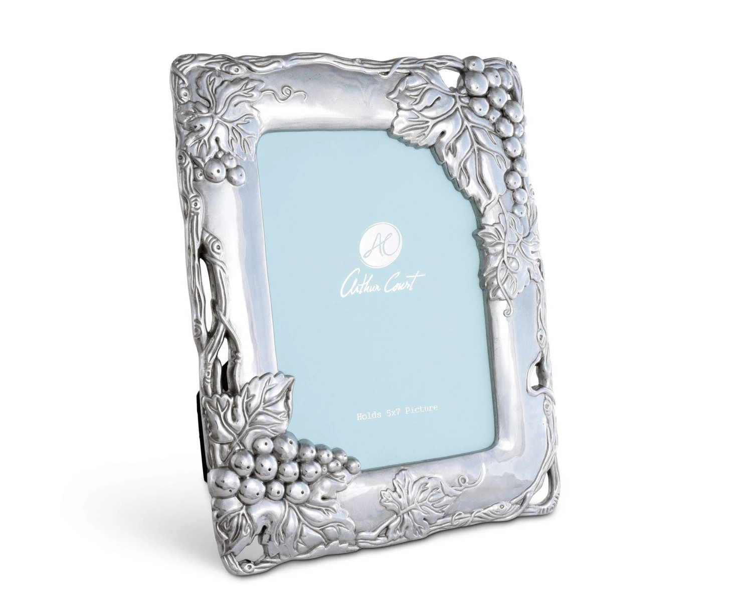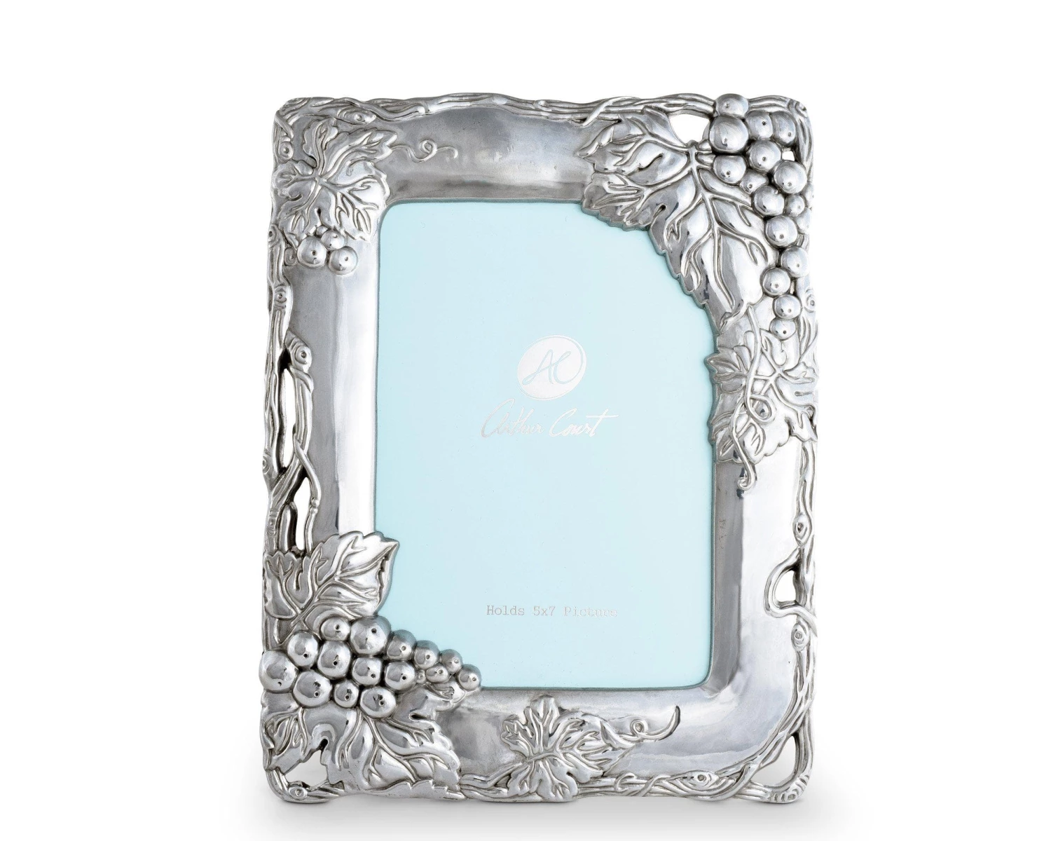 Create a Tuscan-inspired ambiance with this Arthur Court grape photo frame featuring thick borders replete with vines, leaves and fruit. The buffed-to-perfection lustrous silver finish imparts a sense of luxury to this timeless piece, helping your favorite photos take center stage within its neutral-hued borders. Rely on this 5 x 7-inch frame’s hand-polished sand-cast aluminum alloy construction for long-term durability, and it doesn’t tarnish, ensuring it retains its classic beauty year after year. Small gaps in the overall design infuse your table displays with depth and dimension and help the frame’s contents stand out even more. Use this chic frame to showcase wedding or family photos in your entryway, or take advantage of the attractive gift box by presenting it to friends and family when celebrating a special occasion or event. Maintenance of this frame requires only a quick wipe-down with a damp cloth for extra convenience.