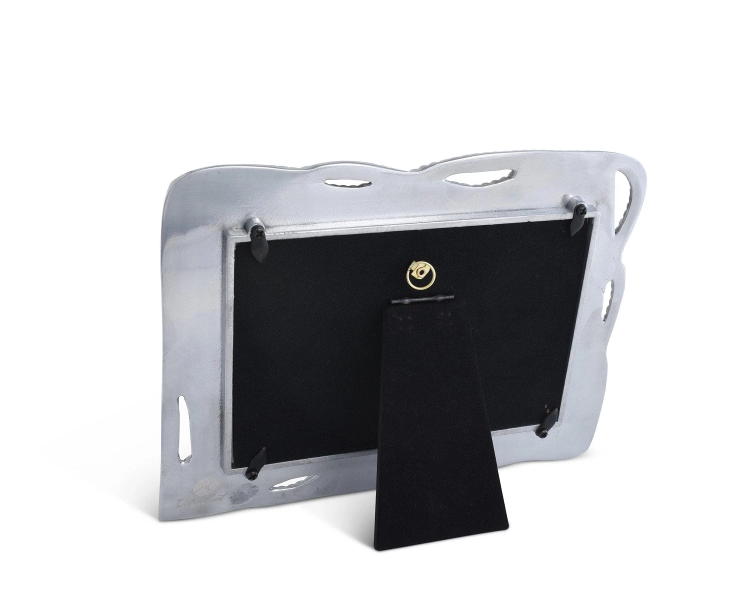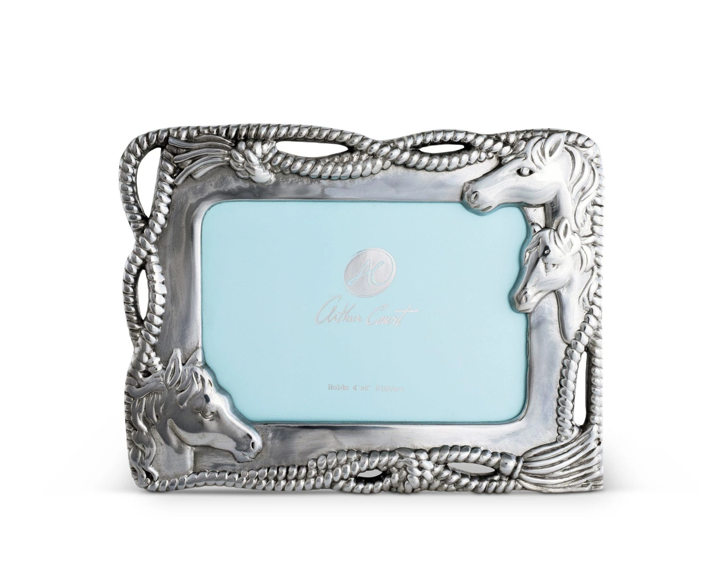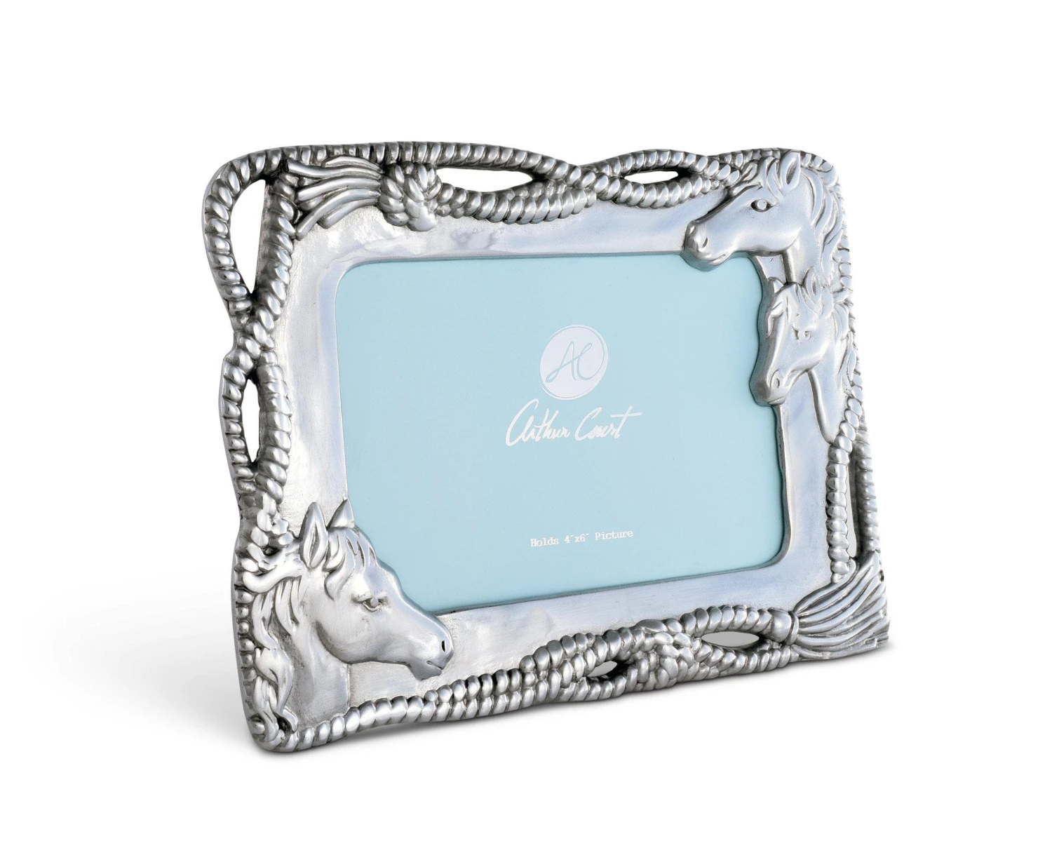Show off your favorite photos in style when you place them in this 4 x 6-inch horse photo frame from Arthur Court. The horse heads placed asymmetrically at the top right and lower left corners of the frame provide a sense of balance, and the frayed ropes that intertwine around the frame’s openwork border convey the theme clearly to anyone who loves all things equestrian. This aluminum frame is easy to care for, with only simple dusting required, and it won’t tarnish over time. Use the gift box it comes in to give it as a present to any horse-loving friend, or display photos of your own favorite people and horses in it at your home or ranch. This shiny frame never needs polishing, and you can either set it on a credenza or bookshelf for display or hang it on the wall so everyone can enjoy it.
