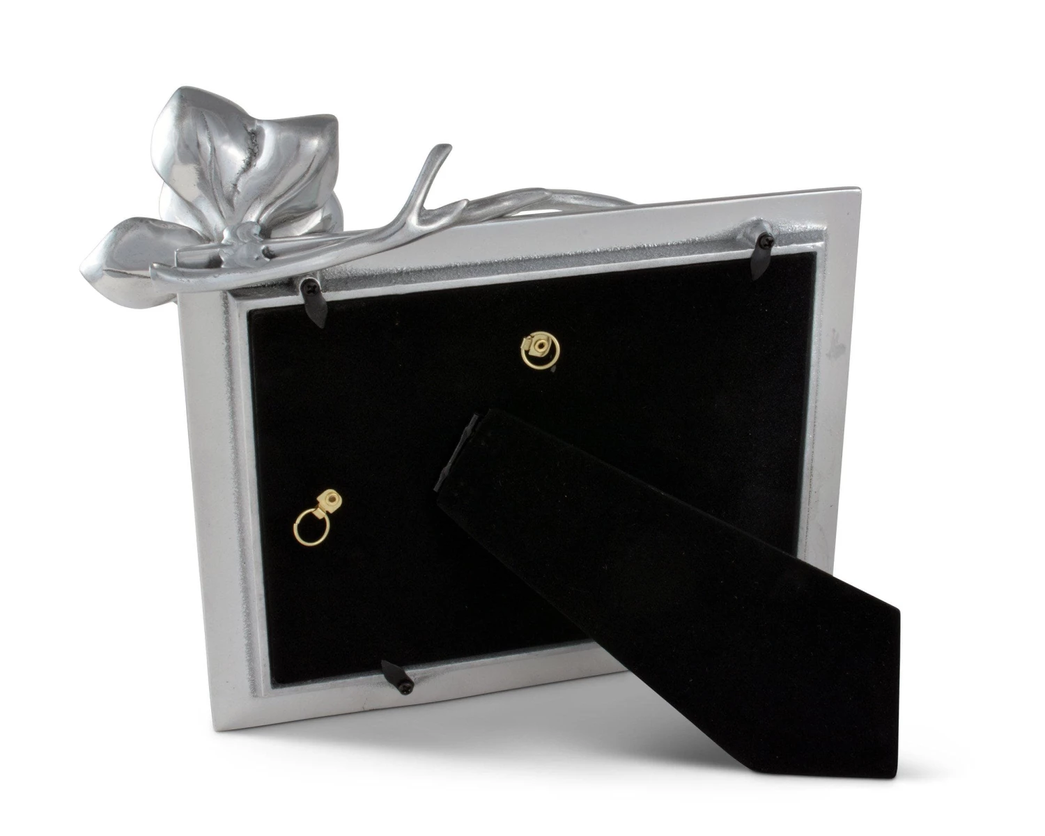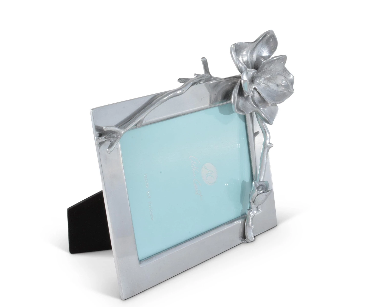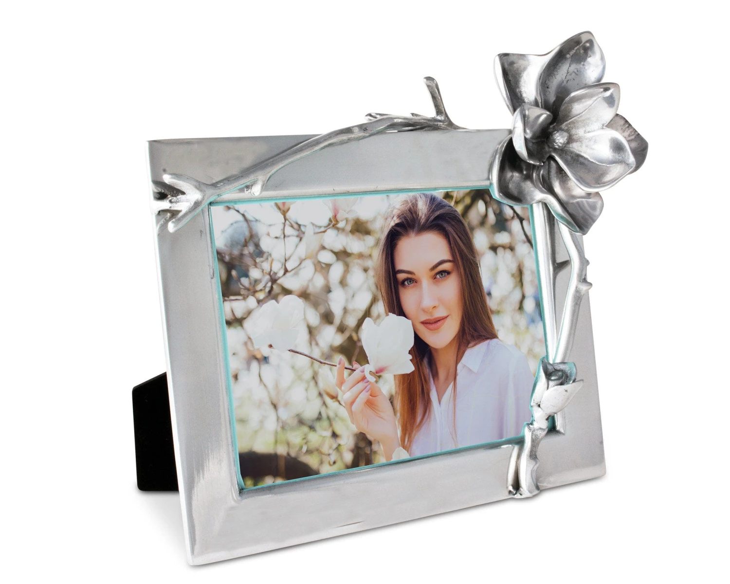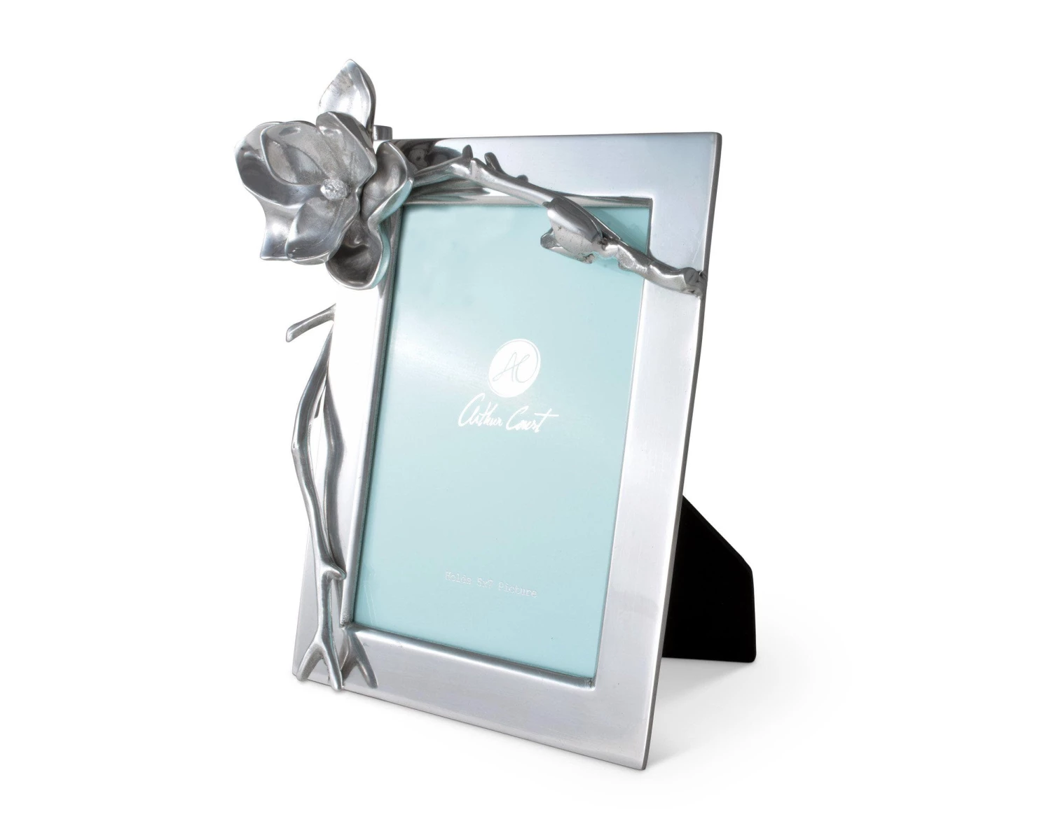 Place a cherished photograph in this Arthur Court picture frame that’s delightfully accented with magnolia blossoms. This gleaming, handcrafted frame is constructed of hand-polished aluminum alloy, which has been buffed to a high shine and never requires polishing. Simply dust this frame with a dampened cloth to clean it, and never worry about it becoming tarnished. Beautifully designed magnolias adorn this 4 x 6-inch frame, and a large, open flower with intricately detailed petals graces the top left side, creating a fresh and lifelike border for your favorite photo. Two nascent magnolia blossoms, set on realistic-looking branches, sit along the side and bottom of the frame. Present this magnolia blossom picture frame in its included gift box for a wedding or bridal shower gift to be treasured for years.