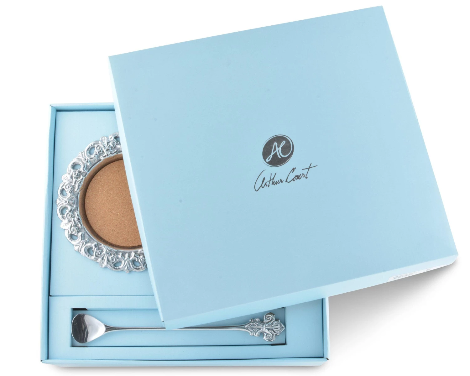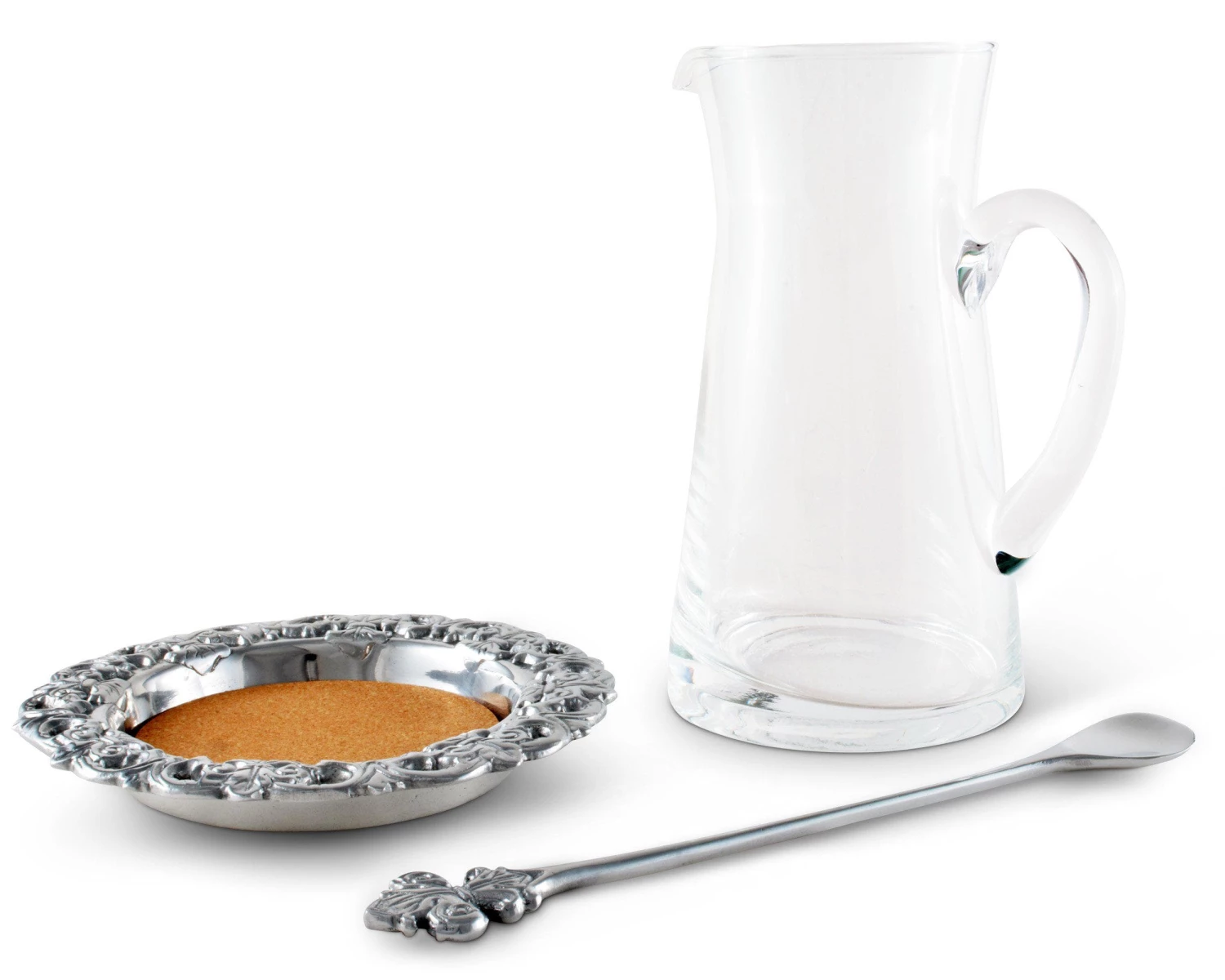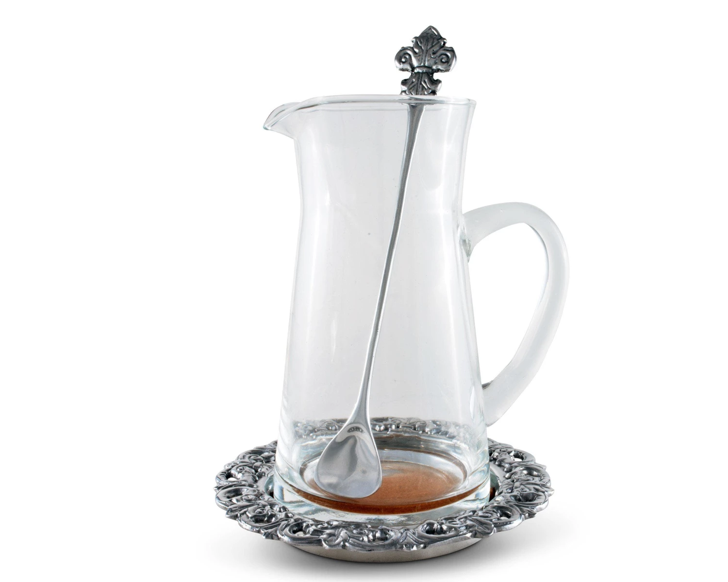 Lend regal French style to your entertainment space by adding this three-piece fleur-de-lis pitcher set by Arthur Court. The clear glass pitcher boasts a simple yet elegant design that complements the ornate beauty of the other silver-tone aluminum pieces, and the 8.5 x 4.5-inch sizing works well when you’re mixing single drinks. Place the pitcher on high-end tables worry-free thanks to the intricately detailed circular coaster base, which has a removable cork lining to easily absorb moisture. Use the 7-inch fleur-de-lis-topped stirring ladle to mix your cocktails well, then rely on the delicate spout of the pitcher to direct the liquid into your waiting glass. When your gathering ends, pop the pitcher in the dishwasher for easy cleaning and hand wash the aluminum pieces and dry them immediately to keep them looking their best. This fleur-de-lis pitcher set comes in an attractive gift box, making it a nice present for weddings or anniversaries.