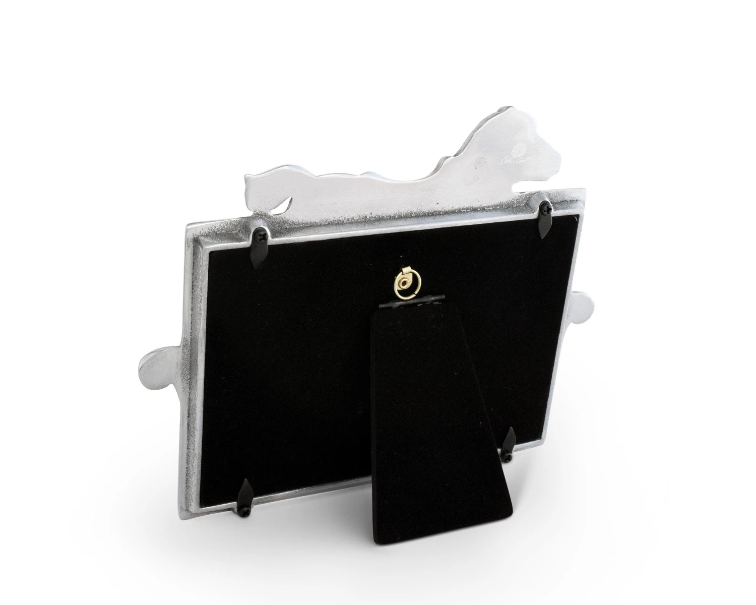 A galloping horse extends off the top of this frame as its outstretched legs and underbelly form around the picture slot. The rocker curves along the bottom edge of this handmade, aluminum piece before reaching up to touch the animal’s hooves on each side.
