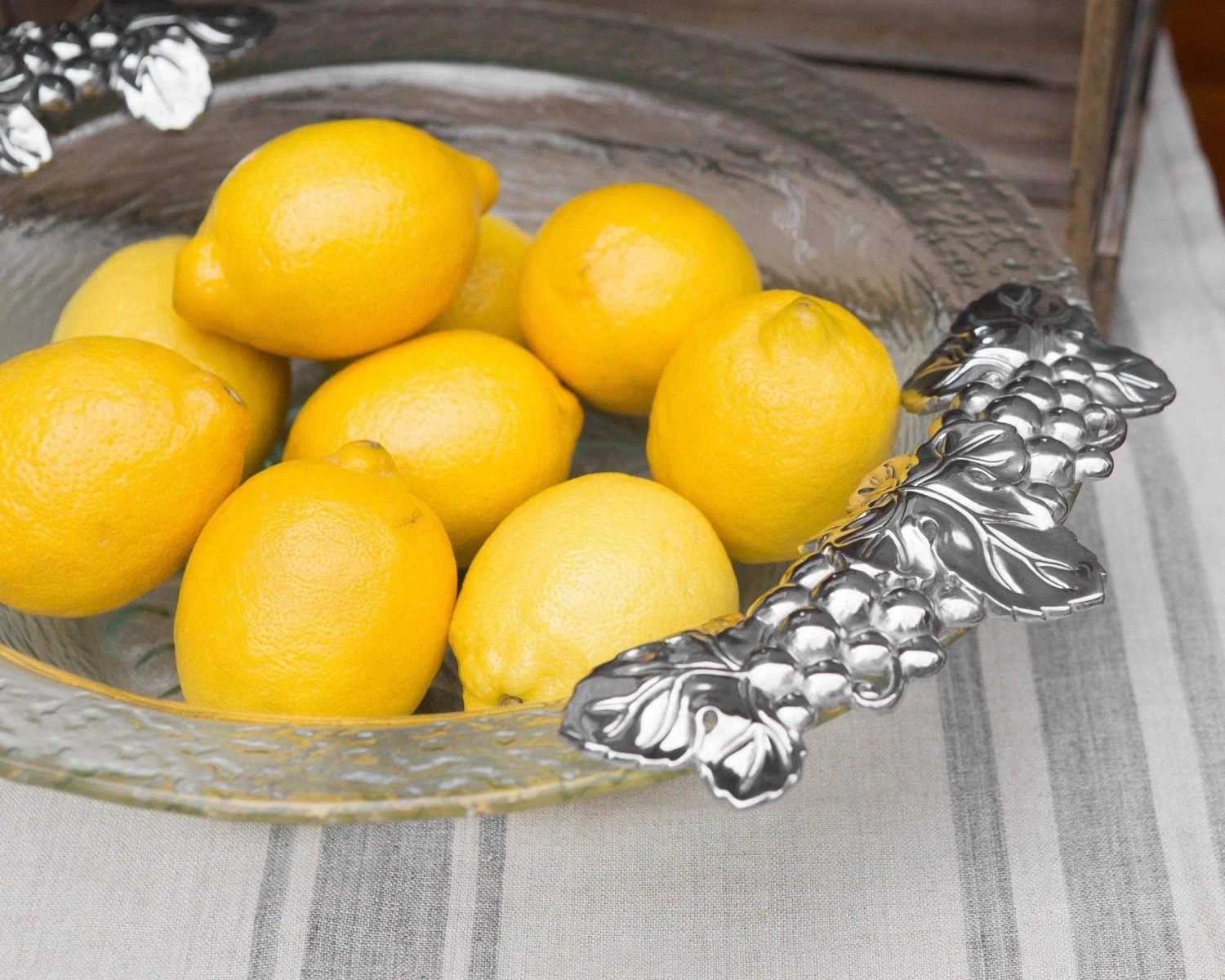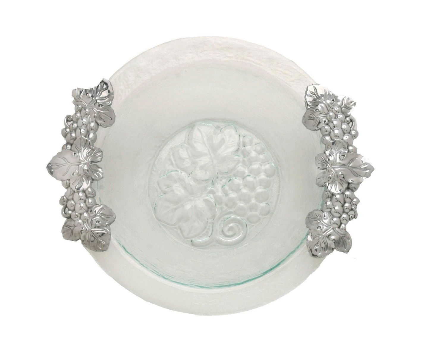 Intricate grape motifs display in beautiful symmetry on opposite ends of this piece, while a similar design appears in the center of the glass. Handmade in sand-cast aluminum, the fruit, leaves and vines show incredible definition within their realistic features.