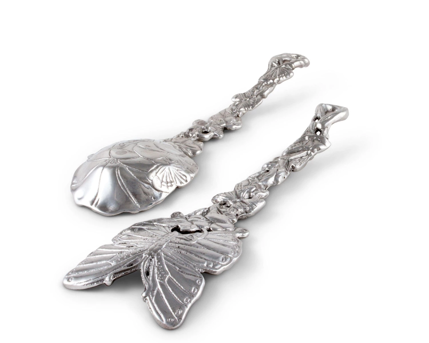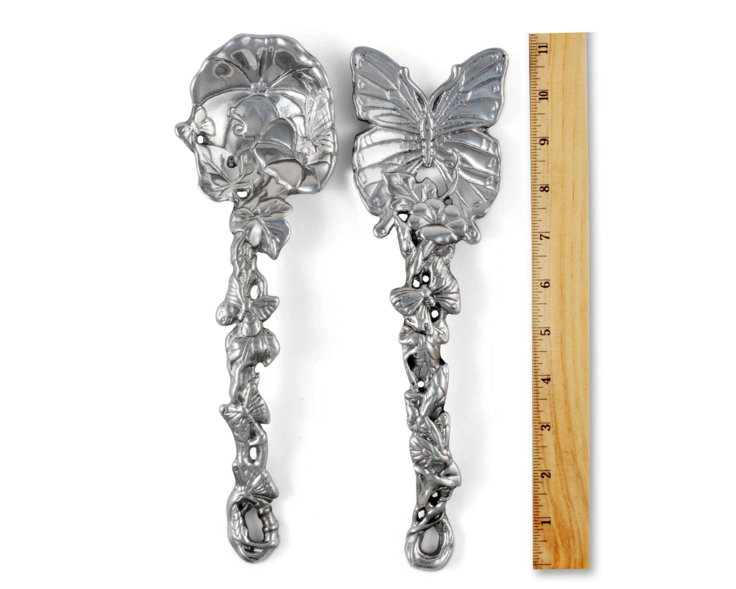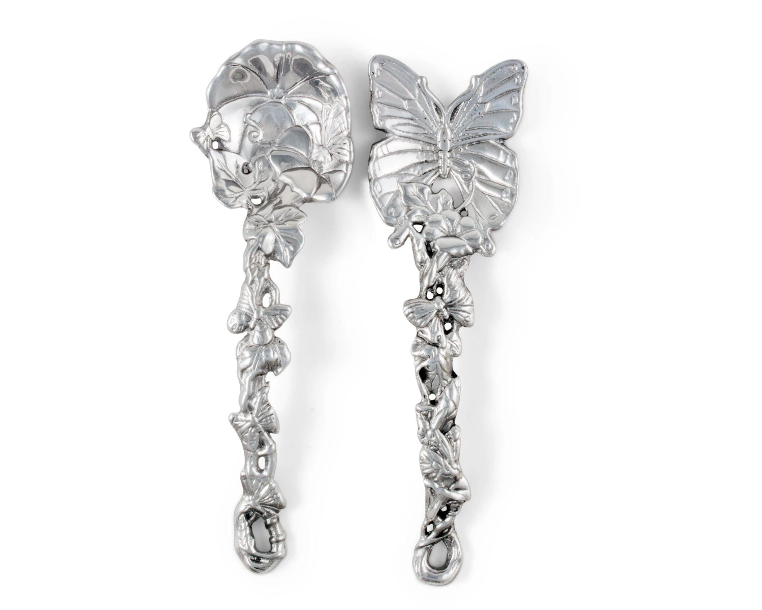 Small butterflies weave around the viny support of both handles and up the neck of each piece. Another beautiful insect forms a two-pronged head with its wings at the top of one server, while the other features full flowers and veiny leaves. The skill of Arthur Court’s craftsmen is on full display in this handmade, aluminum set.