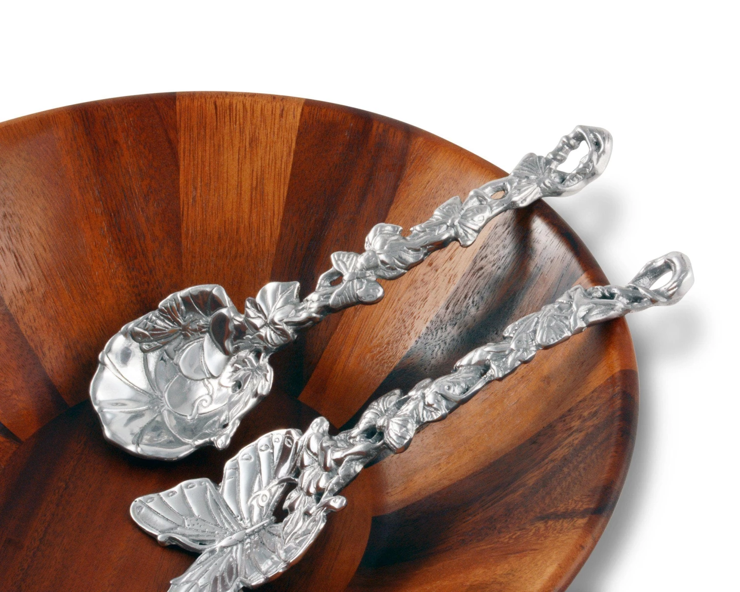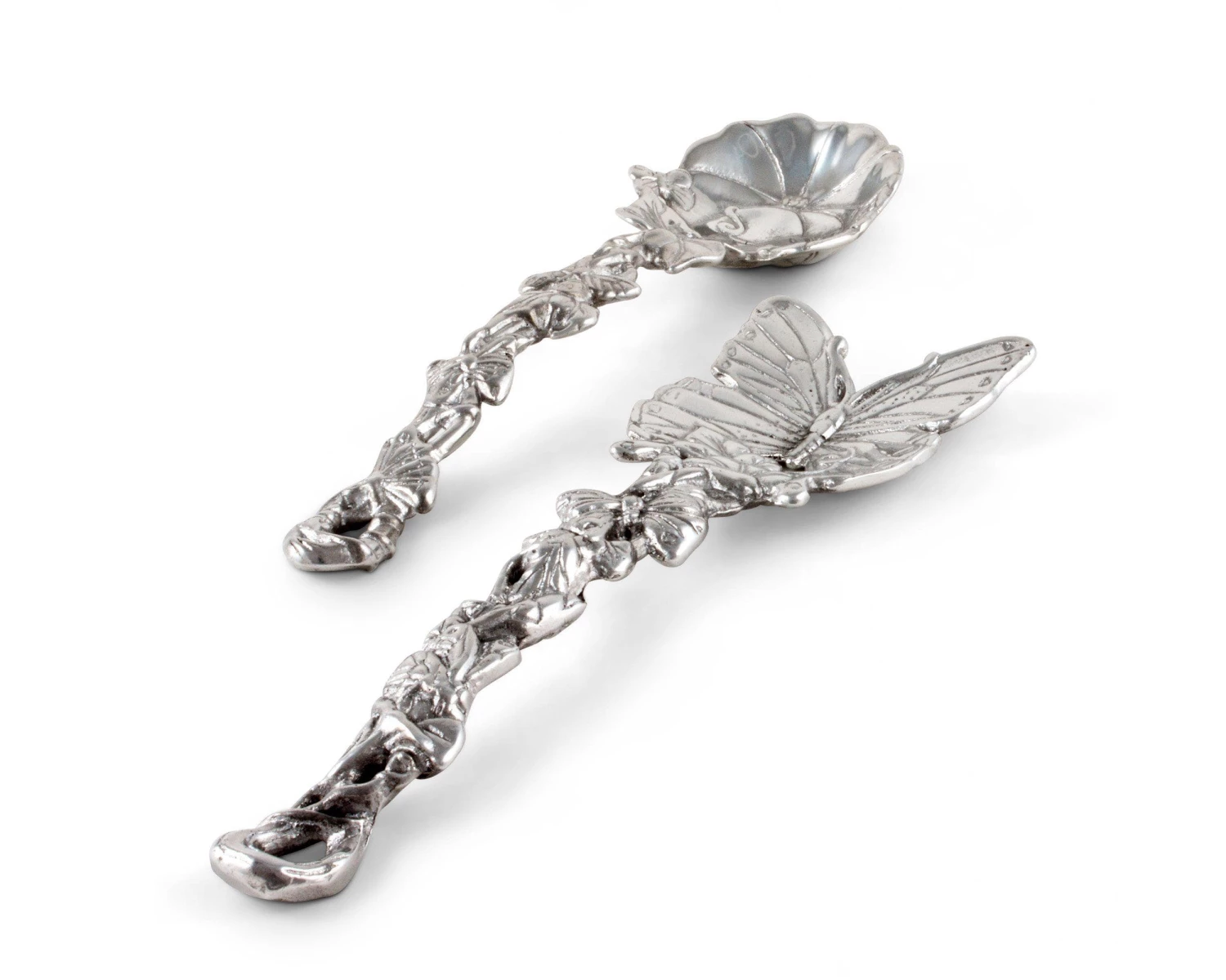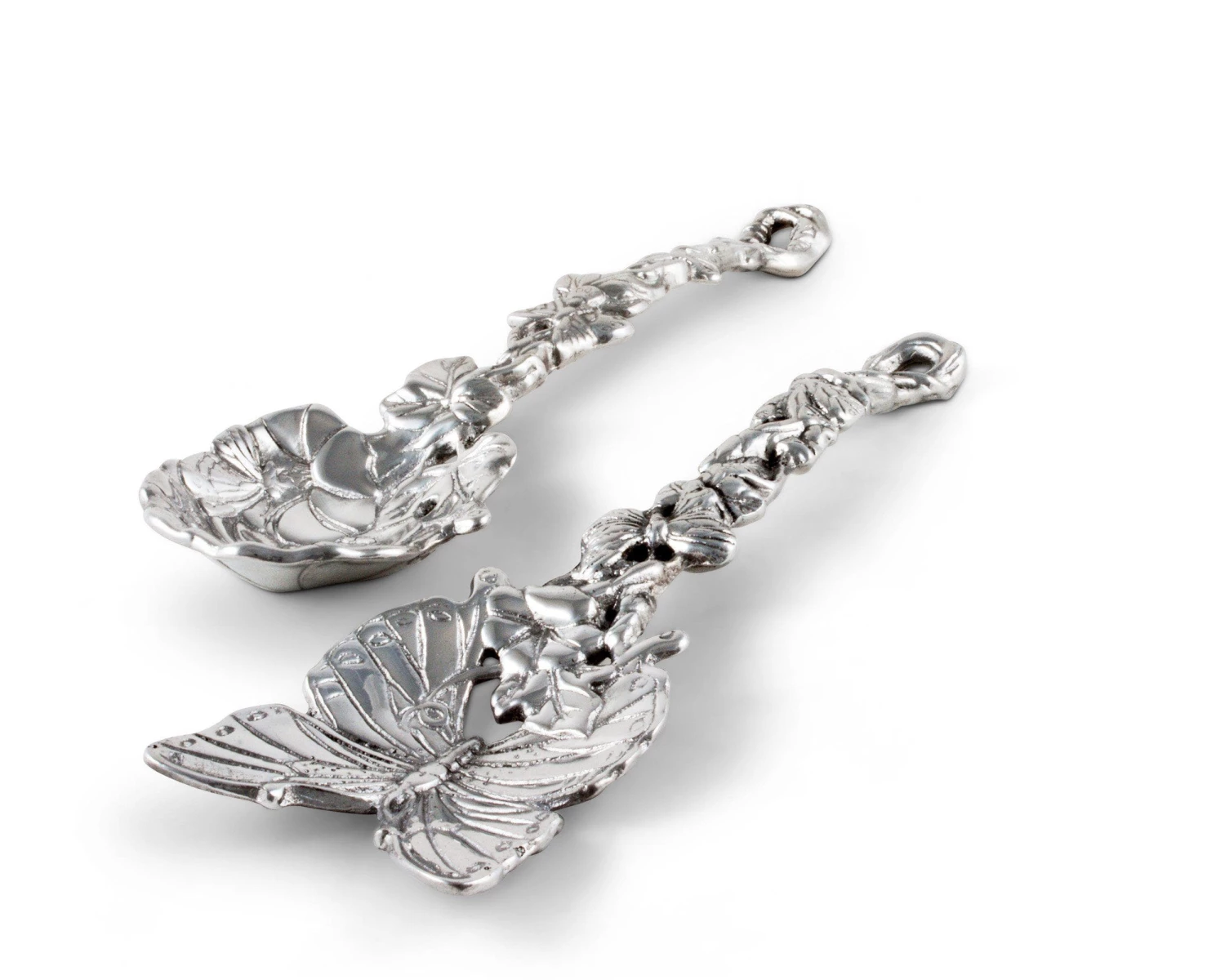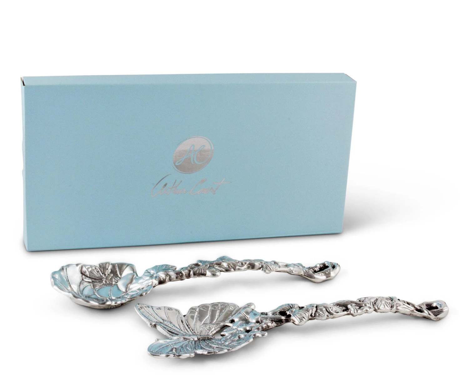 Small butterflies weave around the viny support of both handles and up the neck of each piece. Another beautiful insect forms a two-pronged head with its wings at the top of one server, while the other features full flowers and veiny leaves. The skill of Arthur Court’s craftsmen is on full display in this handmade, aluminum set.