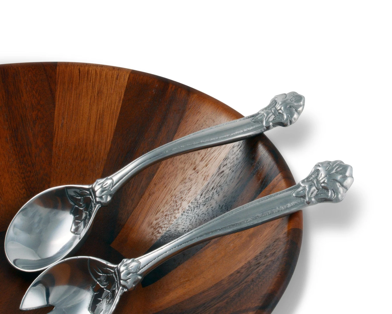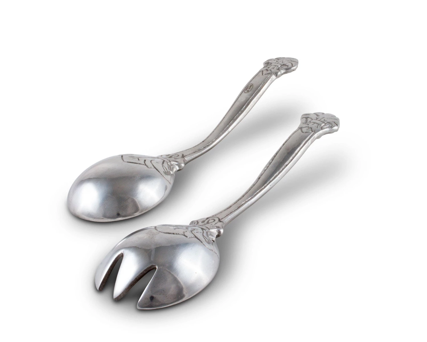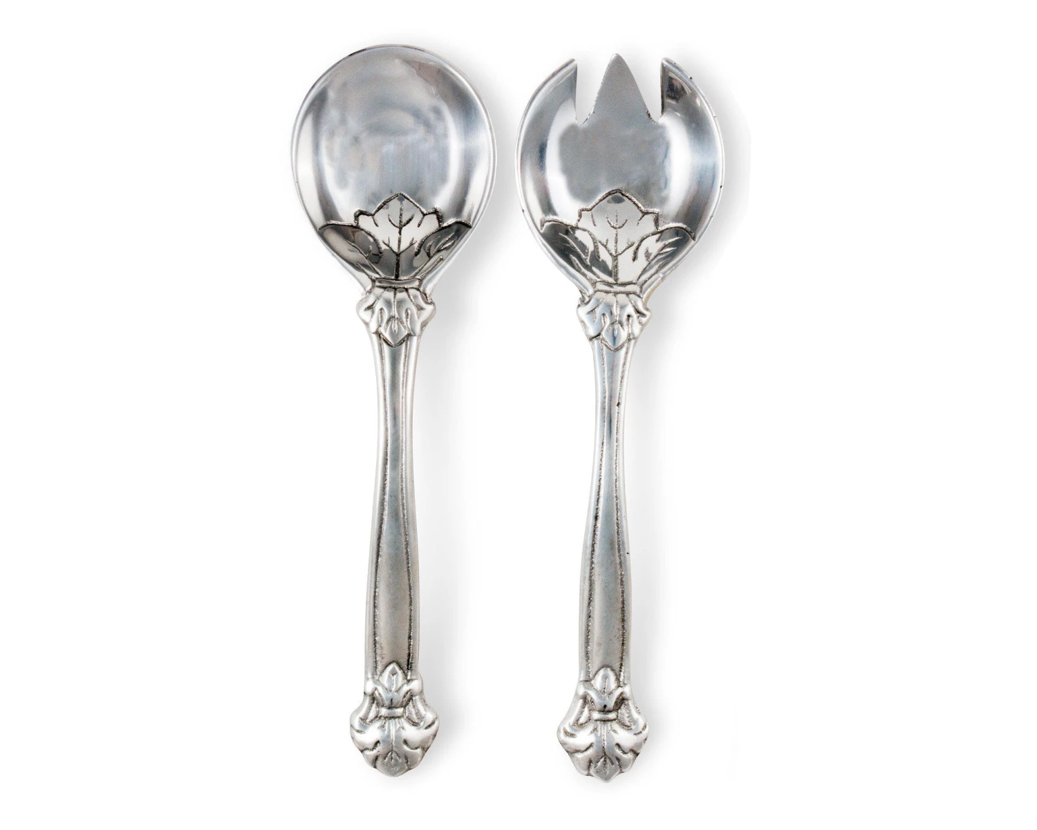Extending into the bowl from the neck, fleur-de-lis symbols decorate the fork and spoon with their fine lines and incredible detail. The handles curve slightly as they move down towards another emblem at the end of each handmade, aluminum piece.