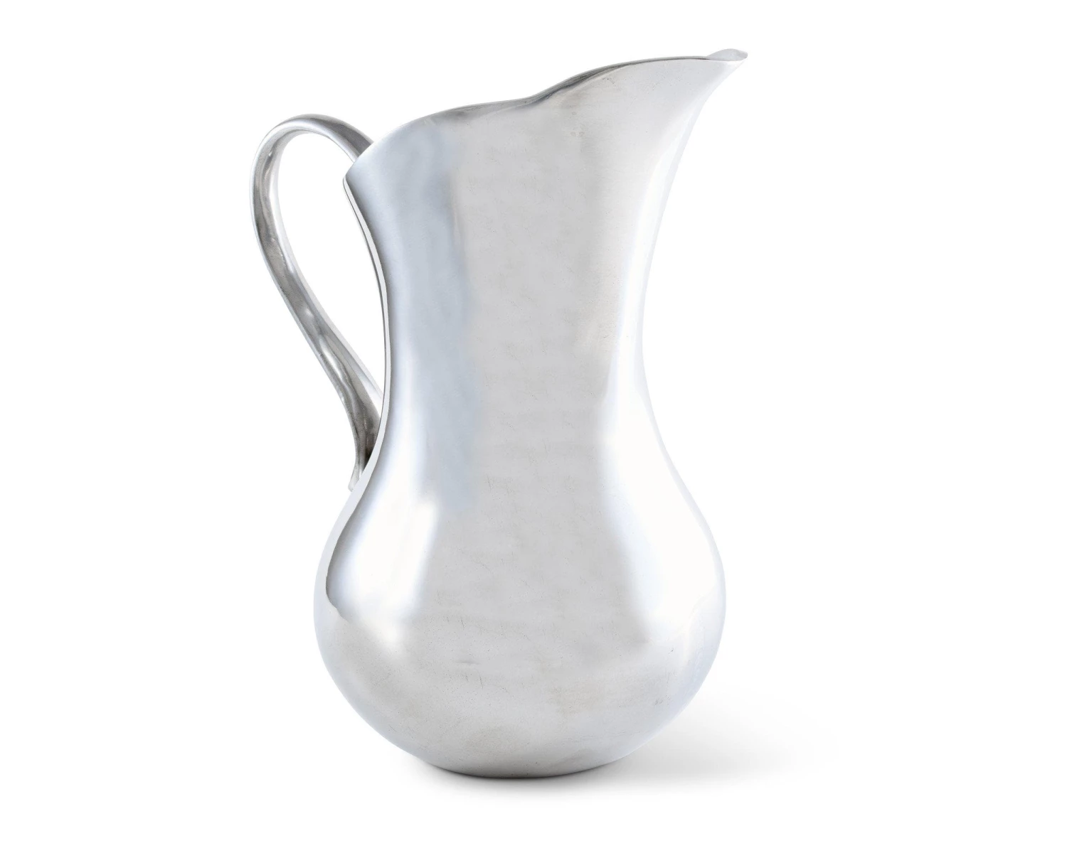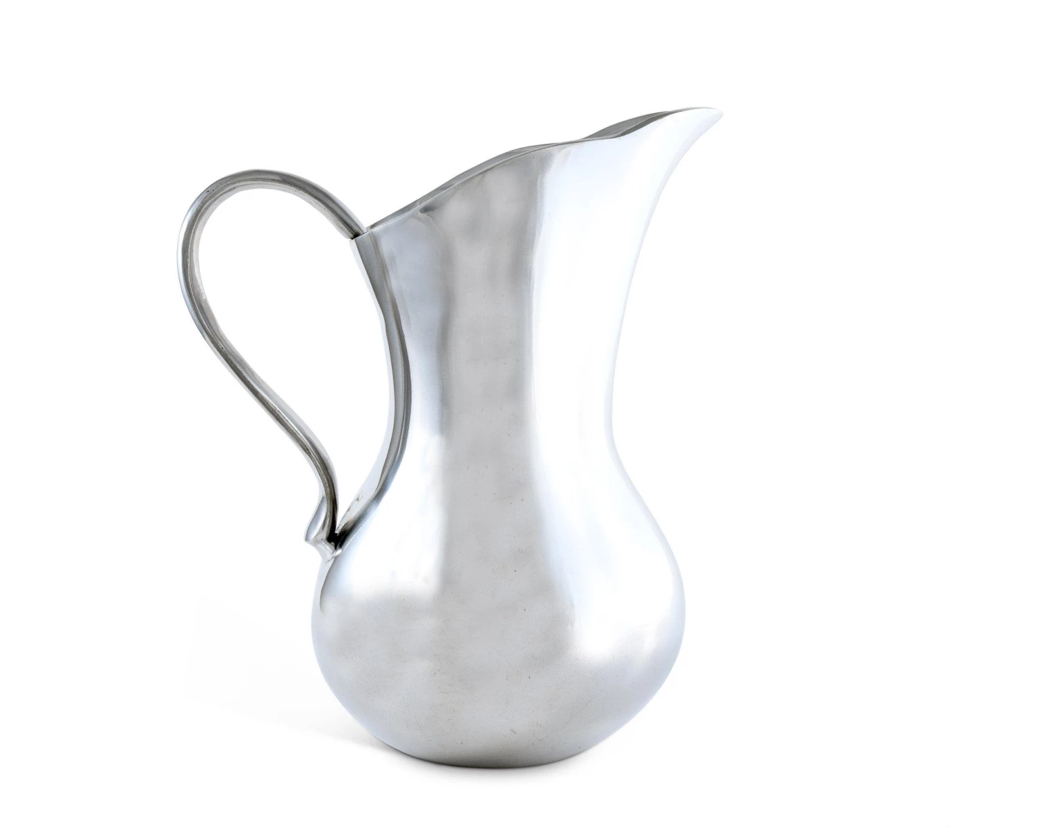 Cast in a traditional shape, this piece features a rounded base, curved handle and extended spout for easy pouring. The handmade, aluminum pitcher radiates a brilliant luster off of its unblemished surface.