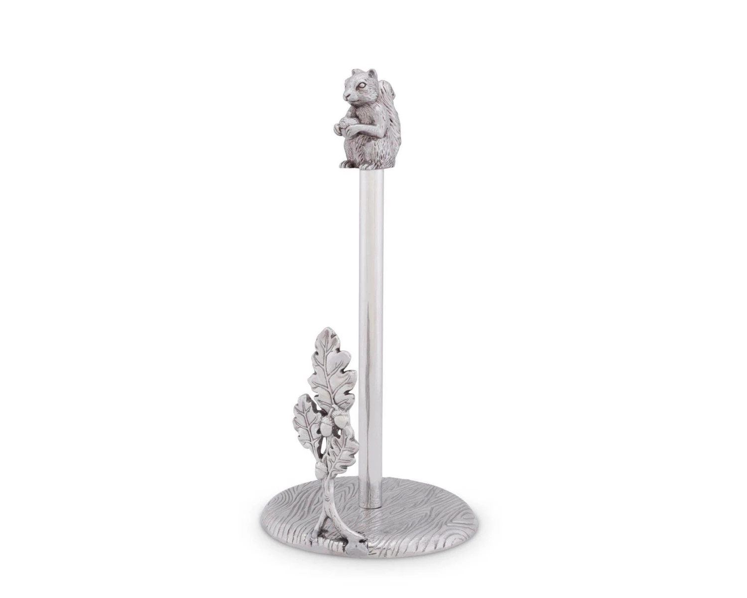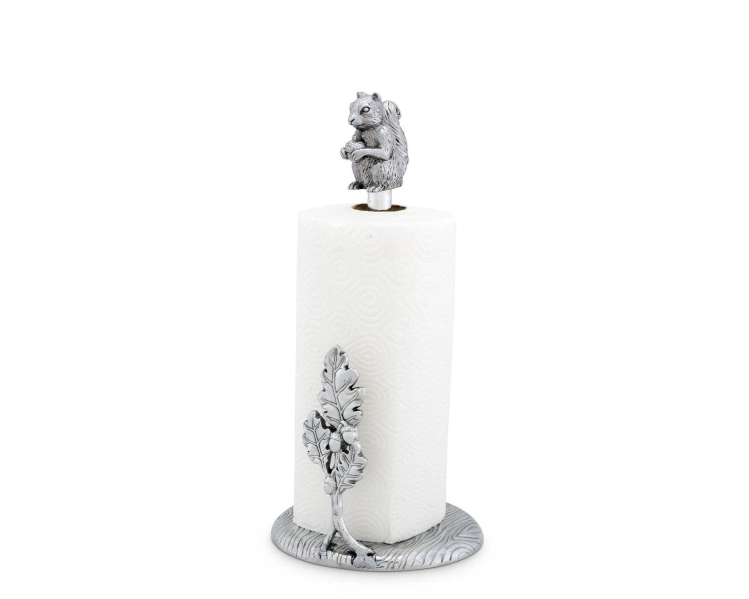 A whimsical, detailed squirrel finial perches atop Arthur Court’s 15 inch tall kitchen paper towel holder. The hand-crafted figural squirrel looks down an acorn treasure he is holding, probably plucked from the acorn laden oak branch functioning as the rip stop of the holder. A fun and fabulous kitchen paper towel holder for your kitchen or to give as a gift, it holds a standard size roll of paper towels.