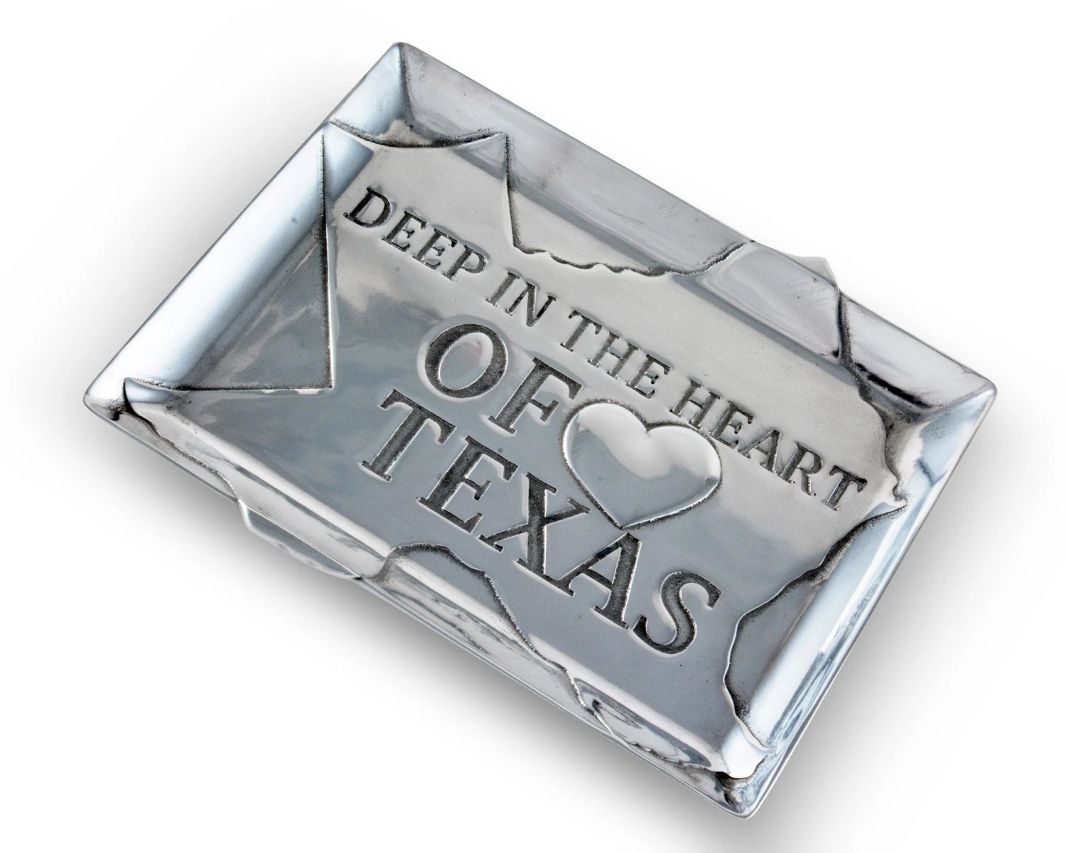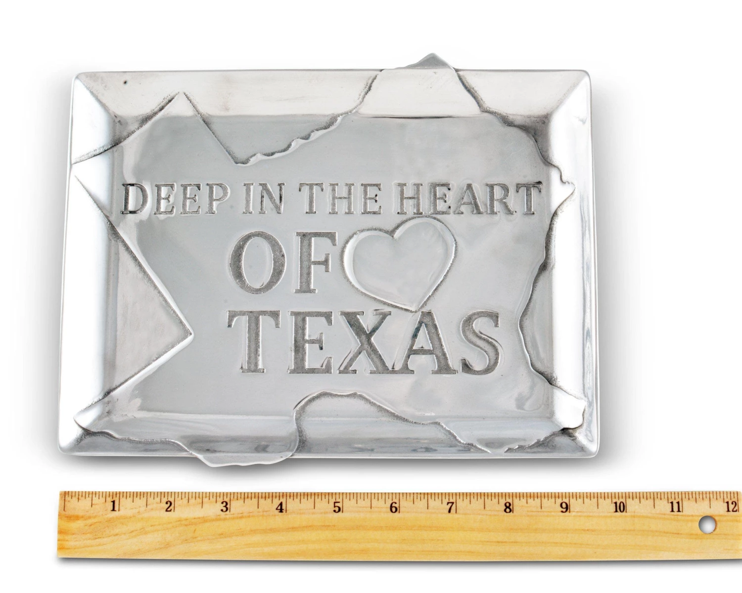 The state’s outline covers much of the dish, while two of its edges even extend over the sides of this handmade, aluminum tray. Within the lines, ‘Deep in the heart of Texas’ displays in bold, capital letters, along with a heart.