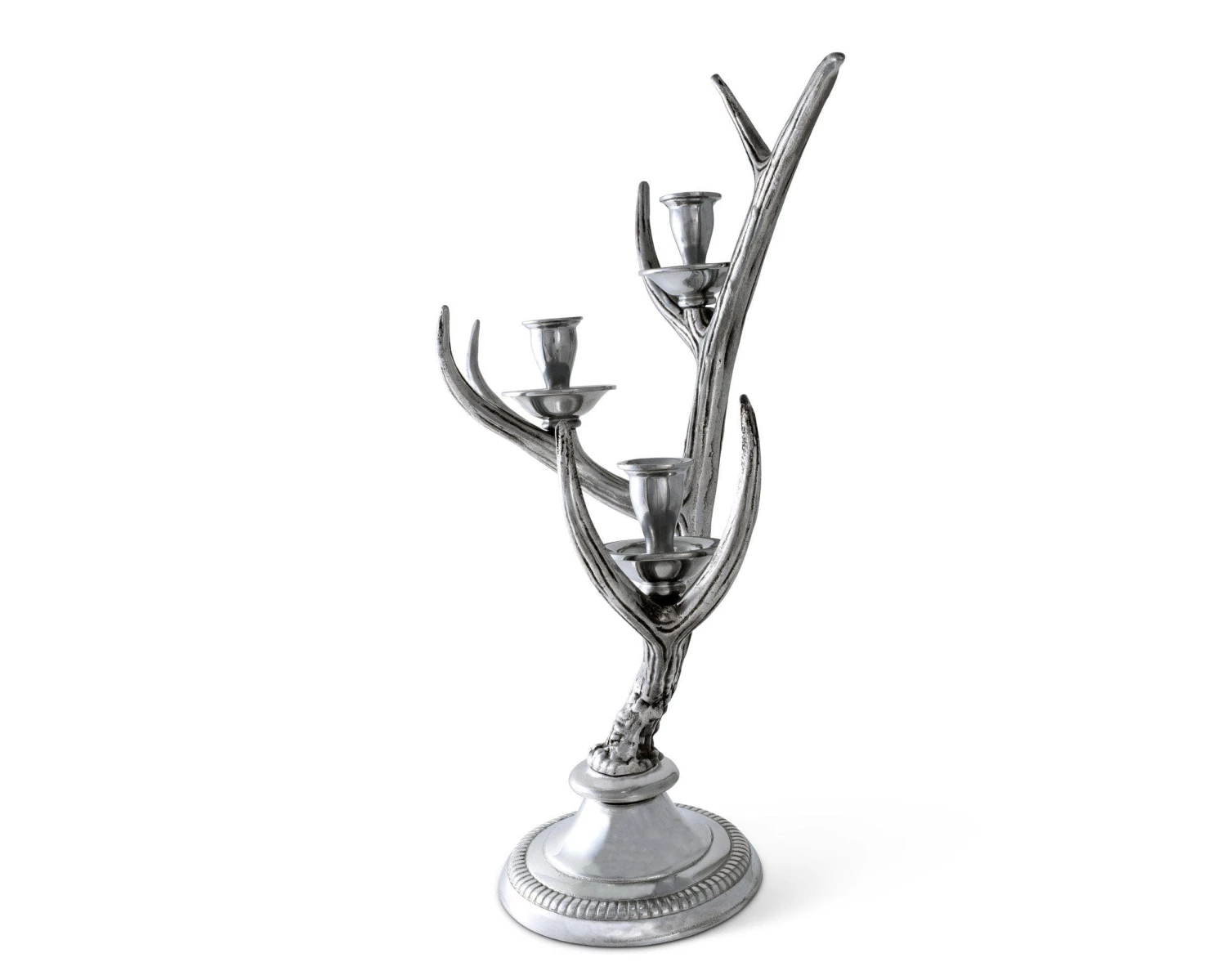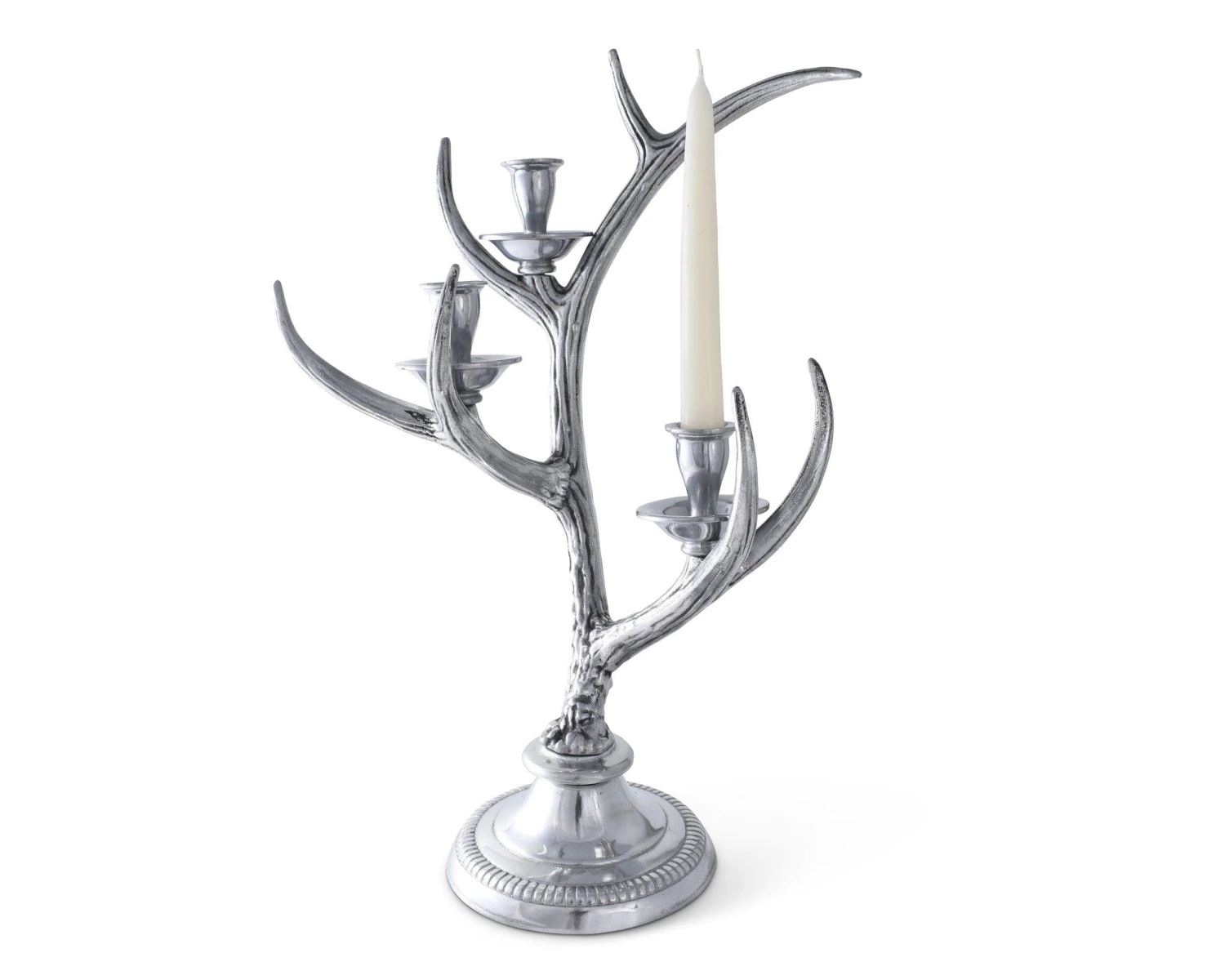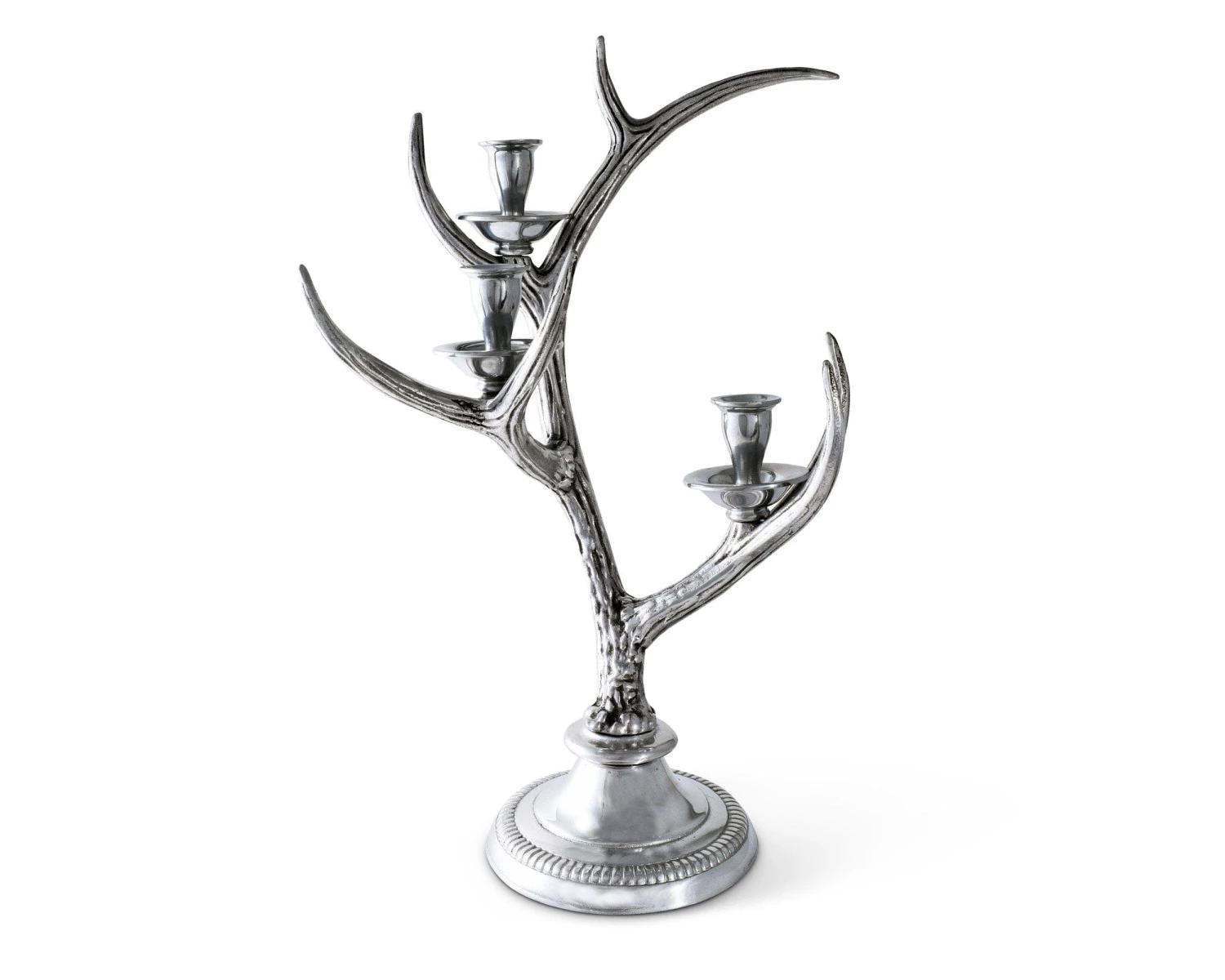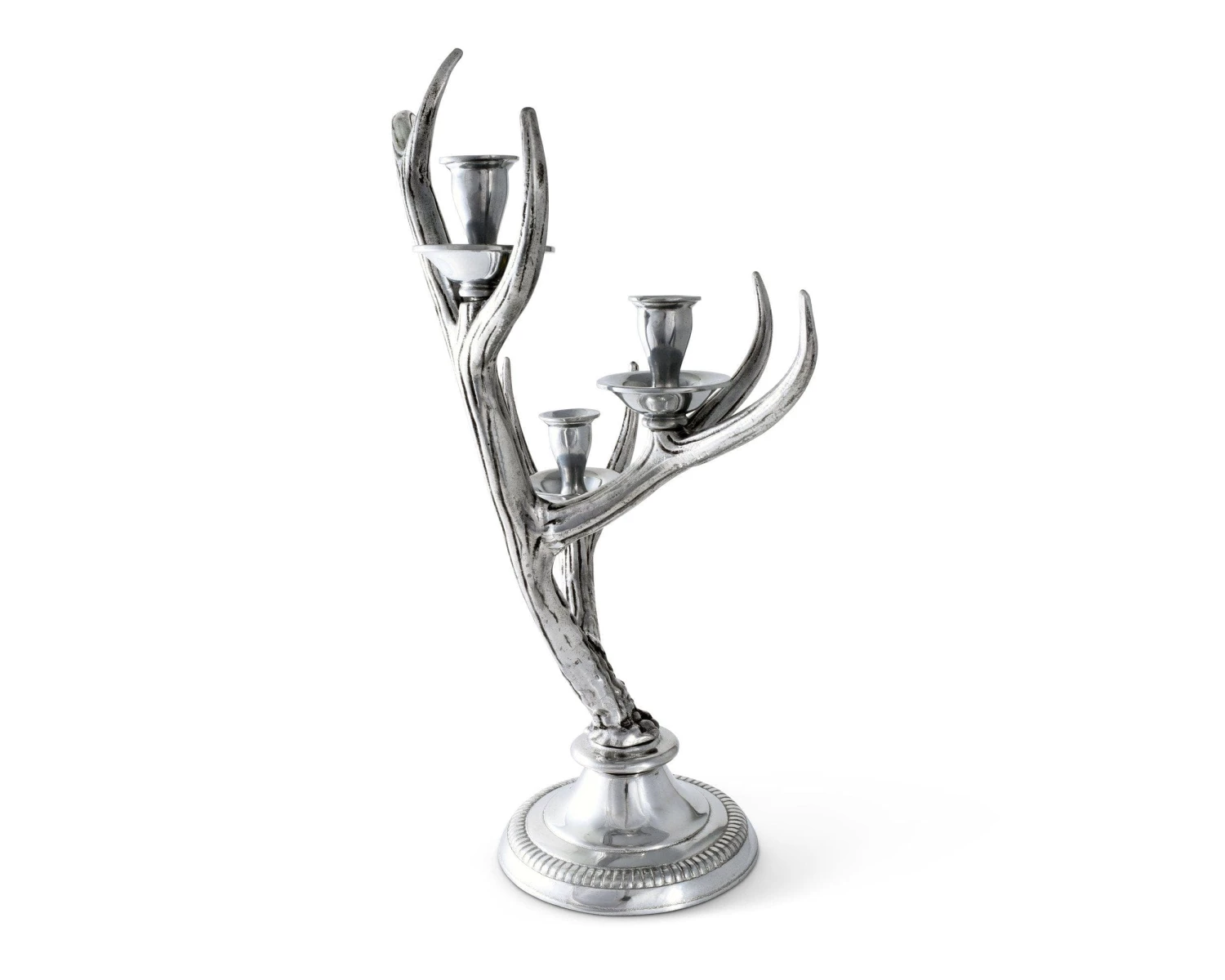 Handcrafted in Arthur Court’s signature aluminum, this design features antlers emerging up from a circular base as they balance on their burr. Multiple forks branch off the main stem, while the candle holders take the place of other points. The realistic definiton within the antlers stands out against the lustrous holders and stand.
