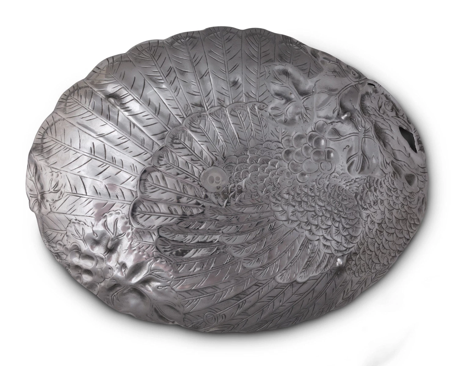 Exceptionally defined grapes and greenery adorn both sides of this handmade, aluminum tray, while intricate feathers fan out around them in beautiful arrangements of detail.