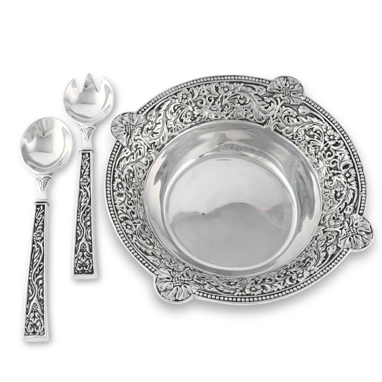 The 11.75-inch diameter bowl provides plenty of room for creative salad mixes, and the set comes with a matched serving spoon and fork. Four decorative feet on the aluminum serving bowl provide stability and extra sophistication.